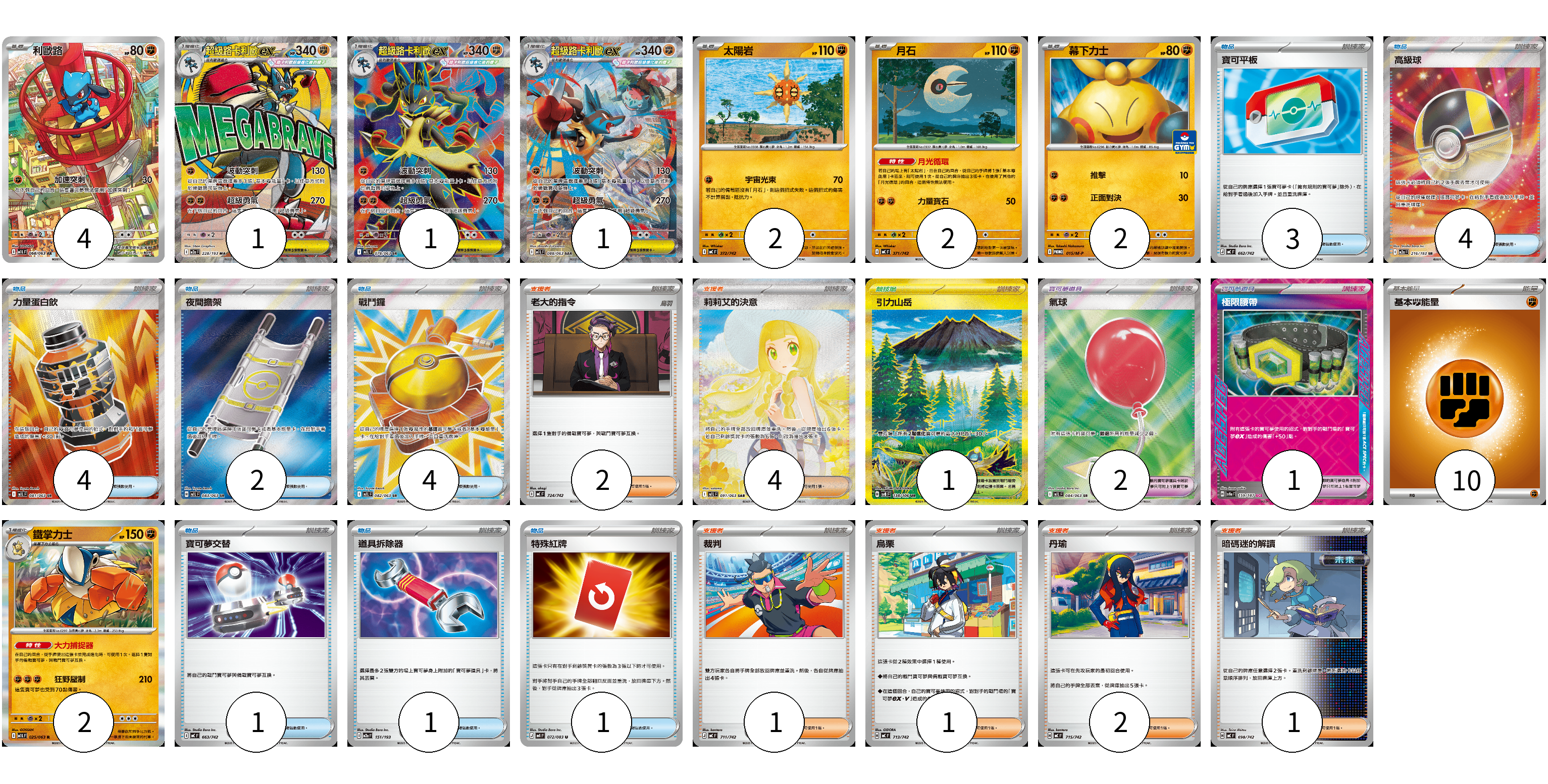 牌組構築方案 以此牌組為基礎新構築牌組 顯示卡面 顯示列表 寶可夢卡(15) 4 1 1 1 2 2 2 2 寶可夢道具(3) 2 1 物品卡(20) 3 4 4 2 4 1 1 1 支援者卡(11) 2 4 1 1 2 1 競技場卡(1) 1 能量卡(10) 10 寶可夢卡(15) 卡牌名稱 張數 卡牌名稱 張數 利歐路 M1L 068/063 04 超級路卡利歐ex M2a 228/193 01 超級路卡利歐ex M1L 078/063 01 超級路卡利歐ex M1L 088/063 01 太陽岩 MC 372/742 02 月石 MC 371/742 02 幕下力士 M-P 015/M-P 02 鐵掌力士 M1L 025/063 02 寶可夢道具(3) 卡牌名稱 張數 卡牌名稱 張數 氣球 M1L 084/063 02 極限腰帶 SV8a 159/187 01 物品卡(20) 卡牌名稱 張數 卡牌名稱 張數 寶可平板 MC 662/742 03 高級球 M2a 216/193 04 力量蛋白飲 M1L 081/063 04 夜間擔架 M1L 083/063 02 戰鬥鑼 M1L 082/063 04 寶可夢交替 MC 663/742 01 道具拆除器 M2a 151/193 01 特殊紅牌 M4 072/083 01 支援者卡(11) 卡牌名稱 張數 卡牌名稱 張數 老大的指令 MC 724/742 02 莉莉艾的決意 M1L 091/063 04 裁判 MC 711/742 01 烏栗 MC 713/742 01 丹瑜 MC 715/742 02 暗碼迷的解讀 MC 698/742 01 競技場卡(1) 卡牌名稱 張數 卡牌名稱 張數 引力山岳 SV8 138/106 01 能量卡(10) 卡牌名稱 張數 卡牌名稱 張數 基本【鬥】能量 MC FIG 10 以此牌組為基礎新構築牌組 牌組編碼 jZVrCr-kmRrpq-hSJbvR copy 列印牌組單 牌組編碼已複製 分享至SNS