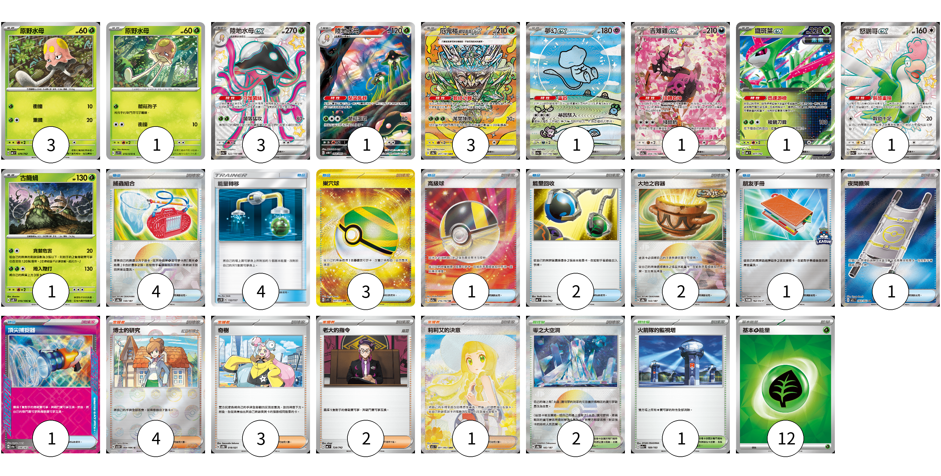 牌組構築方案 以此牌組為基礎新構築牌組 顯示卡面 顯示列表 寶可夢卡(16) 3 1 3 1 3 1 1 1 1 1 物品卡(19) 4 4 3 1 2 2 1 1 1 支援者卡(10) 4 3 2 1 競技場卡(3) 2 1 能量卡(12) 12 寶可夢卡(16) 卡牌名稱 張數 卡牌名稱 張數 原野水母 MC 074/742 03 原野水母 SV1V 010/078 01 陸地水母ex SV4a 322/190 03 陸地水母 SV4M 068/066 01 厄鬼椪 碧草面具ex SV8a 201/187 03 夢幻ex SV4a 347/190 01 吉雉雞ex M2a 244/193 01 鐵斑葉ex MC 077/742 01 怒鸚哥ex SV4a 337/190 01 古簡蝸 SV8 010/106 01 物品卡(19) 卡牌名稱 張數 卡牌名稱 張數 捕蟲組合 SV8a 150/187 04 能量轉移 AC1D 132/157 04 巢穴球 SV1S 107/078 03 高級球 M2a 216/193 01 能量回收 MC 636/742 02 大地之容器 SV8a 143/187 02 朋友手冊 SV-P 182/SV-P 01 夜間擔架 M1L 083/063 01 頂尖捕捉器 SV8a 148/187 01 支援者卡(10) 卡牌名稱 張數 卡牌名稱 張數 博士的研究 SV11B 084/086 04 奇樹 SVOM 018/021 03 老大的指令 MC 724/742 02 莉莉艾的決意 M1L 091/063 01 競技場卡(3) 卡牌名稱 張數 卡牌名稱 張數 零之大空洞 SV8a 182/187 02 火箭隊的監視塔 M2a 189/193 01 能量卡(12) 卡牌名稱 張數 卡牌名稱 張數 基本【草】能量 SVK GRA 12 以此牌組為基礎新構築牌組 牌組編碼 jaPjdQ-atSQvj-pEeCIa copy 列印牌組單 牌組編碼已複製 分享至SNS