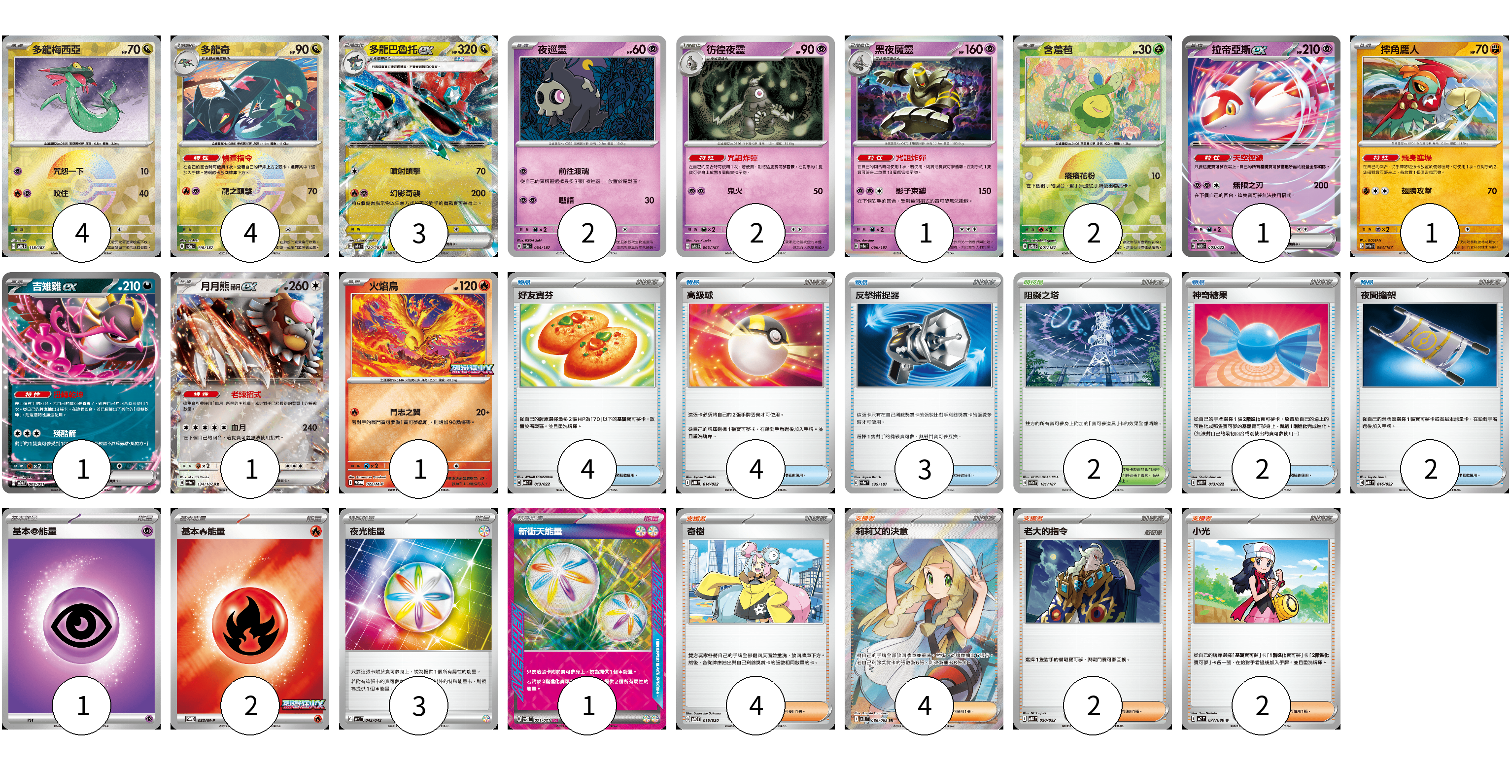 牌組構築方案 以此牌組為基礎新構築牌組 顯示卡面 顯示列表 寶可夢卡(23) 4 4 3 2 2 1 2 1 1 1 1 1 物品卡(15) 4 4 3 2 2 支援者卡(12) 4 4 2 2 競技場卡(2) 2 能量卡(7) 1 2 3 1 寶可夢卡(23) 卡牌名稱 張數 卡牌名稱 張數 多龍梅西亞 SV8a 118/187 04 多龍奇 SV8a 119/187 04 多龍巴魯托ex SV8a 120/187 03 夜巡靈 SV8a 064/187 02 彷徨夜靈 SV8a 065/187 02 黑夜魔靈 SV8a 066/187 01 含羞苞 SV8a 001/187 02 拉帝亞斯ex MBD 003/022 01 摔角鷹人 SV8a 084/187 01 吉雉雞ex SVOM 009/021 01 月月熊 赫月ex SV8a 134/187 01 火焰鳥 M-P 022/M-P 01 物品卡(15) 卡牌名稱 張數 卡牌名稱 張數 好友寶芬 MBD 013/022 04 高級球 MBD 014/022 04 反擊捕捉器 SV8a 139/187 03 神奇糖果 MBG 013/022 02 夜間擔架 MBD 016/022 02 支援者卡(12) 卡牌名稱 張數 卡牌名稱 張數 奇樹 SVOD 016/020 04 莉莉艾的決意 M1L 086/063 04 老大的指令 MBD 020/022 02 小光 M2 077/080 02 競技場卡(2) 卡牌名稱 張數 卡牌名稱 張數 阻礙之塔 SV8a 181/187 02 能量卡(7) 卡牌名稱 張數 卡牌名稱 張數 基本【超】能量 MBD PSY 01 基本【火】能量 M-P 032/M-P 02 夜光能量 SVK 042/042 03 新衝天能量 SV5K 071/071 01 以此牌組為基礎新構築牌組 牌組編碼 jgjOLE-EEZlut-eiVuDz copy 列印牌組單 牌組編碼已複製 分享至SNS