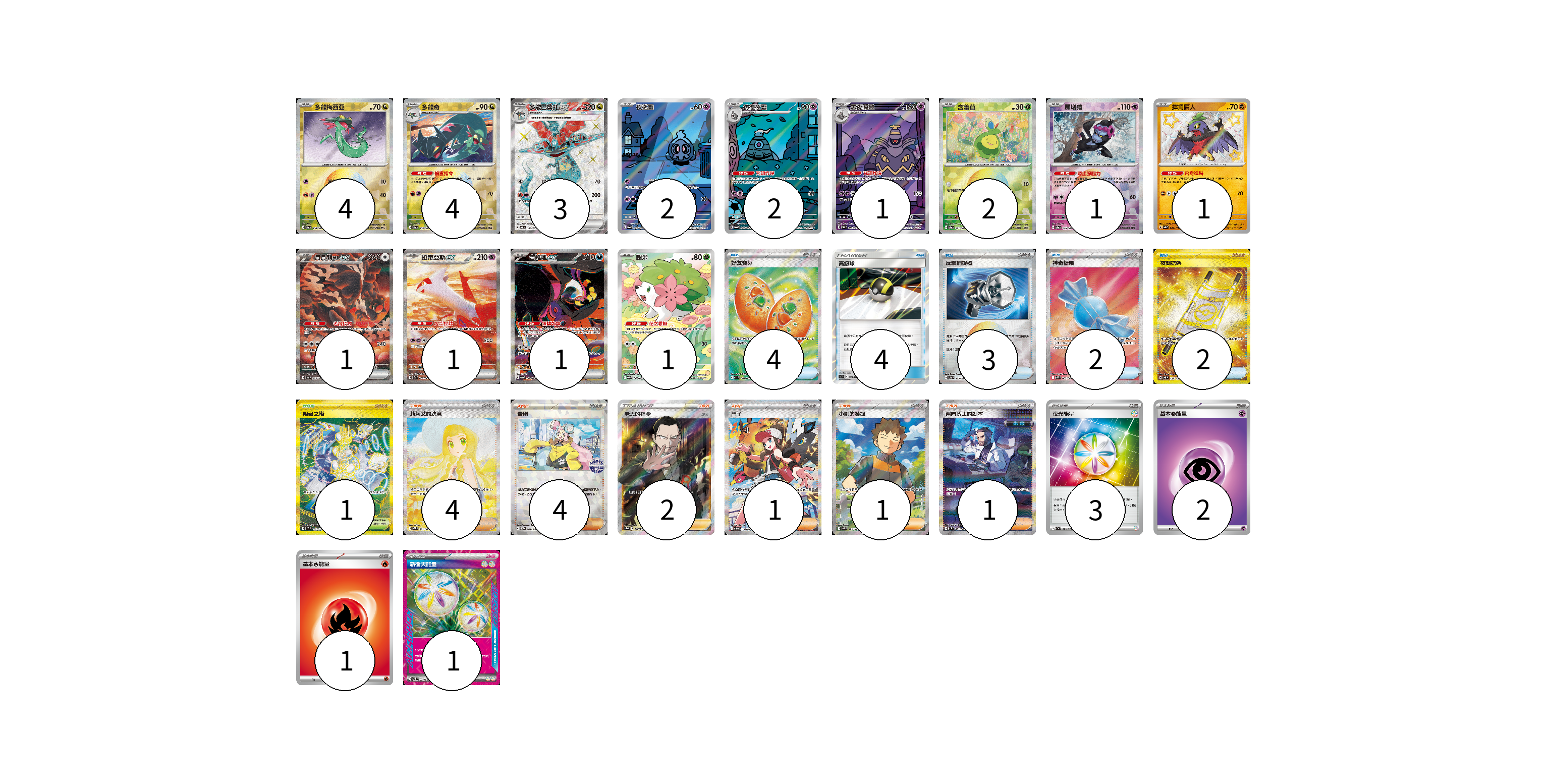 牌組構築方案 以此牌組為基礎新構築牌組 顯示卡面 顯示列表 寶可夢卡(24) 4 4 3 2 2 1 2 1 1 1 1 1 1 物品卡(15) 4 4 3 2 2 支援者卡(13) 4 4 2 1 1 1 競技場卡(1) 1 能量卡(7) 3 2 1 1 寶可夢卡(24) 卡牌名稱 張數 卡牌名稱 張數 多龍梅西亞 SV8a 118/187 04 多龍奇 SV8a 119/187 04 多龍巴魯托ex SV6 120/101 03 夜巡靈 SV6a 068/064 02 彷徨夜靈 SV6a 069/064 02 黑夜魔靈 SV6a 070/064 01 含羞苞 SV8a 001/187 02 願增猿 SV8a 075/187 01 摔角鷹人 SV4a 282/190 01 月月熊 赫月ex SV8a 225/187 01 拉帝亞斯ex SV7a 087/064 01 吉雉雞ex SV6a 089/064 01 謝米 SV9a 066/063 01 物品卡(15) 卡牌名稱 張數 卡牌名稱 張數 好友寶芬 M1S 081/063 04 高級球 AS5b 178/186 04 反擊捕捉器 SV8a 139/187 03 神奇糖果 M1S 082/063 02 夜間擔架 SV8 137/106 02 支援者卡(13) 卡牌名稱 張數 卡牌名稱 張數 莉莉艾的決意 M1L 091/063 04 奇樹 SV-P 247/SV-P 04 老大的指令(坂木) SC1b 170/153 02 鬥子 SV11W 173/086 01 小剛的發掘 SV9 123/100 01 弗圖博士的劇本 SV4M 091/066 01 競技場卡(1) 卡牌名稱 張數 卡牌名稱 張數 阻礙之塔 SV10 132/098 01 能量卡(7) 卡牌名稱 張數 卡牌名稱 張數 夜光能量 SV1a 073/073 03 基本【超】能量 SVEM PSY 02 基本【火】能量 SVD FIR 01 新衝天能量 SV5K 071/071 01 以此牌組為基礎新構築牌組 牌組編碼 jiZAKJ-RzStji-vLiKzz copy 列印牌組單 牌組編碼已複製 分享至SNS