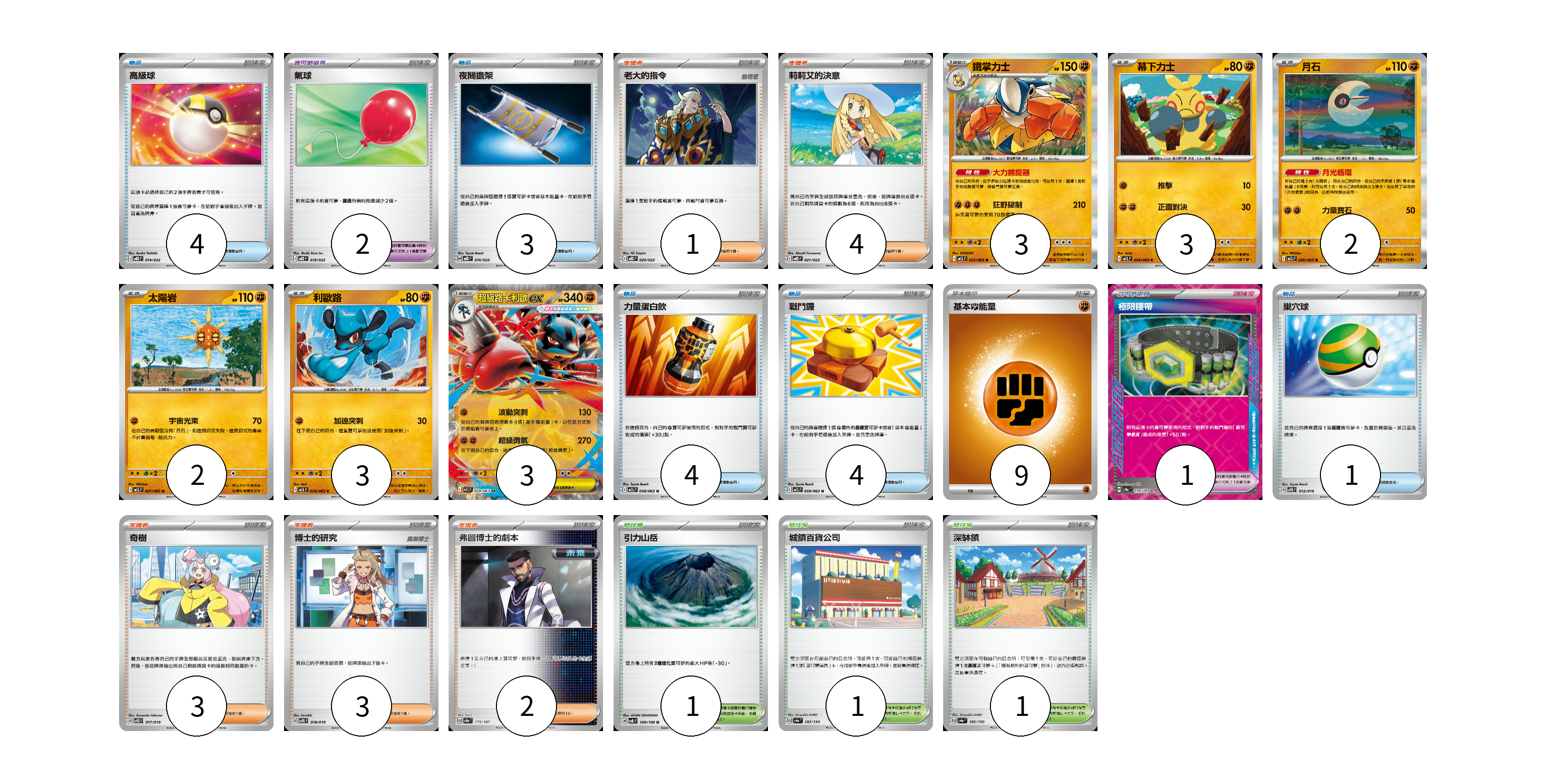 牌組構築方案 以此牌組為基礎新構築牌組 顯示卡面 顯示列表 寶可夢卡(16) 3 3 2 2 3 3 寶可夢道具(1) 1 物品卡(18) 4 2 3 4 4 1 支援者卡(13) 1 4 3 3 2 競技場卡(3) 1 1 1 能量卡(9) 9 寶可夢卡(16) 卡牌名稱 張數 卡牌名稱 張數 鐵掌力士 M1L 025/063 03 幕下力士 M1L 024/063 03 月石 M1L 026/063 02 太陽岩 M1L 027/063 02 利歐路 M1L 028/063 03 超級路卡利歐ex M1L 029/063 03 寶可夢道具(1) 卡牌名稱 張數 卡牌名稱 張數 極限腰帶 SV8a 159/187 01 物品卡(18) 卡牌名稱 張數 卡牌名稱 張數 高級球 MBD 014/022 04 氣球 MBD 018/022 02 夜間擔架 MBD 016/022 03 力量蛋白飲 M1L 058/063 04 戰鬥鑼 M1L 059/063 04 巢穴球 SVTG 012/019 01 支援者卡(13) 卡牌名稱 張數 卡牌名稱 張數 老大的指令 MBD 020/022 01 莉莉艾的決意 MBD 021/022 04 奇樹 SVTG 017/019 03 博士的研究 SVTG 018/019 03 弗圖博士的劇本 SV8a 175/187 02 競技場卡(3) 卡牌名稱 張數 卡牌名稱 張數 引力山岳 SV8 106/106 01 城鎮百貨公司 SV4a 183/190 01 深缽鎮 SV4a 185/190 01 能量卡(9) 卡牌名稱 張數 卡牌名稱 張數 基本【鬥】能量 M-P FIG 09 以此牌組為基礎新構築牌組 牌組編碼 jkMyNA-Mjvxrr-hqluIH copy 列印牌組單 牌組編碼已複製 分享至SNS
