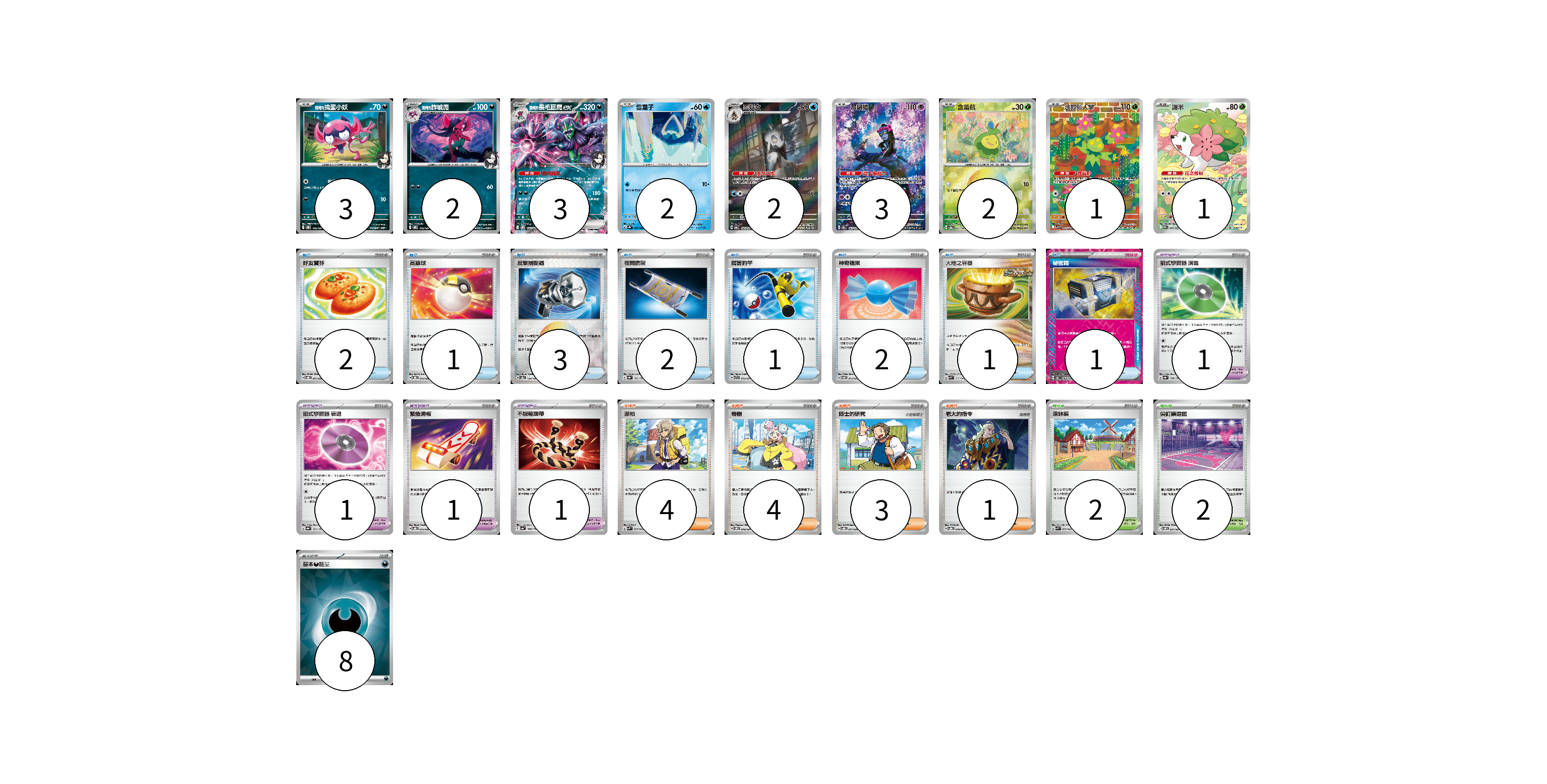 牌組構築方案 以此牌組為基礎新構築牌組 顯示卡面 顯示列表 寶可夢卡(19) 3 2 3 2 2 3 2 1 1 寶可夢道具(4) 1 1 1 1 物品卡(13) 2 1 3 2 1 2 1 1 支援者卡(12) 4 4 3 1 競技場卡(4) 2 2 能量卡(8) 8 寶可夢卡(19) 卡牌名稱 張數 卡牌名稱 張數 <瑪俐的>搗蛋小妖 SVOM 005/021 03 <瑪俐的>詐唬魔 SVOM 006/021 02 <瑪俐的>長毛巨魔ex SVOM 007/021 03 雪童子 SV3a 005/062 02 雪妖女 SV6 104/101 02 願增猿 SV6 107/101 03 含羞苞 SV8a 001/187 02 沙鈴仙人掌 SV9 101/100 01 謝米 SV9a 066/063 01 寶可夢道具(4) 卡牌名稱 張數 卡牌名稱 張數 招式學習器 演進 SV8a 160/187 01 招式學習器 衰退 SV8a 161/187 01 緊急滑板 SVOD 015/020 01 不服輸頭帶 SV4a 168/190 01 物品卡(13) 卡牌名稱 張數 卡牌名稱 張數 好友寶芬 SVOD 011/020 02 高級球 SVOD 012/020 01 反擊捕捉器 SV8a 139/187 03 夜間擔架 SV8a 151/187 02 厲害釣竿 SVTR 012/021 01 神奇糖果 SVTM 013/022 02 大地之容器 SVK 012/042 01 秘密箱 SV6 092/101 01 支援者卡(12) 卡牌名稱 張數 卡牌名稱 張數 派帕 SVK 035/042 04 奇樹 SVOM 018/021 04 博士的研究 SVOD 017/020 03 老大的指令 SVOD 019/020 01 競技場卡(4) 卡牌名稱 張數 卡牌名稱 張數 深缽鎮 SVK 039/042 02 尖釘鎮道館 SVOM 021/021 02 能量卡(8) 卡牌名稱 張數 卡牌名稱 張數 基本【惡】能量 SVK DAR 08 以此牌組為基礎新構築牌組 牌組編碼 jlYaRO-nYGgHt-YPseXs copy 列印牌組單 牌組編碼已複製 分享至SNS