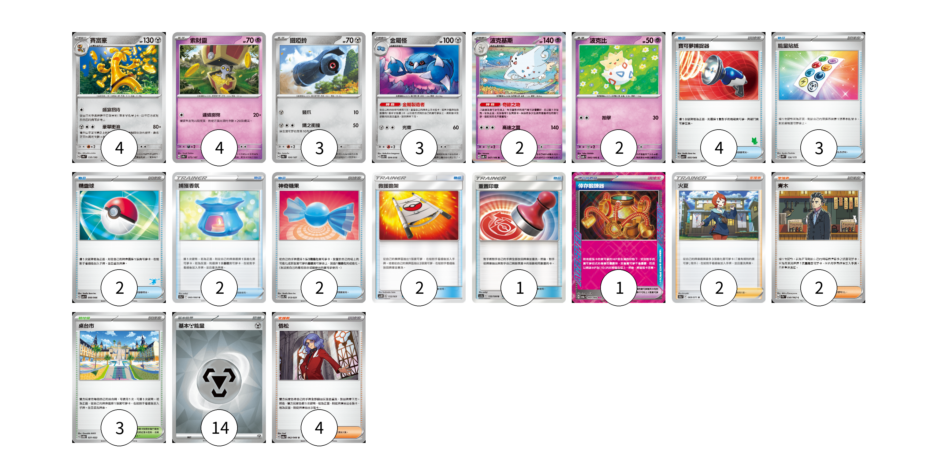 牌組構築方案 以此牌組為基礎新構築牌組 顯示卡面 顯示列表 寶可夢卡(18) 4 4 3 3 2 2 寶可夢道具(1) 1 物品卡(16) 4 3 2 2 2 2 1 支援者卡(8) 2 2 4 競技場卡(3) 3 能量卡(14) 14 寶可夢卡(18) 卡牌名稱 張數 卡牌名稱 張數 賽富豪 SV4a 133/190 04 索財靈 SV8a 073/187 04 鐵啞鈴 SV8a 106/187 03 金屬怪 SVTH 004/018 03 波克基斯 SV8 047/106 02 波克比 SV8 045/106 02 寶可夢道具(1) 卡牌名稱 張數 卡牌名稱 張數 倖存鍛鍊器 SV5a 059/066 01 物品卡(16) 卡牌名稱 張數 卡牌名稱 張數 寶可夢捕捉器 SVI 055/066 04 能量貼紙 SVM 126/175 03 精靈球 SVI 056/066 02 捕獲香氛 S11a 060/068 02 神奇糖果 SVTL 013/021 02 救援擔架 AS5D 155/169 02 重置印章 AS5a 155/184 01 支援者卡(8) 卡牌名稱 張數 卡牌名稱 張數 火夏 S10a 069/071 02 青木 SV3a 058/062 02 悟松 SV5a 062/066 04 競技場卡(3) 卡牌名稱 張數 卡牌名稱 張數 桌台市 SVTM 021/022 03 能量卡(14) 卡牌名稱 張數 卡牌名稱 張數 基本【鋼】能量 SVM MET 14 以此牌組為基礎新構築牌組 牌組編碼 jmljdd-eoeUyz-DZKSDb copy 列印牌組單 牌組編碼已複製 分享至SNS