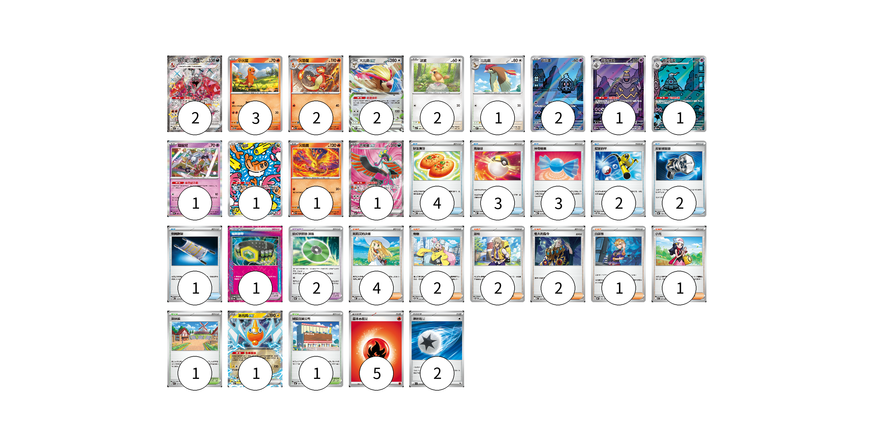 牌組構築方案 以此牌組為基礎新構築牌組 顯示卡面 顯示列表 寶可夢卡(21) 2 3 2 2 2 1 2 1 1 1 1 1 1 1 寶可夢道具(3) 1 2 物品卡(15) 4 3 3 2 2 1 支援者卡(12) 4 2 2 2 1 1 競技場卡(2) 1 1 能量卡(7) 5 2 寶可夢卡(21) 卡牌名稱 張數 卡牌名稱 張數 噴火龍ex SV4a 331/190 02 小火龍 SVTL 001/021 03 火恐龍 M2 012/080 02 大比鳥ex SVK 005/042 02 波波 SV3 087/108 02 比比鳥 SVK 004/042 01 夜巡靈 SV6a 068/064 02 黑夜魔靈 SV6a 070/064 01 彷徨夜靈 SV6a 069/064 01 鑰圈兒 SV4a 087/190 01 米立龍 SV6 112/101 01 火焰鳥 M2 014/080 01 吉雉雞ex SV6a 081/064 01 洛托姆ex M2 029/080 01 寶可夢道具(3) 卡牌名稱 張數 卡牌名稱 張數 極限腰帶 SV8a 159/187 01 招式學習器 演進 SV8a 160/187 02 物品卡(15) 卡牌名稱 張數 卡牌名稱 張數 好友寶芬 MBD 013/022 04 高級球 MBD 014/022 03 神奇糖果 MBG 013/022 03 厲害釣竿 SVOD 010/020 02 反擊捕捉器 SV8a 139/187 02 夜間擔架 MBD 016/022 01 支援者卡(12) 卡牌名稱 張數 卡牌名稱 張數 莉莉艾的決意 MBD 021/022 04 奇樹 SVOD 016/020 02 派帕 SVOD 018/020 02 老大的指令 MBD 020/022 02 白蕾雅 SV8a 176/187 01 小光 M2 077/080 01 競技場卡(2) 卡牌名稱 張數 卡牌名稱 張數 深缽鎮 SVK 039/042 01 城鎮百貨公司 SV4a 183/190 01 能量卡(7) 卡牌名稱 張數 卡牌名稱 張數 基本【火】能量 M-P FIR 05 噴射能量 SV1a 072/073 02 以此牌組為基礎新構築牌組 牌組編碼 jniYuc-JCGfEQ-etJLDI copy 列印牌組單 牌組編碼已複製 分享至SNS