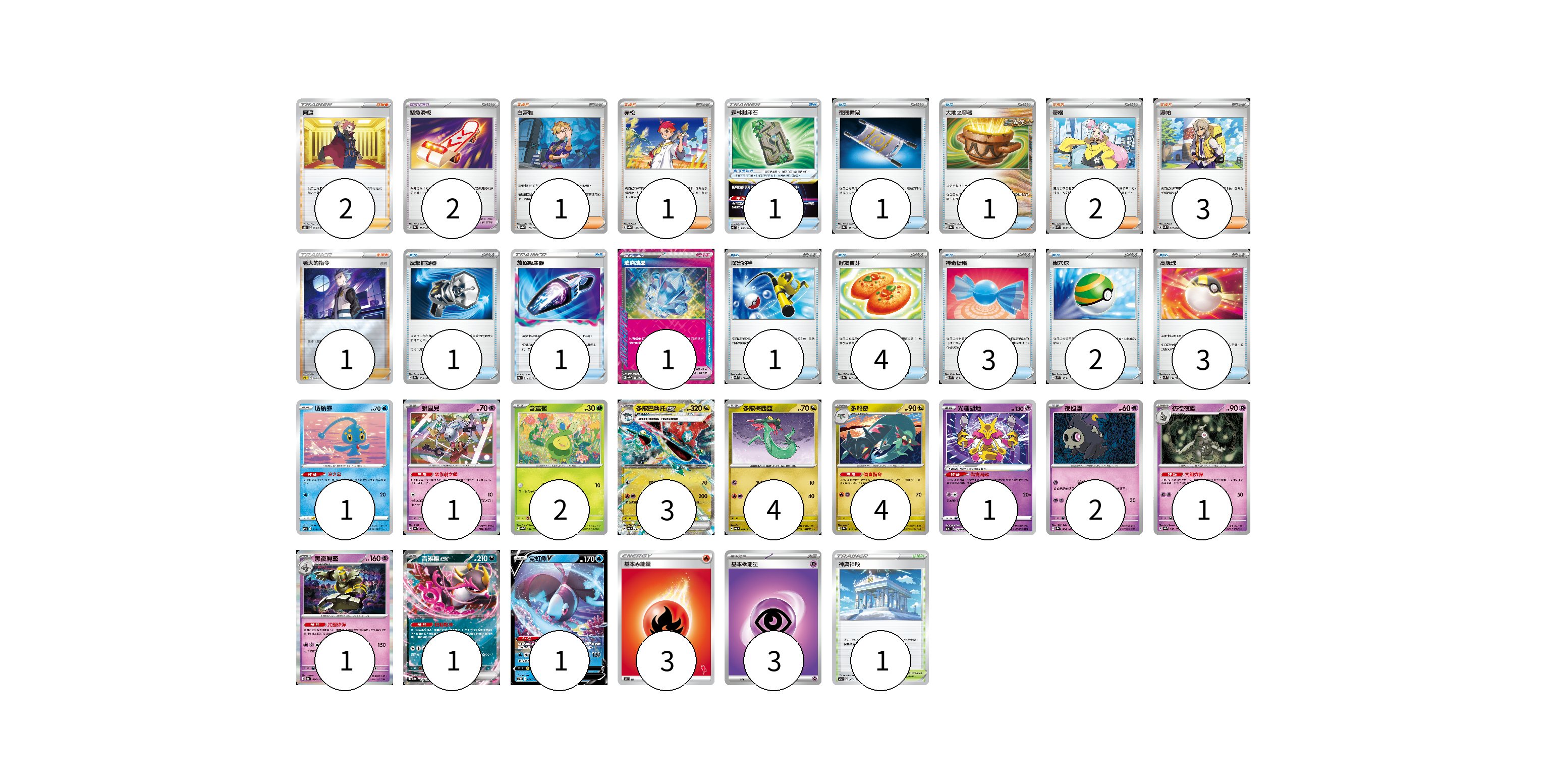 牌組構築方案 以此牌組為基礎新構築牌組 顯示卡面 顯示列表 寶可夢卡(22) 1 1 2 3 4 4 1 2 1 1 1 1 寶可夢道具(3) 2 1 物品卡(18) 1 1 1 1 1 1 4 3 2 3 支援者卡(10) 2 1 1 2 3 1 競技場卡(1) 1 能量卡(6) 3 3 寶可夢卡(22) 卡牌名稱 張數 卡牌名稱 張數 瑪納霏 SVF 003/038 01 鑰圈兒 SV4a 087/190 01 含羞苞 SV8a 001/187 02 多龍巴魯托ex SV6 081/101 03 多龍梅西亞 SV6 079/101 04 多龍奇 SV8a 119/187 04 光輝胡地 SVTM 006/022 01 夜巡靈 SV8a 064/187 02 彷徨夜靈 SV8a 065/187 01 黑夜魔靈 SV8a 066/187 01 吉雉雞ex SV8a 104/187 01 霓虹魚V SVHK 004/022 01 寶可夢道具(3) 卡牌名稱 張數 卡牌名稱 張數 緊急滑板 SV8a 153/187 02 璀璨結晶 SV8a 152/187 01 物品卡(18) 卡牌名稱 張數 卡牌名稱 張數 森林封印石 SVF 024/038 01 夜間擔架 SV8a 151/187 01 大地之容器 SV8a 143/187 01 反擊捕捉器 SV8a 139/187 01 放逐吸塵器 SVF 023/038 01 厲害釣竿 SVK 011/042 01 好友寶芬 SV8a 147/187 04 神奇糖果 SVM 135/175 03 巢穴球 SVM 133/175 02 高級球 SVM 134/175 03 支援者卡(10) 卡牌名稱 張數 卡牌名稱 張數 阿渡 S12 096/098 02 白蕾雅 SV8a 176/187 01 赤松 SV8a 163/187 01 奇樹 SVM 160/175 02 派帕 SVK 035/042 03 老大的指令(赤日) SPZ 020/020 01 競技場卡(1) 卡牌名稱 張數 卡牌名稱 張數 神奧神殿 S12a 169/172 01 能量卡(6) 卡牌名稱 張數 卡牌名稱 張數 基本火能量 SH FIR 03 基本超能量 sv-p PSY 03 以此牌組為基礎新構築牌組 牌組編碼 jqUiUh-iSrXrh-KqdMEe copy 列印牌組單 牌組編碼已複製 分享至SNS