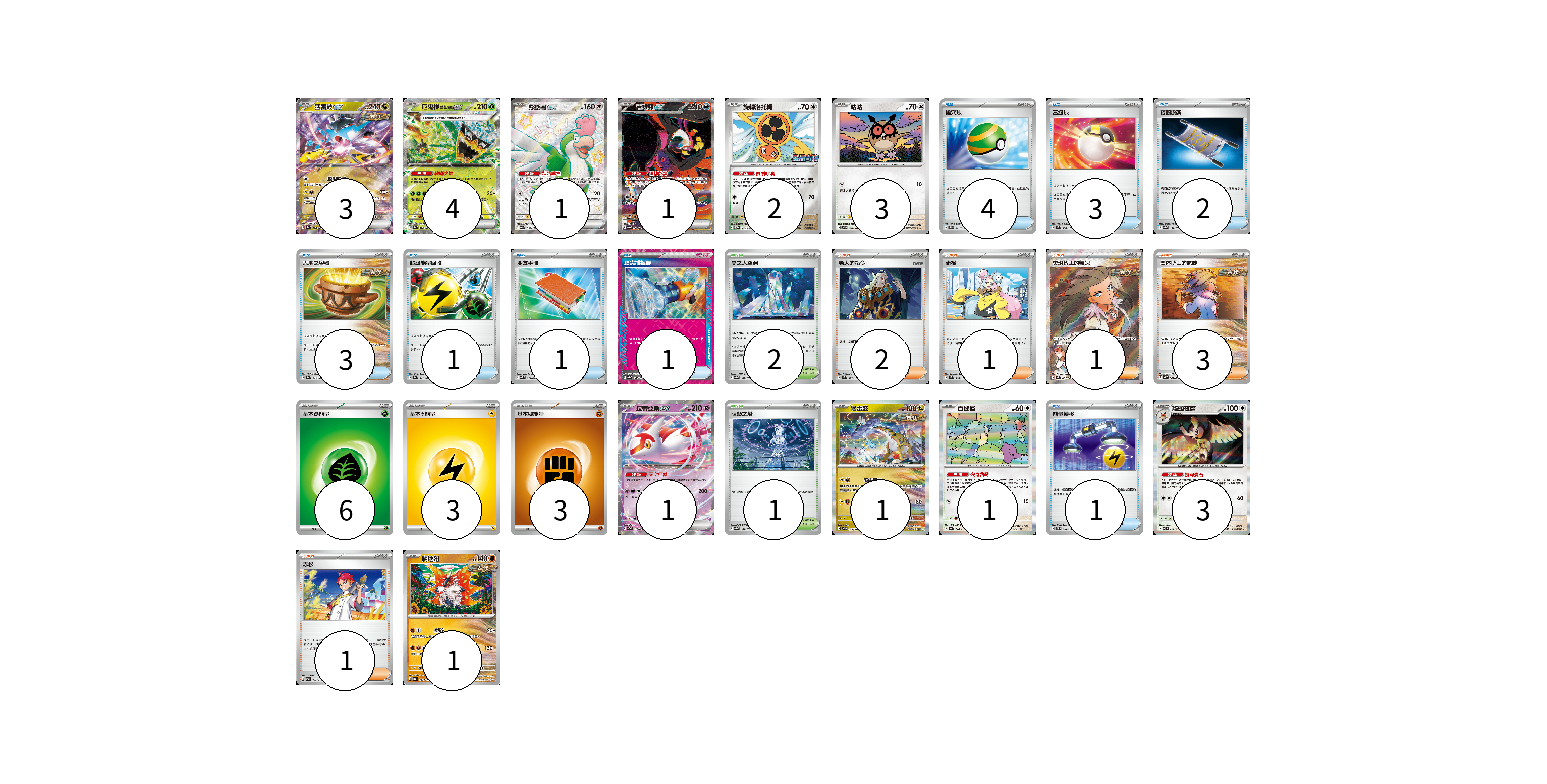 牌組構築方案 以此牌組為基礎新構築牌組 顯示卡面 顯示列表 寶可夢卡(21) 3 4 1 1 2 3 1 1 1 3 1 物品卡(16) 4 3 2 3 1 1 1 1 支援者卡(8) 2 1 1 3 1 競技場卡(3) 2 1 能量卡(12) 6 3 3 寶可夢卡(21) 卡牌名稱 張數 卡牌名稱 張數 猛雷鼓ex SV8a 124/187 03 厄鬼椪 碧草面具ex SV8a 020/187 04 怒鸚哥ex SV4a 337/190 01 吉雉雞ex SV6a 089/064 01 旋轉洛托姆 SV-P 146/SV-P 02 咕咕 SV7 076/102 03 拉帝亞斯ex SV7a 019/064 01 猛雷鼓 SV7 075/102 01 百變怪 SV4a 144/190 01 貓頭夜鷹 SV7 077/102 03 爬地翅 SV8a 087/187 01 物品卡(16) 卡牌名稱 張數 卡牌名稱 張數 巢穴球 SVEL 011/020 04 高級球 SVM 134/175 03 夜間擔架 SV8a 151/187 02 大地之容器 SV8a 143/187 03 超級能量回收 SV8a 141/187 01 朋友手冊 SVK 014/042 01 頂尖捕捉器 SV8a 148/187 01 能量轉移 SVTR 010/021 01 支援者卡(8) 卡牌名稱 張數 卡牌名稱 張數 老大的指令 SVM 172/175 02 奇樹 SVM 160/175 01 奧琳博士的氣魄 SV4K 085/066 01 奧琳博士的氣魄 SV4K 064/066 03 赤松 SVK 027/042 01 競技場卡(3) 卡牌名稱 張數 卡牌名稱 張數 零之大空洞 SV8a 182/187 02 阻礙之塔 SV8a 181/187 01 能量卡(12) 卡牌名稱 張數 卡牌名稱 張數 基本【草】能量 SVTM GRA 06 基本【雷】能量 SVTR LIG 03 基本【鬥】能量 SVTG FIG 03 以此牌組為基礎新構築牌組 牌組編碼 jyZGCu-WcvvpU-gTKnpQ copy 列印牌組單 牌組編碼已複製 分享至SNS