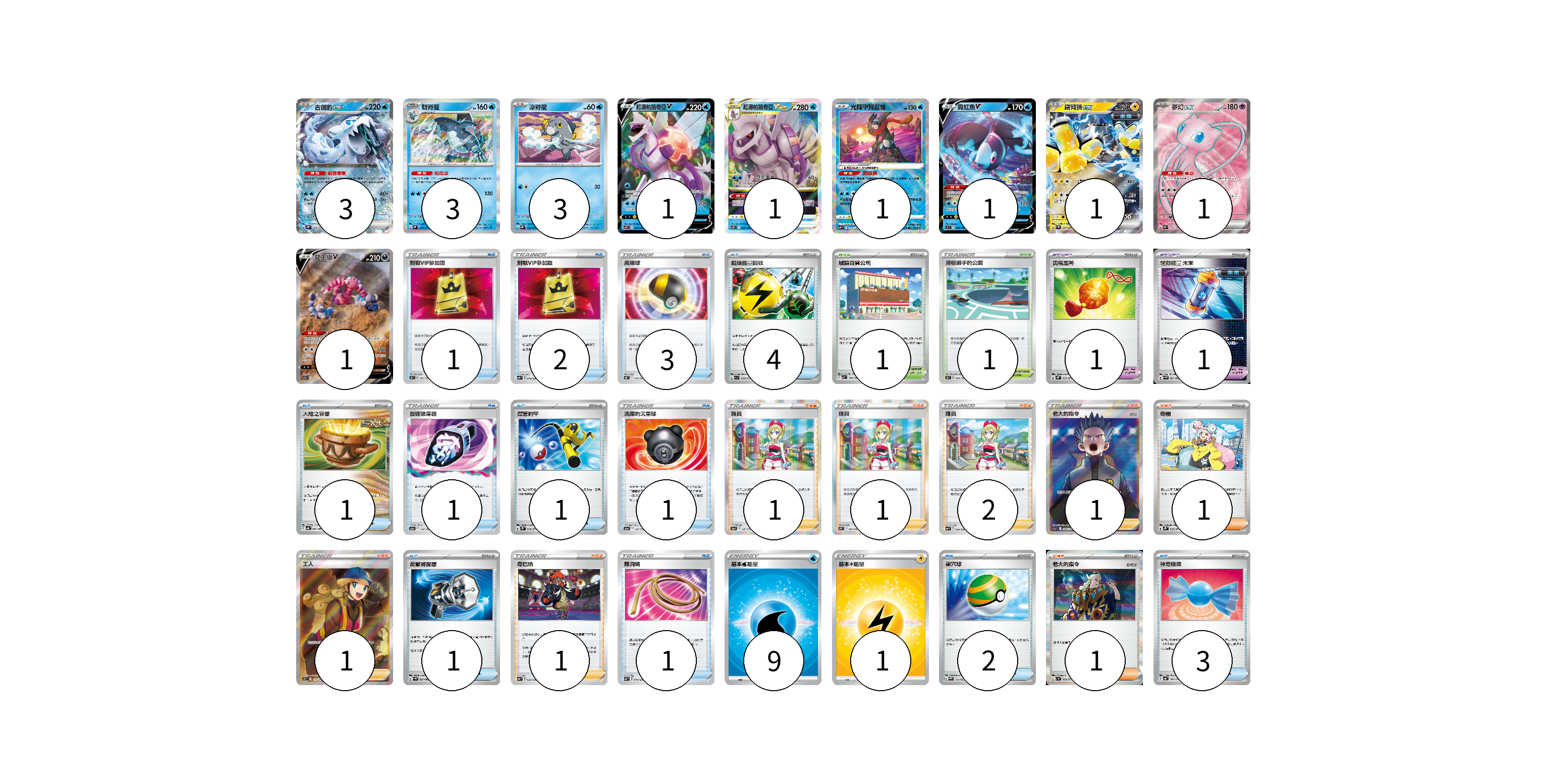 牌組構築方案 以此牌組為基礎新構築牌組 顯示卡面 顯示列表 寶可夢卡(16) 3 3 3 1 1 1 1 1 1 1 寶可夢道具(2) 1 1 物品卡(21) 1 2 3 4 1 1 1 1 1 1 2 3 支援者卡(9) 1 1 2 1 1 1 1 1 競技場卡(2) 1 1 能量卡(10) 9 1 寶可夢卡(16) 卡牌名稱 張數 卡牌名稱 張數 古劍豹ex SV2P 028/071 03 戟脊龍 SV2P 027/071 03 涼脊龍 SV2P 024/071 03 起源帕路奇亞V S10P 022/067 01 起源帕路奇亞VSTAR S10P 023/067 01 光輝甲賀忍蛙 SVF 004/038 01 霓虹魚V S9 030/100 01 鐵臂膀ex SV4M 027/066 01 夢幻ex SV2a 195/165 01 龍王蠍V S12a 227/172 01 寶可夢道具(2) 卡牌名稱 張數 卡牌名稱 張數 勇氣護符 SV2D 067/071 01 驅勁能量 未來 SV4M 062/066 01 物品卡(21) 卡牌名稱 張數 卡牌名稱 張數 對戰VIP參加證 S8 091/100 01 對戰VIP參加證 SVF 018/038 02 高級球 SN 016/024 03 超級能量回收 SV1a 064/073 04 大地之容器 SV4K 060/066 01 放逐吸塵器 S12a 144/172 01 厲害釣竿 SV2P 066/071 01 洗翠的沉重球 S12a 140/172 01 反擊捕捉器 SV4M 059/066 01 離洞繩 SVF 010/038 01 巢穴球 SVAW 014/023 02 神奇糖果 SV4a 163/190 03 支援者卡(9) 卡牌名稱 張數 卡牌名稱 張數 珠貝 S12a 149/172 01 珠貝 S10P 064/067 01 珠貝 SVF 025/038 02 老大的指令(赤日) S12a 250/172 01 奇樹 SV2D 069/071 01 工人 S12 111/098 01 奇巴納 SVF 026/038 01 老大的指令 SV1a 069/073 01 競技場卡(2) 卡牌名稱 張數 卡牌名稱 張數 城鎮百貨公司 SV3 107/108 01 滑板選手的公園 S8 099/100 01 能量卡(10) 卡牌名稱 張數 卡牌名稱 張數 基本【水】能量 SI WAT 09 基本【雷】能量 SI LIG 01 以此牌組為基礎新構築牌組 牌組編碼 kLdYRV-AvxMqF-ODfcJt copy 列印牌組單 牌組編碼已複製 分享至SNS