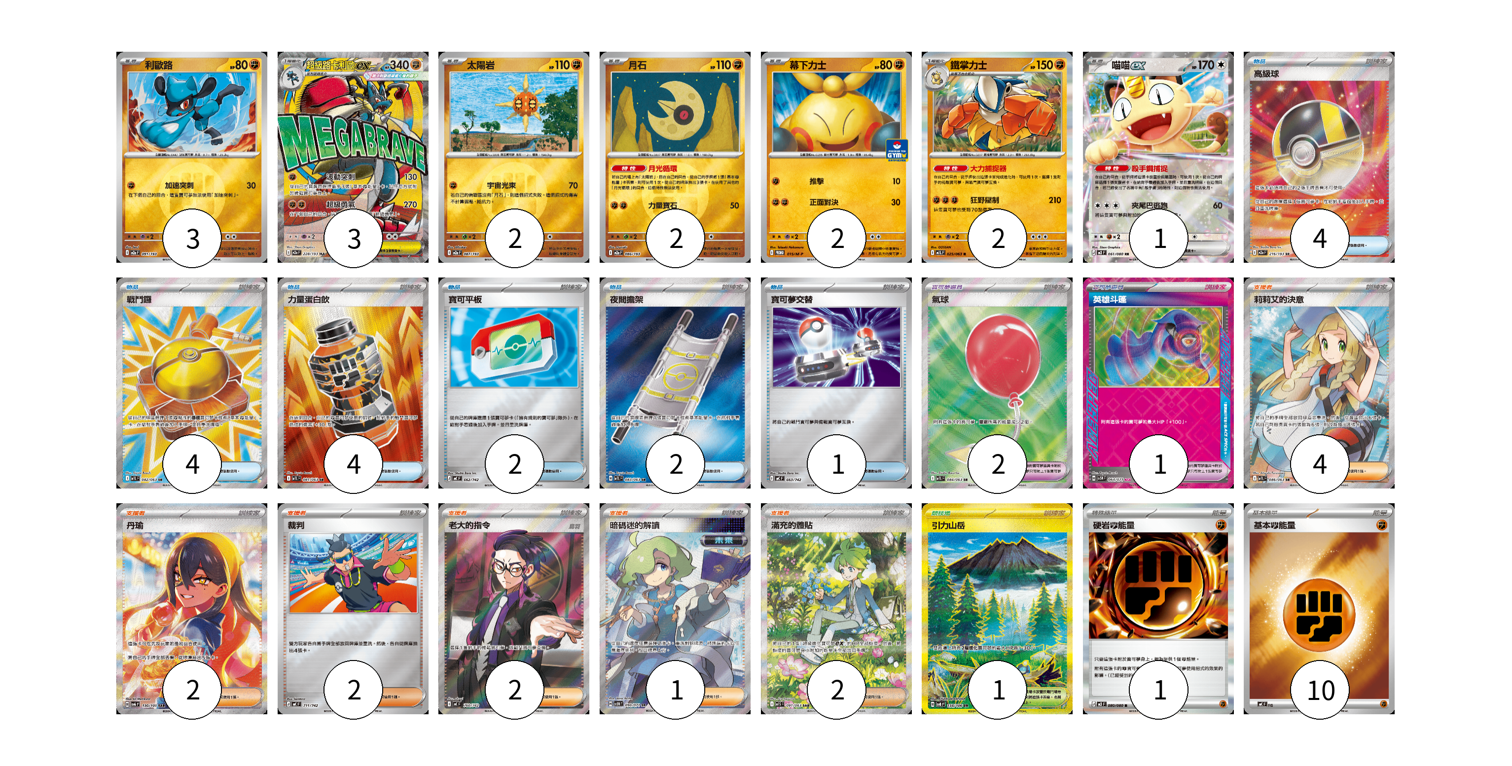 牌組構築方案 以此牌組為基礎新構築牌組 顯示卡面 顯示列表 寶可夢卡(15) 3 3 2 2 2 2 1 寶可夢道具(3) 2 1 物品卡(17) 4 4 4 2 2 1 支援者卡(13) 4 2 2 2 1 2 競技場卡(1) 1 能量卡(11) 1 10 寶可夢卡(15) 卡牌名稱 張數 卡牌名稱 張數 利歐路 M2a 091/193 03 超級路卡利歐ex M2a 228/193 03 太陽岩 M2a 087/193 02 月石 M2a 086/193 02 幕下力士 M-P 015/M-P 02 鐵掌力士 M1L 025/063 02 喵喵ex M3 061/080 01 寶可夢道具(3) 卡牌名稱 張數 卡牌名稱 張數 氣球 M1L 084/063 02 英雄斗篷 SV5M 064/071 01 物品卡(17) 卡牌名稱 張數 卡牌名稱 張數 高級球 M2a 216/193 04 戰鬥鑼 M1L 082/063 04 力量蛋白飲 M1L 081/063 04 寶可平板 MC 662/742 02 夜間擔架 M1L 083/063 02 寶可夢交替 MC 663/742 01 支援者卡(13) 卡牌名稱 張數 卡牌名稱 張數 莉莉艾的決意 M1L 086/063 04 丹瑜 SV6 130/101 02 裁判 MC 711/742 02 老大的指令(烏羽) MC 760/742 02 暗碼迷的解讀 SV5M 090/071 01 滿充的體貼 M1S 091/063 02 競技場卡(1) 卡牌名稱 張數 卡牌名稱 張數 引力山岳 SV8 138/106 01 能量卡(11) 卡牌名稱 張數 卡牌名稱 張數 硬岩【鬥】能量 M3 080/080 01 基本【鬥】能量 MC FIG 10 以此牌組為基礎新構築牌組 牌組編碼 kLhPnq-xRjjql-fuxqMn copy 列印牌組單 牌組編碼已複製 分享至SNS