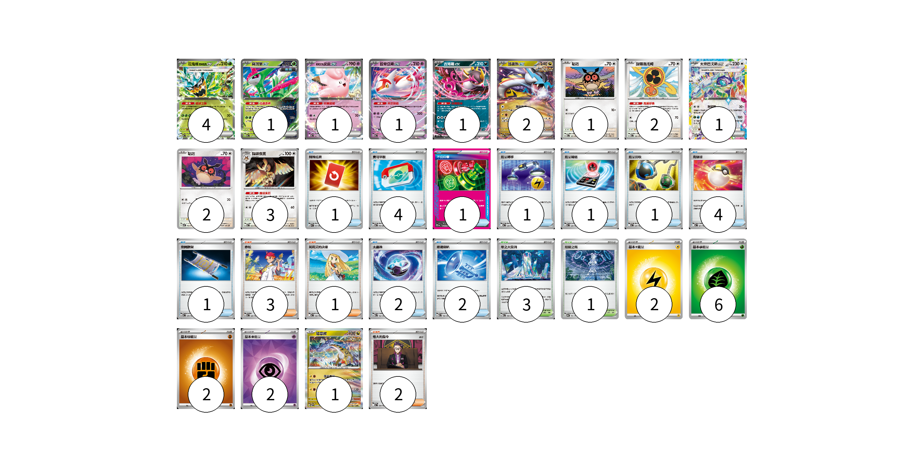 牌組構築方案 以此牌組為基礎新構築牌組 顯示卡面 顯示列表 寶可夢卡(20) 4 1 1 1 1 2 1 2 1 2 3 1 物品卡(18) 1 4 1 1 1 1 4 1 2 2 支援者卡(6) 3 1 2 競技場卡(4) 3 1 能量卡(12) 2 6 2 2 寶可夢卡(20) 卡牌名稱 張數 卡牌名稱 張數 厄鬼椪 碧草面具ex MC 082/742 04 鐵斑葉ex MC 077/742 01 莉莉艾的皮皮ex MC 287/742 01 拉帝亞斯ex MC 312/742 01 吉雉雞ex MC 489/742 01 猛雷鼓ex MC 554/742 02 咕咕 M2a 137/193 01 旋轉洛托姆 M2a 139/193 02 太樂巴戈斯ex SV8a 136/187 01 咕咕 SV5K 054/071 02 貓頭夜鷹 MC 573/742 03 猛雷鼓 SV7 075/102 01 物品卡(18) 卡牌名稱 張數 卡牌名稱 張數 特殊紅牌 M4 072/083 01 寶可平板 M3 070/080 04 不公印章 MC 633/742 01 能量轉移 MC 638/742 01 能量輸送 MC 639/742 01 能量回收 MC 636/742 01 高級球 MC 651/742 04 夜間擔架 MC 670/742 01 太晶珠 M2a 152/193 02 玻璃喇叭 M2a 149/193 02 支援者卡(6) 卡牌名稱 張數 卡牌名稱 張數 赤松 MC 696/742 03 莉莉艾的決意 MC 729/742 01 老大的指令 MC 724/742 02 競技場卡(4) 卡牌名稱 張數 卡牌名稱 張數 零之大空洞 M2a 184/193 03 阻礙之塔 SV8a 181/187 01 能量卡(12) 卡牌名稱 張數 卡牌名稱 張數 基本【雷】能量 MJ LIG 02 基本【草】能量 MJ GRA 06 基本【鬥】能量 MC FIG 02 基本【超】能量 SVOD PSY 02 以此牌組為基礎新構築牌組 牌組編碼 kMnXka-BXmoGR-etXfda copy 列印牌組單 牌組編碼已複製 分享至SNS