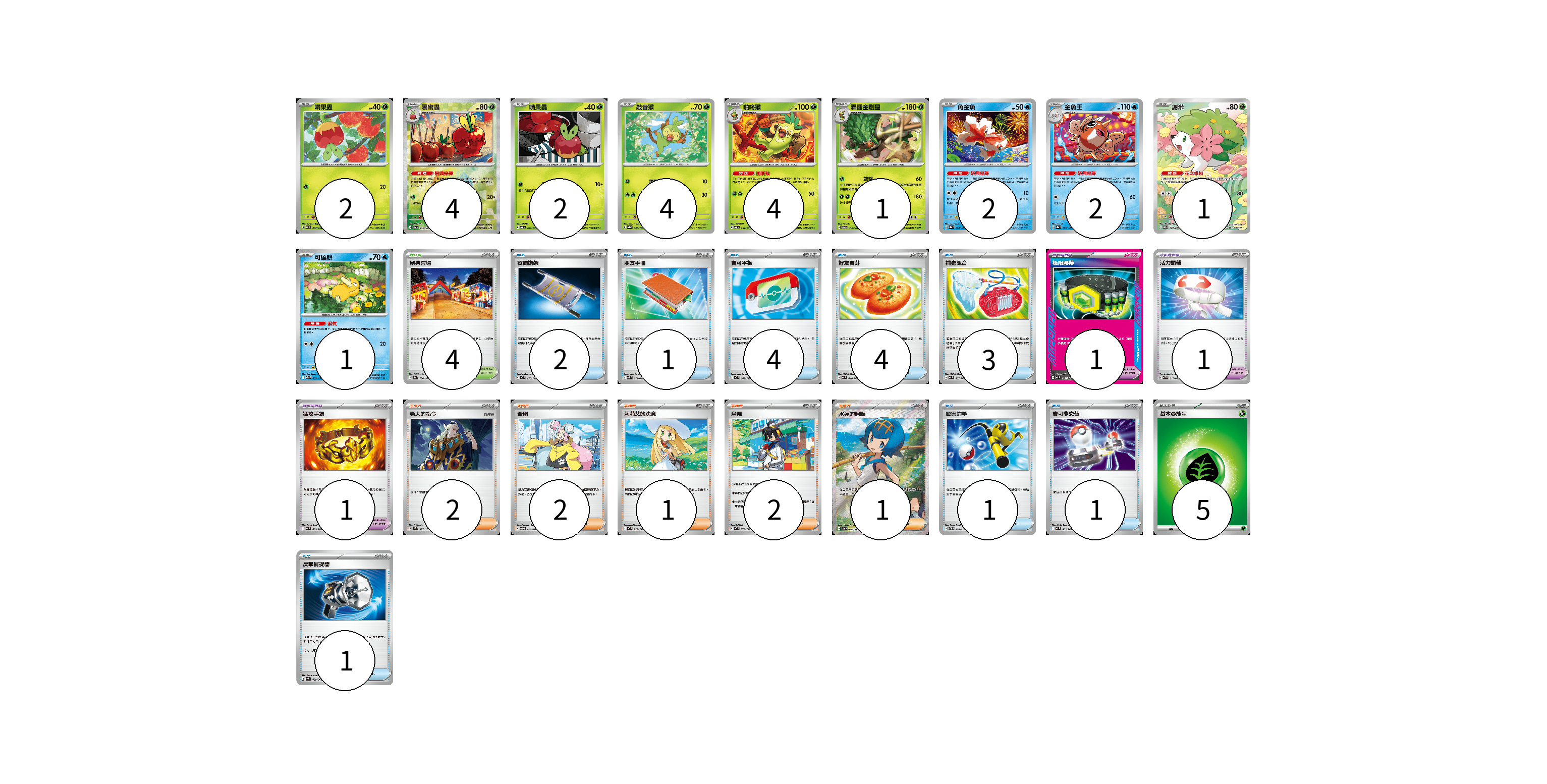牌組構築方案 以此牌組為基礎新構築牌組 顯示卡面 顯示列表 寶可夢卡(23) 2 4 2 4 4 1 2 2 1 1 寶可夢道具(3) 1 1 1 物品卡(17) 2 1 4 4 3 1 1 1 支援者卡(8) 2 2 1 2 1 競技場卡(4) 4 能量卡(5) 5 寶可夢卡(23) 卡牌名稱 張數 卡牌名稱 張數 啃果蟲 MC 062/742 02 裹蜜蟲 SV8a 009/187 04 啃果蟲 SV6 011/101 02 敲音猴 SV8a 006/187 04 啪咚猴 SV6 009/101 04 轟擂金剛猩 SV6 010/101 01 角金魚 SV8a 028/187 02 金魚王 SV8a 029/187 02 謝米 SV9a 066/063 01 可達鴨 M2a 032/193 01 寶可夢道具(3) 卡牌名稱 張數 卡牌名稱 張數 極限腰帶 MC 691/742 01 活力頭帶 SVAW 019/023 01 猛攻手鐲 MC 689/742 01 物品卡(17) 卡牌名稱 張數 卡牌名稱 張數 夜間擔架 MC 670/742 02 朋友手冊 SVK 014/042 01 寶可平板 MC 662/742 04 好友寶芬 MC 648/742 04 捕蟲組合 MC 667/742 03 厲害釣竿 SVTH 008/018 01 寶可夢交替 MC 663/742 01 反擊捕捉器 SV4M 059/066 01 支援者卡(8) 卡牌名稱 張數 卡牌名稱 張數 老大的指令 SVM 172/175 02 奇樹 SVOD 016/020 02 莉莉艾的決意 MC 729/742 01 烏栗 MC 713/742 02 水蓮的照顧 SV5a 088/066 01 競技場卡(4) 卡牌名稱 張數 卡牌名稱 張數 祭典會場 SV8a 180/187 04 能量卡(5) 卡牌名稱 張數 卡牌名稱 張數 基本【草】能量 MC GRA 05 以此牌組為基礎新構築牌組 牌組編碼 kPmzmo-wFoZaG-kRFYcr copy 列印牌組單 牌組編碼已複製 分享至SNS
