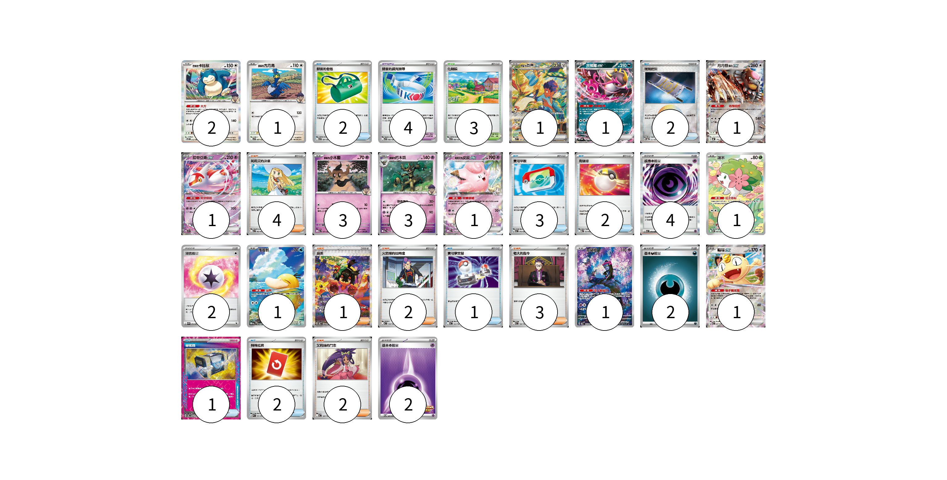 牌組構築方案 以此牌組為基礎新構築牌組 顯示卡面 顯示列表 寶可夢卡(18) 2 1 1 1 1 1 3 3 1 1 1 1 1 寶可夢道具(4) 4 物品卡(13) 2 2 3 2 1 1 2 支援者卡(12) 4 1 2 3 2 競技場卡(3) 3 能量卡(10) 4 2 2 2 寶可夢卡(18) 卡牌名稱 張數 卡牌名稱 張數 赫普的卡比獸 SV9 075/100 02 赫普的古月鳥 SV9 087/100 01 赫普的蒼響ex SV9 128/100 01 吉雉雞ex SV8a 104/187 01 月月熊 赫月ex SV8a 134/187 01 拉帝亞斯ex SV7a 019/064 01 赫普的小木靈 M2a 077/193 03 赫普的朽木妖 M2a 078/193 03 莉莉艾的皮皮ex M2a 060/193 01 謝米 SV9a 066/063 01 可達鴨 M2a 199/193 01 願增猿 SV6 107/101 01 喵喵ex M3 061/080 01 寶可夢道具(4) 卡牌名稱 張數 卡牌名稱 張數 赫普的講究頭帶 SV9 092/100 04 物品卡(13) 卡牌名稱 張數 卡牌名稱 張數 赫普的包包 SV9 091/100 02 夜間擔架 SV8a 151/187 02 寶可平板 M3 070/080 03 高級球 MBG 012/022 02 寶可夢交替 MC 663/742 01 秘密箱 SV6 092/101 01 特殊紅牌 M4 072/083 02 支援者卡(12) 卡牌名稱 張數 卡牌名稱 張數 莉莉艾的決意 M1L 062/063 04 烏栗 SV6 129/101 01 火箭隊的拉姆達 MC 734/742 02 老大的指令 MC 724/742 03 艾莉絲的鬥志 MC 694/742 02 競技場卡(3) 卡牌名稱 張數 卡牌名稱 張數 化朗鎮 SV9 099/100 03 能量卡(10) 卡牌名稱 張數 卡牌名稱 張數 感應【超】能量 M3 079/080 04 薄霧能量 SV5M 071/071 02 基本【惡】能量 MC DAR 02 基本【超】能量 SV-P 261/SV-P 02 以此牌組為基礎新構築牌組 牌組編碼 kcEEHX-ckNvic-CTVPrG copy 列印牌組單 牌組編碼已複製 分享至SNS