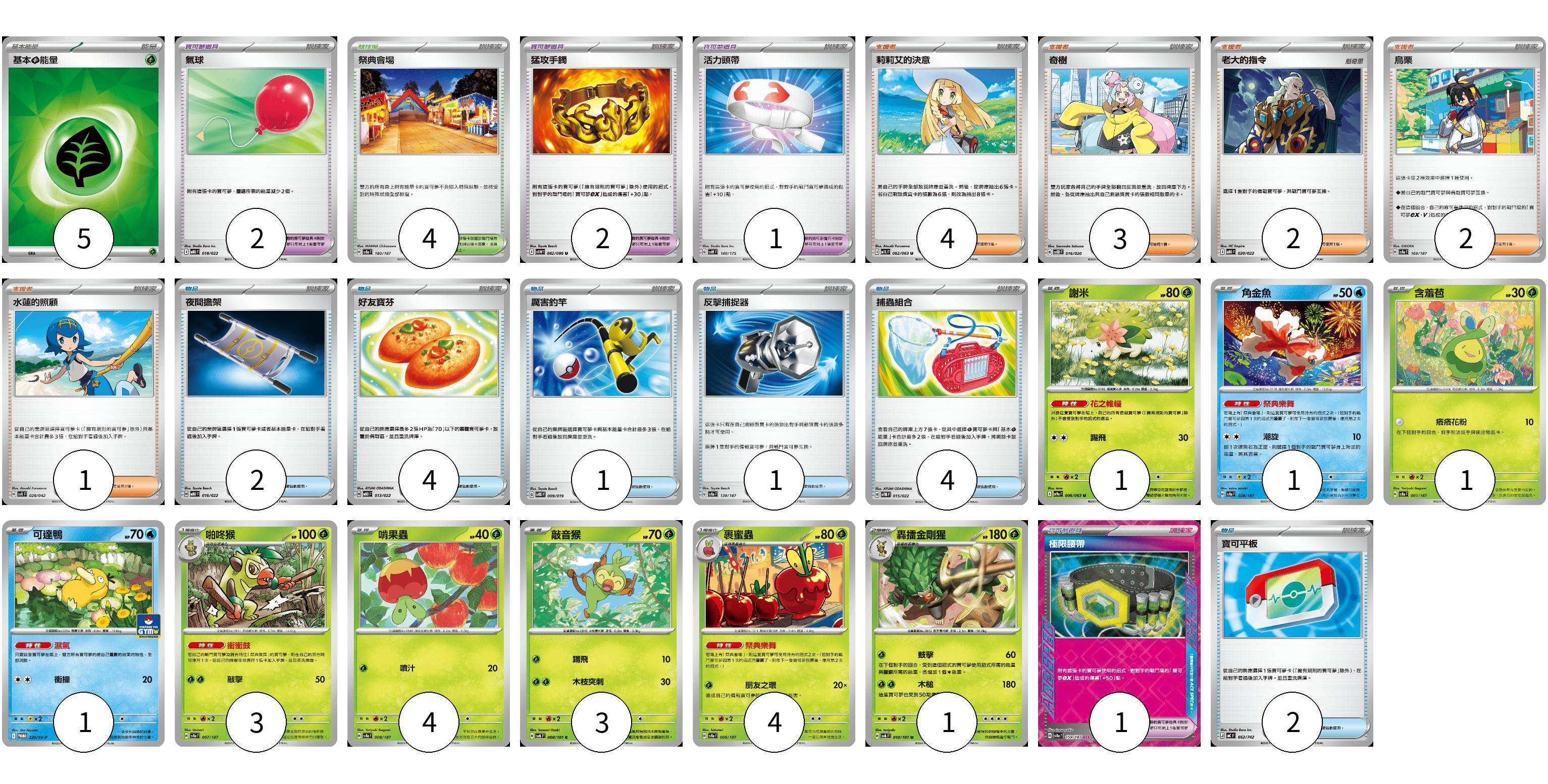 牌組構築方案 以此牌組為基礎新構築牌組 顯示卡面 顯示列表 寶可夢卡(19) 1 1 1 1 3 4 3 4 1 寶可夢道具(4) 2 1 1 物品卡(16) 2 2 4 1 1 4 2 支援者卡(12) 4 3 2 2 1 競技場卡(4) 4 能量卡(5) 5 寶可夢卡(19) 卡牌名稱 張數 卡牌名稱 張數 謝米 SV9a 006/063 01 角金魚 SV8a 028/187 01 含羞苞 SV8a 001/187 01 可達鴨 SV-P 220/SV-P 01 啪咚猴 SV8a 007/187 03 啃果蟲 SV8a 008/187 04 敲音猴 SV6 008/101 03 裹蜜蟲 SV8a 009/187 04 轟擂金剛猩 SV6 010/101 01 寶可夢道具(4) 卡牌名稱 張數 卡牌名稱 張數 猛攻手鐲 SV11W 082/086 02 活力頭帶 SVM 140/175 01 極限腰帶 SV8a 159/187 01 物品卡(16) 卡牌名稱 張數 卡牌名稱 張數 氣球 MBD 018/022 02 夜間擔架 MBD 016/022 02 好友寶芬 MBD 013/022 04 厲害釣竿 SVTG 009/019 01 反擊捕捉器 SV8a 139/187 01 捕蟲組合 SVTM 015/022 04 寶可平板 MC 662/742 02 支援者卡(12) 卡牌名稱 張數 卡牌名稱 張數 莉莉艾的決意 M1L 062/063 04 奇樹 SVOD 016/020 03 老大的指令 MBD 020/022 02 烏栗 SV8a 169/187 02 水蓮的照顧 SVK 028/042 01 競技場卡(4) 卡牌名稱 張數 卡牌名稱 張數 祭典會場 SV8a 180/187 04 能量卡(5) 卡牌名稱 張數 卡牌名稱 張數 基本【草】能量 SVM GRA 05 以此牌組為基礎新構築牌組 牌組編碼 kfhSTr-BoNsge-EeQHsC copy 列印牌組單 牌組編碼已複製 分享至SNS