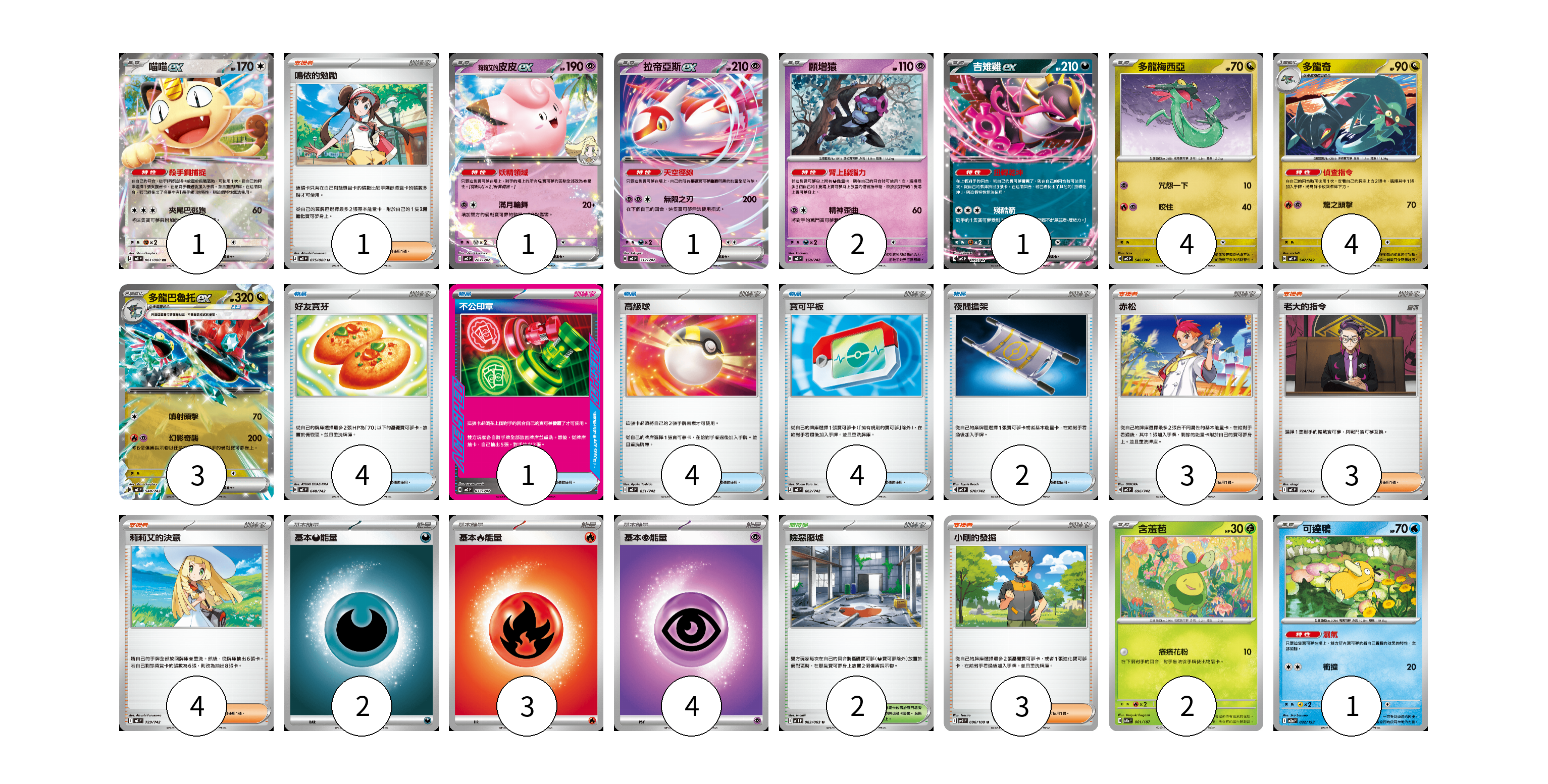 牌組構築方案 以此牌組為基礎新構築牌組 顯示卡面 顯示列表 寶可夢卡(20) 1 1 1 2 1 4 4 3 2 1 物品卡(15) 4 1 4 4 2 支援者卡(14) 1 3 3 4 3 競技場卡(2) 2 能量卡(9) 2 3 4 寶可夢卡(20) 卡牌名稱 張數 卡牌名稱 張數 喵喵ex M3 061/080 01 莉莉艾的皮皮ex MC 287/742 01 拉帝亞斯ex MC 312/742 01 願增猿 MC 358/742 02 吉雉雞ex MC 489/742 01 多龍梅西亞 MC 546/742 04 多龍奇 MC 547/742 04 多龍巴魯托ex MC 548/742 03 含羞苞 SV8a 001/187 02 可達鴨 M2a 032/193 01 物品卡(15) 卡牌名稱 張數 卡牌名稱 張數 好友寶芬 MC 648/742 04 不公印章 MC 633/742 01 高級球 MC 651/742 04 寶可平板 MC 662/742 04 夜間擔架 MC 670/742 02 支援者卡(14) 卡牌名稱 張數 卡牌名稱 張數 鳴依的勉勵 M3 075/080 01 赤松 MC 696/742 03 老大的指令 MC 724/742 03 莉莉艾的決意 MC 729/742 04 小剛的發掘 SV9 096/100 03 競技場卡(2) 卡牌名稱 張數 卡牌名稱 張數 險惡廢墟 M1L 063/063 02 能量卡(9) 卡牌名稱 張數 卡牌名稱 張數 基本【惡】能量 MC DAR 02 基本【火】能量 MC FIR 03 基本【超】能量 MC PSY 04 以此牌組為基礎新構築牌組 牌組編碼 kfoVev-cDuOXA-HyaUxw copy 列印牌組單 牌組編碼已複製 分享至SNS