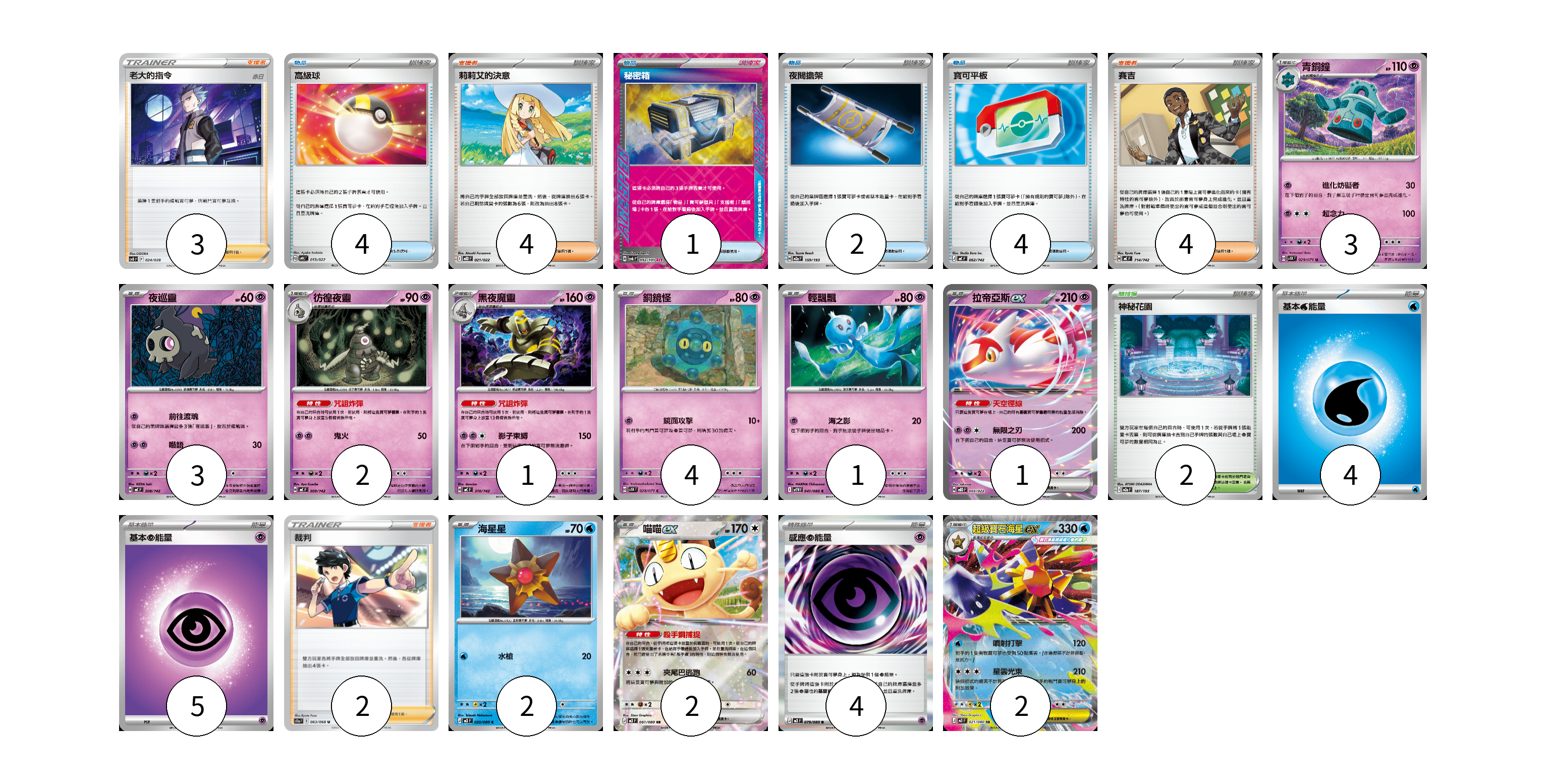 牌組構築方案 以此牌組為基礎新構築牌組 顯示卡面 顯示列表 寶可夢卡(21) 3 3 2 1 4 1 1 2 2 2 物品卡(11) 4 1 2 4 支援者卡(13) 3 4 4 2 競技場卡(2) 2 能量卡(13) 4 5 4 寶可夢卡(21) 卡牌名稱 張數 卡牌名稱 張數 青銅鐘 SV5K 029/071 03 夜巡靈 MC 308/742 03 彷徨夜靈 MC 309/742 02 黑夜魔靈 MC 310/742 01 銅鏡怪 SV5K 028/071 04 輕飄飄 SV11W 041/086 01 拉帝亞斯ex MBD 003/022 01 海星星 M3 020/080 02 喵喵ex M3 061/080 02 超級寶石海星ex M3 021/080 02 物品卡(11) 卡牌名稱 張數 卡牌名稱 張數 高級球 SVHK 013/022 04 秘密箱 SV6 092/101 01 夜間擔架 M2a 159/193 02 寶可平板 MC 662/742 04 支援者卡(13) 卡牌名稱 張數 卡牌名稱 張數 老大的指令(赤日) SVB 024/028 03 莉莉艾的決意 MBD 021/022 04 賽吉 MC 714/742 04 裁判 S11a 063/068 02 競技場卡(2) 卡牌名稱 張數 卡牌名稱 張數 神秘花園 M2a 187/193 02 能量卡(13) 卡牌名稱 張數 卡牌名稱 張數 基本【水】能量 MC WAT 04 基本【超】能量 MC PSY 05 感應【超】能量 M3 079/080 04 以此牌組為基礎新構築牌組 牌組編碼 khFJdq-VAqTGm-AtocoG copy 列印牌組單 牌組編碼已複製 分享至SNS