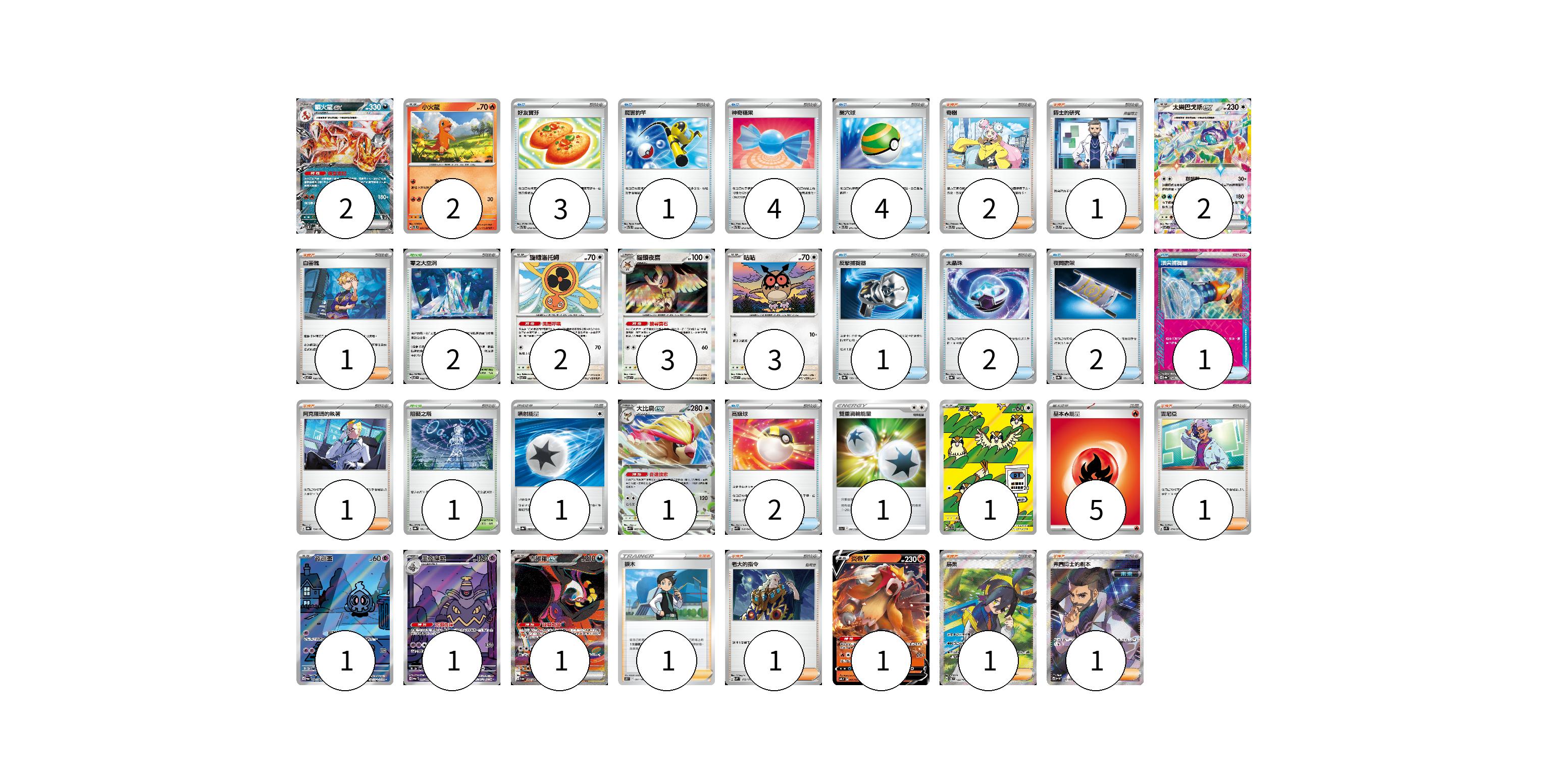 牌組構築方案 以此牌組為基礎新構築牌組 顯示卡面 顯示列表 寶可夢卡(20) 2 2 2 2 3 3 1 1 1 1 1 1 寶可夢道具(2) 2 物品卡(20) 3 1 4 4 1 2 2 1 2 支援者卡(8) 1 1 1 1 1 1 1 1 競技場卡(3) 2 1 能量卡(7) 1 1 5 寶可夢卡(20) 卡牌名稱 張數 卡牌名稱 張數 噴火龍ex SVTL 006/021 02 小火龍 SVTL 001/021 02 太樂巴戈斯ex SV7 088/102 02 旋轉洛托姆 SV7 080/102 02 貓頭夜鷹 SV7 077/102 03 咕咕 SV7 076/102 03 大比鳥ex SVK 005/042 01 波波 SV3 118/108 01 夜巡靈 SV6a 068/064 01 黑夜魔靈 SV6a 070/064 01 吉雉雞ex SV6a 089/064 01 炎帝V SVTL 005/021 01 寶可夢道具(2) 卡牌名稱 張數 卡牌名稱 張數 奇樹 SVTL 018/021 02 物品卡(20) 卡牌名稱 張數 卡牌名稱 張數 好友寶芬 SVTL 010/021 03 厲害釣竿 SVTL 009/021 01 神奇糖果 SVTL 013/021 04 巢穴球 SVTL 011/021 04 反擊捕捉器 SV8a 139/187 01 太晶珠 SV8a 145/187 02 夜間擔架 SV8a 151/187 02 頂尖捕捉器 SV8a 148/187 01 高級球 SVK 018/042 02 支援者卡(8) 卡牌名稱 張數 卡牌名稱 張數 博士的研究 SVTL 019/021 01 白蕾雅 SV7 100/102 01 阿克羅瑪的執著 SV8a 164/187 01 吉尼亞 SV1S 074/078 01 捩木 S11 097/100 01 老大的指令 SVM 172/175 01 烏栗 SV6 122/101 01 弗圖博士的劇本 SV4M 086/066 01 競技場卡(3) 卡牌名稱 張數 卡牌名稱 張數 零之大空洞 SV7 102/102 02 阻礙之塔 SV8a 181/187 01 能量卡(7) 卡牌名稱 張數 卡牌名稱 張數 噴射能量 SV8a 185/187 01 雙重渦輪能量 S11a 067/068 01 基本火能量 sv-p FIR 05 以此牌組為基礎新構築牌組 牌組編碼 kikEuG-DSMoiK-TkprqU copy 列印牌組單 牌組編碼已複製 分享至SNS