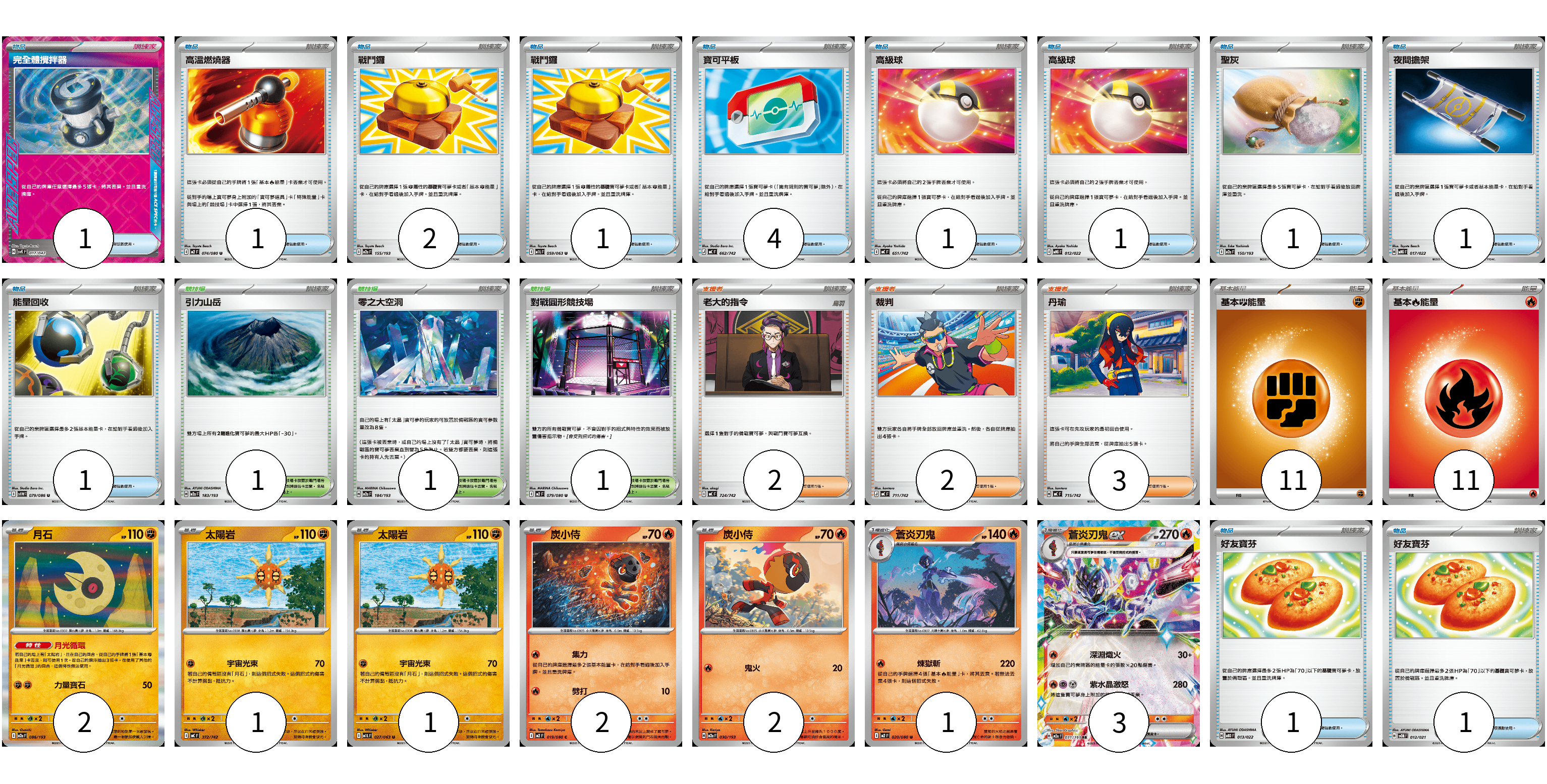 牌組構築方案 以此牌組為基礎新構築牌組 顯示卡面 顯示列表 寶可夢卡(12) 2 1 1 2 2 1 3 物品卡(16) 1 1 2 1 4 1 1 1 1 1 1 1 支援者卡(7) 2 2 3 競技場卡(3) 1 1 1 能量卡(22) 11 11 寶可夢卡(12) 卡牌名稱 張數 卡牌名稱 張數 月石 M2a 086/193 02 太陽岩 MC 372/742 01 太陽岩 M1L 027/063 01 炭小侍 M2 019/080 02 炭小侍 M2a 030/193 02 蒼炎刃鬼 M2 020/080 01 蒼炎刃鬼ex M2a 031/193 03 物品卡(16) 卡牌名稱 張數 卡牌名稱 張數 完全體攪拌器 SVK 017/042 01 高溫燃燒器 M2 074/080 01 戰鬥鑼 M2a 155/193 02 戰鬥鑼 M1L 059/063 01 寶可平板 MC 662/742 04 高級球 MC 651/742 01 高級球 MBG 012/022 01 聖灰 M2a 150/193 01 夜間擔架 MBG 017/022 01 能量回收 SV11W 079/086 01 好友寶芬 MBD 013/022 01 好友寶芬 SVOM 012/021 01 支援者卡(7) 卡牌名稱 張數 卡牌名稱 張數 老大的指令 MC 724/742 02 裁判 MC 711/742 02 丹瑜 MC 715/742 03 競技場卡(3) 卡牌名稱 張數 卡牌名稱 張數 引力山岳 M2a 183/193 01 零之大空洞 M2a 184/193 01 對戰圓形競技場 M2 079/080 01 能量卡(22) 卡牌名稱 張數 卡牌名稱 張數 基本【鬥】能量 MC FIG 11 基本【火】能量 MC FIR 11 以此牌組為基礎新構築牌組 牌組編碼 kuYBry-ViApvT-hjsxdf copy 列印牌組單 牌組編碼已複製 分享至SNS