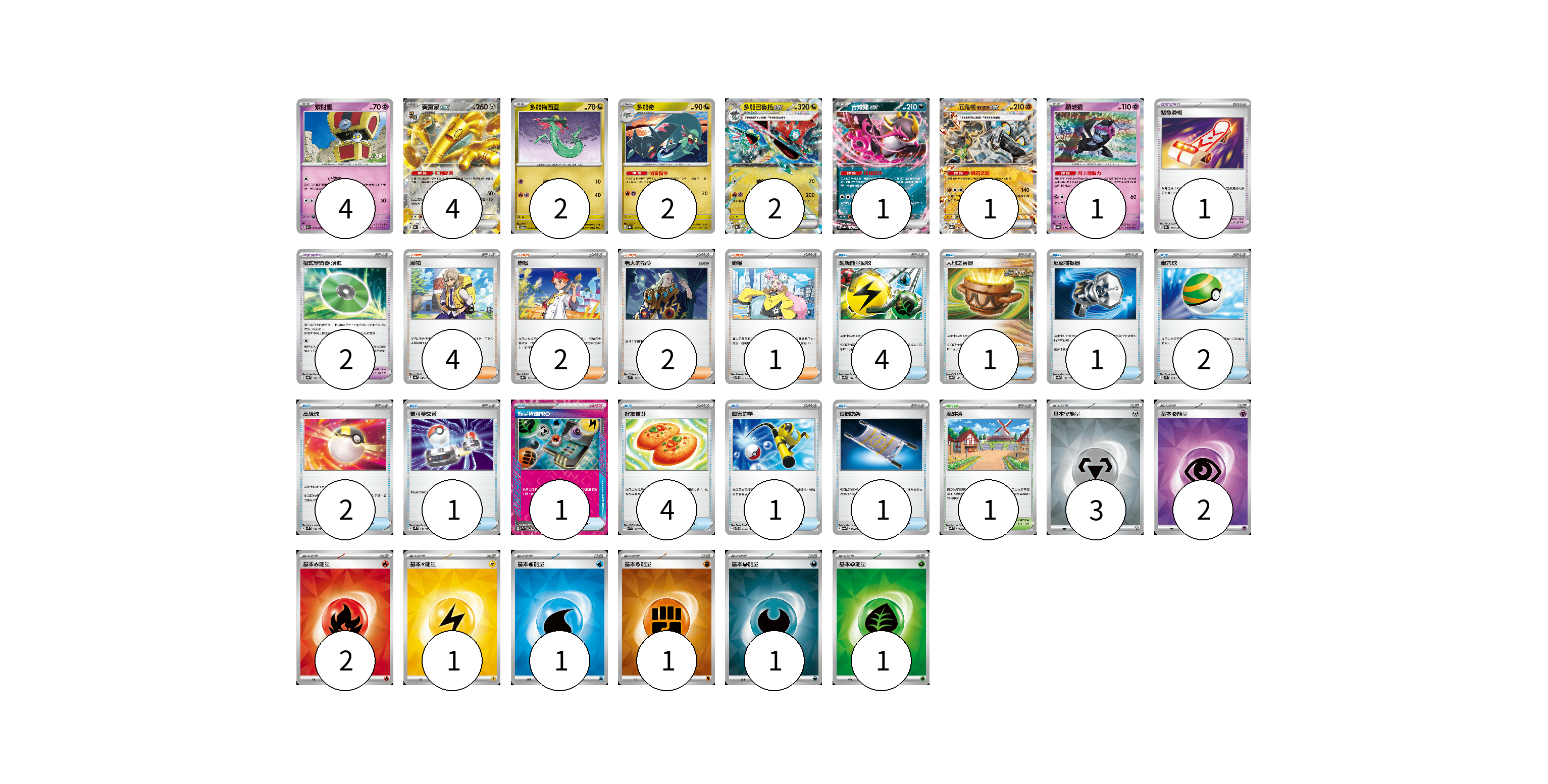 牌組構築方案 以此牌組為基礎新構築牌組 顯示卡面 顯示列表 寶可夢卡(17) 4 4 2 2 2 1 1 1 寶可夢道具(3) 1 2 物品卡(18) 4 1 1 2 2 1 1 4 1 1 支援者卡(9) 4 2 2 1 競技場卡(1) 1 能量卡(12) 3 2 2 1 1 1 1 1 寶可夢卡(17) 卡牌名稱 張數 卡牌名稱 張數 索財靈 SV7a 024/064 04 賽富豪ex SV8a 117/187 04 多龍梅西亞 SV6 079/101 02 多龍奇 SV8a 119/187 02 多龍巴魯托ex SV8a 120/187 02 吉雉雞ex SV8a 104/187 01 厄鬼椪 礎石面具ex SV8a 091/187 01 願增猿 SV8a 075/187 01 寶可夢道具(3) 卡牌名稱 張數 卡牌名稱 張數 緊急滑板 SV8a 153/187 01 招式學習器 演進 SV8a 160/187 02 物品卡(18) 卡牌名稱 張數 卡牌名稱 張數 超級能量回收 SV8a 141/187 04 大地之容器 SV8a 143/187 01 反擊捕捉器 SV8a 139/187 01 巢穴球 SVM 133/175 02 高級球 SVM 134/175 02 寶可夢交替 SVM 136/175 01 能量輸送PRO SV7a 052/064 01 好友寶芬 SVK 015/042 04 厲害釣竿 SVTG 009/019 01 夜間擔架 SV6a 056/064 01 支援者卡(9) 卡牌名稱 張數 卡牌名稱 張數 派帕 SV4a 180/190 04 赤松 SV8a 163/187 02 老大的指令 SVM 172/175 02 奇樹 SVTR 017/021 01 競技場卡(1) 卡牌名稱 張數 卡牌名稱 張數 深缽鎮 SVK 039/042 01 能量卡(12) 卡牌名稱 張數 卡牌名稱 張數 基本【鋼】能量 SVM MET 03 基本【超】能量 SVM PSY 02 基本【火】能量 SVM FIR 02 基本【雷】能量 SVM LIG 01 基本【水】能量 SVM WAT 01 基本【鬥】能量 SVM FIG 01 基本【惡】能量 SVM DAR 01 基本【草】能量 SVM GRA 01 以此牌組為基礎新構築牌組 牌組編碼 kuaScT-OvjIBb-lQKMJP copy 列印牌組單 牌組編碼已複製 分享至SNS