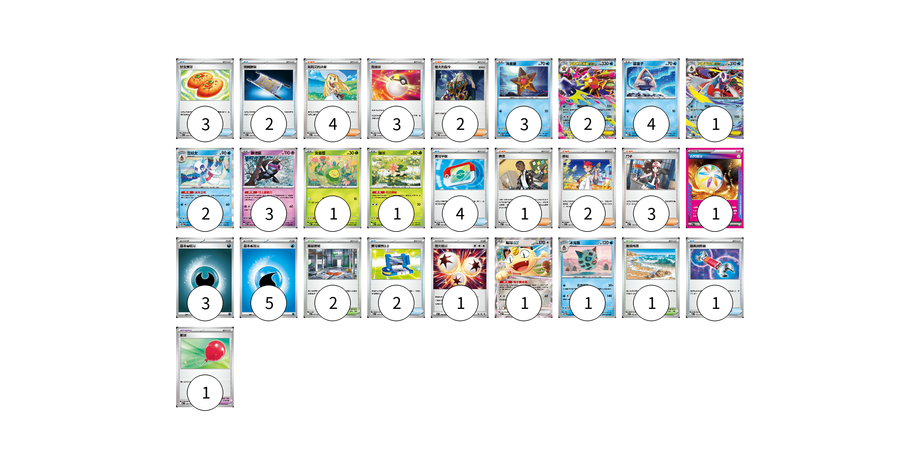 牌組構築方案 以此牌組為基礎新構築牌組 顯示卡面 顯示列表 寶可夢卡(19) 3 2 4 1 2 3 1 1 1 1 寶可夢道具(1) 1 物品卡(15) 3 2 3 4 2 1 支援者卡(12) 4 2 1 2 3 競技場卡(3) 2 1 能量卡(10) 1 3 5 1 寶可夢卡(19) 卡牌名稱 張數 卡牌名稱 張數 海星星 M3 020/080 03 超級寶石海星ex M3 021/080 02 雪童子 M2a 035/193 04 超級雪妖女ex M2a 036/193 01 雪妖女 SV6 033/101 02 願增猿 MC 358/742 03 含羞苞 M2a 011/193 01 謝米 M2a 012/193 01 喵喵ex M3 061/080 01 冰鬼護 SV6 032/101 01 寶可夢道具(1) 卡牌名稱 張數 卡牌名稱 張數 氣球 MC 688/742 01 物品卡(15) 卡牌名稱 張數 卡牌名稱 張數 好友寶芬 MC 648/742 03 夜間擔架 MC 670/742 02 高級球 MBD 014/022 03 寶可平板 M3 070/080 04 寶可裝置3.0 MC 660/742 02 道具拆除器 M2a 151/193 01 支援者卡(12) 卡牌名稱 張數 卡牌名稱 張數 莉莉艾的決意 M2a 175/193 04 老大的指令 MBG 021/022 02 賽吉 MC 714/742 01 赤松 MC 696/742 02 鬥子 MC 718/742 03 競技場卡(3) 卡牌名稱 張數 卡牌名稱 張數 險惡廢墟 M1L 063/063 02 衝浪海灘 M1S 062/063 01 能量卡(10) 卡牌名稱 張數 卡牌名稱 張數 古舊能量 MC 741/742 01 基本【惡】能量 MC DAR 03 基本【水】能量 MC WAT 05 燃火能量 MC 736/742 01 以此牌組為基礎新構築牌組 牌組編碼 kuskBp-JHQsAB-NMGLPW copy 列印牌組單 牌組編碼已複製 分享至SNS