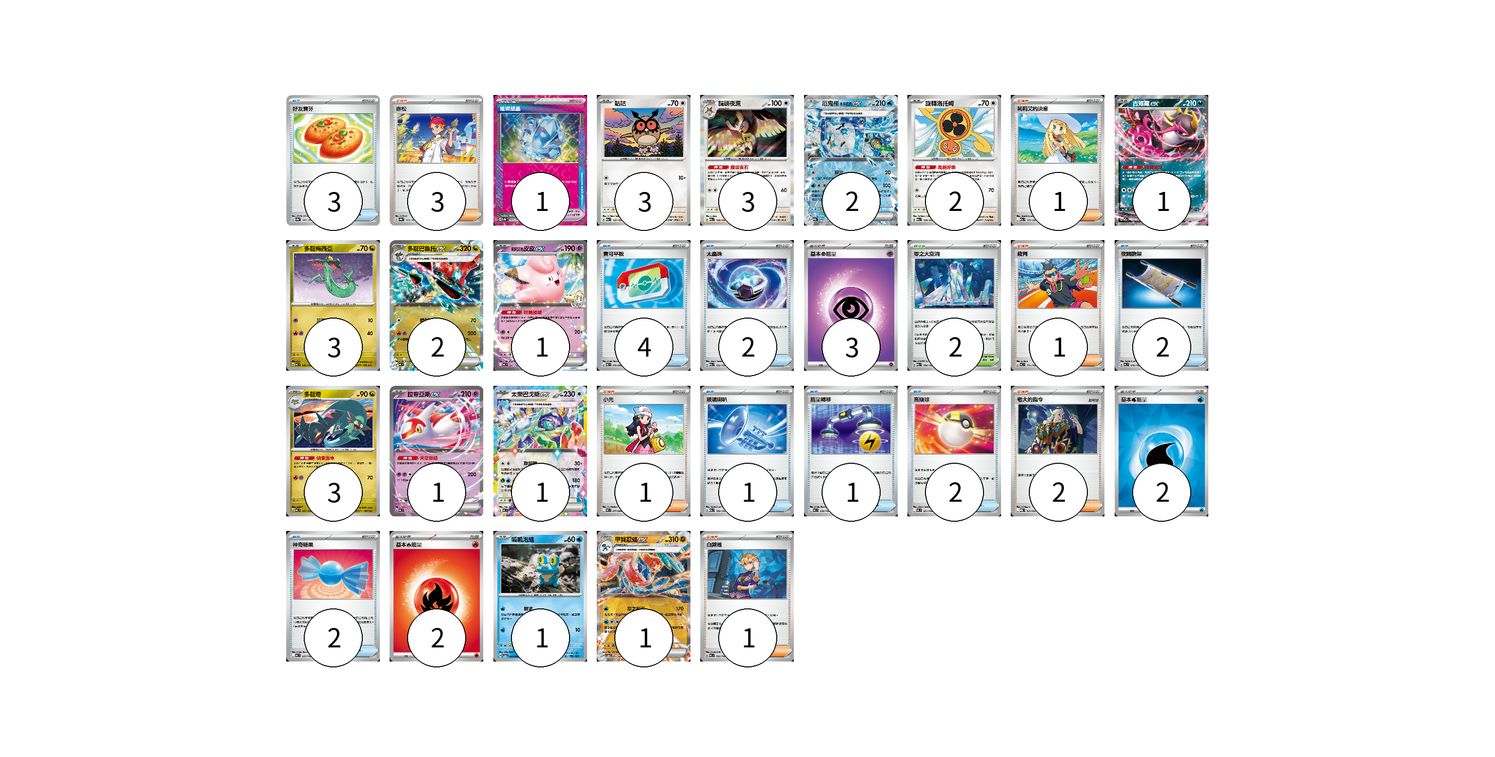 牌組構築方案 以此牌組為基礎新構築牌組 顯示卡面 顯示列表 寶可夢卡(24) 3 3 2 2 1 3 2 1 3 1 1 1 1 寶可夢道具(1) 1 物品卡(17) 3 4 2 2 1 1 2 2 支援者卡(9) 3 1 1 1 2 1 競技場卡(2) 2 能量卡(7) 3 2 2 寶可夢卡(24) 卡牌名稱 張數 卡牌名稱 張數 咕咕 M2a 137/193 03 貓頭夜鷹 M2a 138/193 03 厄鬼椪 水井面具ex SV8a 050/187 02 旋轉洛托姆 M2a 139/193 02 吉雉雞ex M2a 114/193 01 多龍梅西亞 MC 546/742 03 多龍巴魯托ex MC 548/742 02 莉莉艾的皮皮ex MC 287/742 01 多龍奇 MC 547/742 03 拉帝亞斯ex MC 312/742 01 太樂巴戈斯ex MC 630/742 01 呱呱泡蛙 SV5a 023/066 01 甲賀忍蛙ex SV5a 045/066 01 寶可夢道具(1) 卡牌名稱 張數 卡牌名稱 張數 璀璨結晶 SV8a 152/187 01 物品卡(17) 卡牌名稱 張數 卡牌名稱 張數 好友寶芬 SV8a 147/187 03 寶可平板 M3 070/080 04 太晶珠 M2a 152/193 02 夜間擔架 MC 670/742 02 玻璃喇叭 M2a 149/193 01 能量轉移 MC 638/742 01 高級球 MC 651/742 02 神奇糖果 MC 655/742 02 支援者卡(9) 卡牌名稱 張數 卡牌名稱 張數 赤松 SV8a 163/187 03 莉莉艾的決意 M2a 175/193 01 裁判 MC 711/742 01 小光 M2 077/080 01 老大的指令 MBG 021/022 02 白蕾雅 MC 722/742 01 競技場卡(2) 卡牌名稱 張數 卡牌名稱 張數 零之大空洞 M2a 184/193 02 能量卡(7) 卡牌名稱 張數 卡牌名稱 張數 基本【超】能量 MC PSY 03 基本【水】能量 SVM WAT 02 基本【火】能量 MC FIR 02 以此牌組為基礎新構築牌組 牌組編碼 kwesLm-AvoPRT-zIiDHM copy 列印牌組單 牌組編碼已複製 分享至SNS