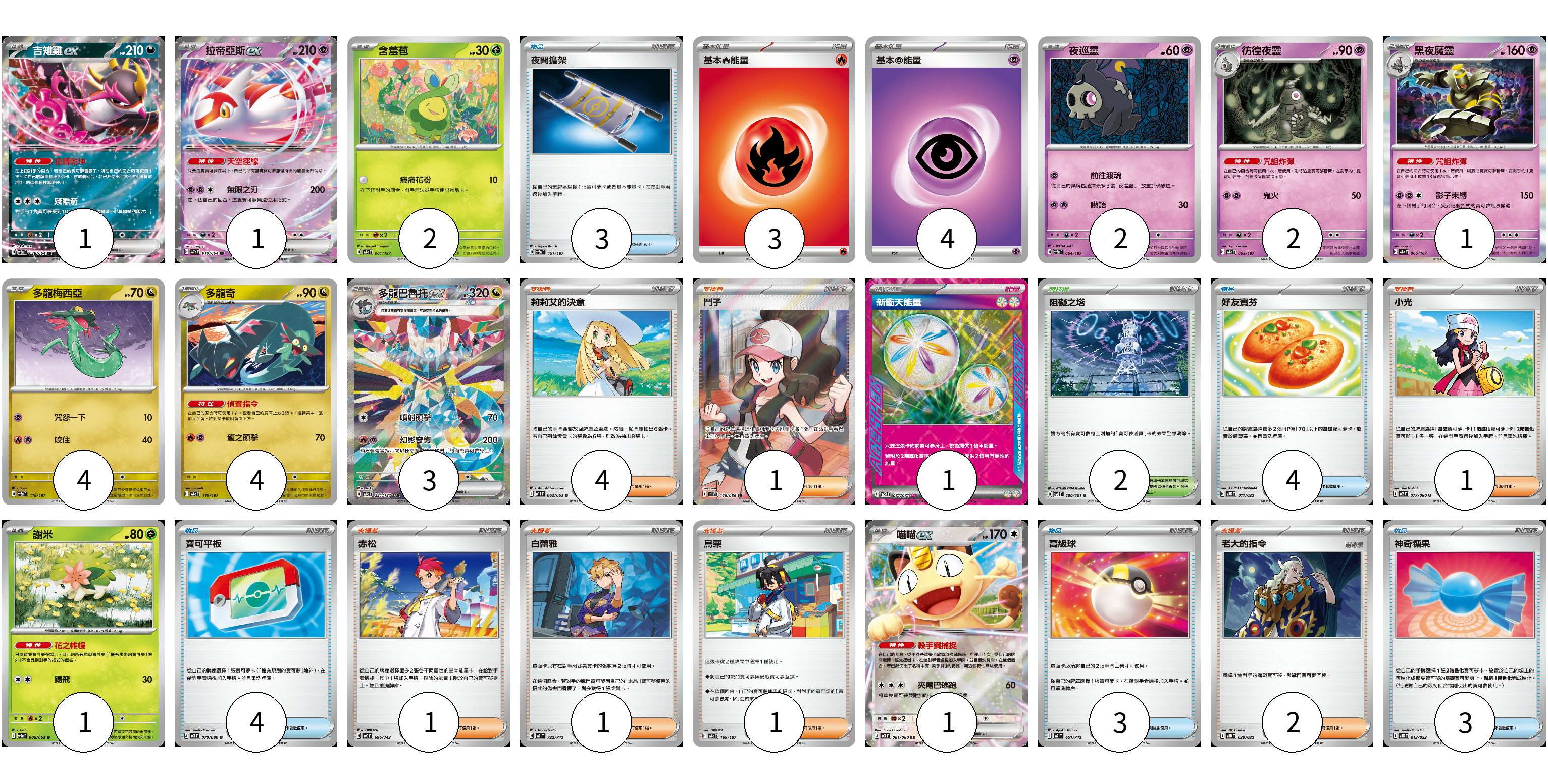 牌組構築方案 以此牌組為基礎新構築牌組 顯示卡面 顯示列表 寶可夢卡(22) 1 1 2 2 2 1 4 4 3 1 1 物品卡(17) 3 4 4 3 3 支援者卡(11) 4 1 1 1 1 1 2 競技場卡(2) 2 能量卡(8) 3 4 1 寶可夢卡(22) 卡牌名稱 張數 卡牌名稱 張數 吉雉雞ex SV6a 038/064 01 拉帝亞斯ex SV7a 019/064 01 含羞苞 SV8a 001/187 02 夜巡靈 SV8a 064/187 02 彷徨夜靈 SV8a 065/187 02 黑夜魔靈 SV8a 066/187 01 多龍梅西亞 SV8a 118/187 04 多龍奇 SV8a 119/187 04 多龍巴魯托ex SV8a 221/187 03 謝米 SV9a 006/063 01 喵喵ex M3 061/080 01 物品卡(17) 卡牌名稱 張數 卡牌名稱 張數 夜間擔架 SV8a 151/187 03 好友寶芬 MBG 011/022 04 寶可平板 M3 070/080 04 高級球 MC 651/742 03 神奇糖果 MBG 013/022 03 支援者卡(11) 卡牌名稱 張數 卡牌名稱 張數 莉莉艾的決意 M1L 062/063 04 鬥子 SV11W 166/086 01 小光 M2 077/080 01 赤松 MC 696/742 01 白蕾雅 MC 722/742 01 烏栗 SV8a 169/187 01 老大的指令 MBD 020/022 02 競技場卡(2) 卡牌名稱 張數 卡牌名稱 張數 阻礙之塔 SV6 100/101 02 能量卡(8) 卡牌名稱 張數 卡牌名稱 張數 基本【火】能量 SVTL FIR 03 基本【超】能量 SVTS PSY 04 新衝天能量 SV5K 071/071 01 以此牌組為基礎新構築牌組 牌組編碼 kxwSrQ-VDAETF-POOXTw copy 列印牌組單 牌組編碼已複製 分享至SNS