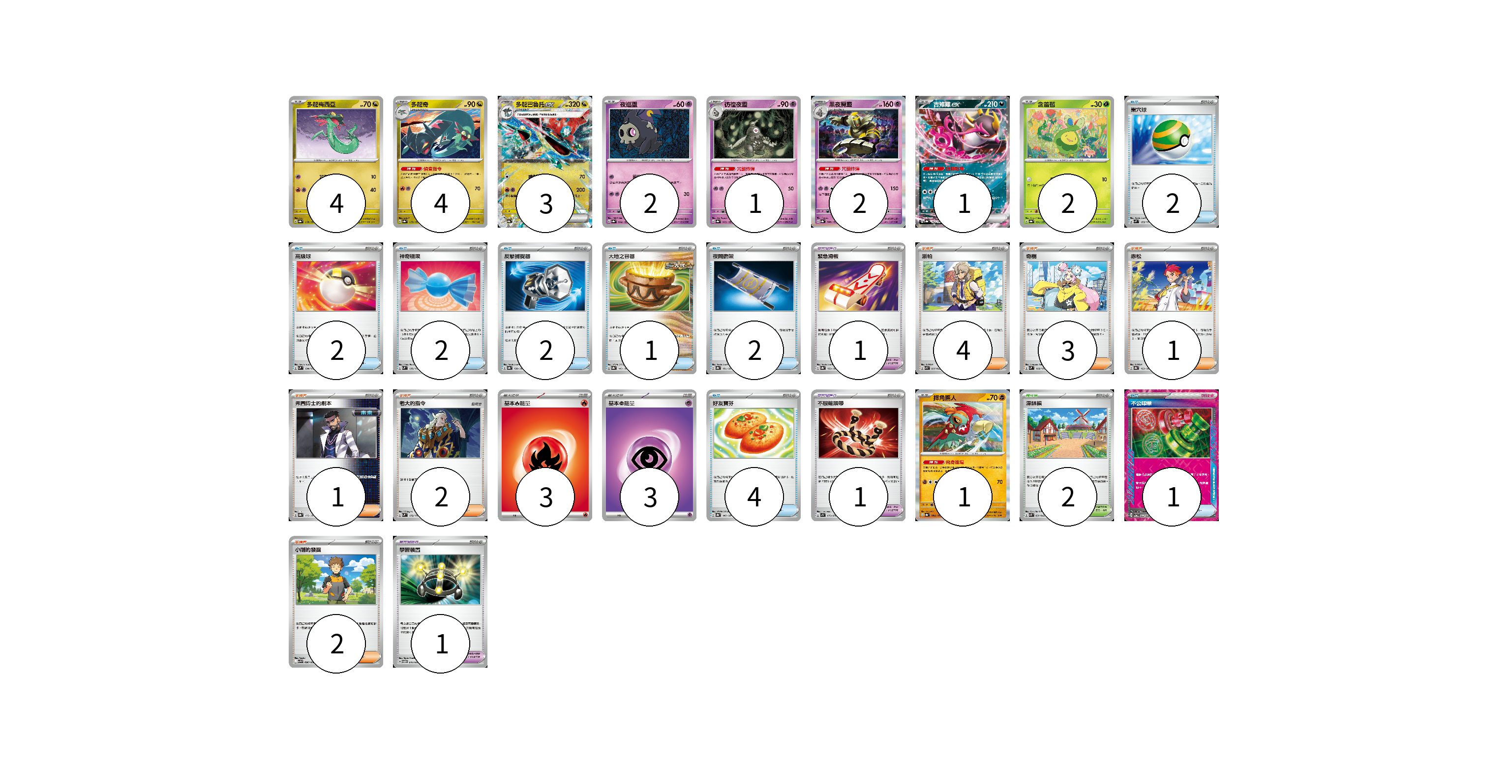 牌組構築方案 以此牌組為基礎新構築牌組 顯示卡面 顯示列表 寶可夢卡(20) 4 4 3 2 1 2 1 2 1 寶可夢道具(3) 1 1 1 物品卡(16) 2 2 2 2 1 2 4 1 支援者卡(13) 4 3 1 1 2 2 競技場卡(2) 2 能量卡(6) 3 3 寶可夢卡(20) 卡牌名稱 張數 卡牌名稱 張數 多龍梅西亞 SV8a 118/187 04 多龍奇 SV8a 119/187 04 多龍巴魯托ex SV8a 120/187 03 夜巡靈 SV8a 064/187 02 彷徨夜靈 SV8a 065/187 01 黑夜魔靈 SV8a 066/187 02 吉雉雞ex SV8a 104/187 01 含羞苞 SV8a 001/187 02 摔角鷹人 SV8a 084/187 01 寶可夢道具(3) 卡牌名稱 張數 卡牌名稱 張數 緊急滑板 SV8a 153/187 01 不服輸頭帶 SV1S 073/078 01 學習裝置 SVTM 016/022 01 物品卡(16) 卡牌名稱 張數 卡牌名稱 張數 巢穴球 SVM 133/175 02 高級球 SVM 134/175 02 神奇糖果 SVM 135/175 02 反擊捕捉器 SV8a 139/187 02 大地之容器 SV8a 143/187 01 夜間擔架 SV8a 151/187 02 好友寶芬 SV8a 147/187 04 不公印章 SV5a 053/066 01 支援者卡(13) 卡牌名稱 張數 卡牌名稱 張數 派帕 SVK 035/042 04 奇樹 SVM 160/175 03 赤松 SV8a 163/187 01 弗圖博士的劇本 SV8a 175/187 01 老大的指令 SVM 172/175 02 小剛的發掘 SV9 096/100 02 競技場卡(2) 卡牌名稱 張數 卡牌名稱 張數 深缽鎮 SVK 039/042 02 能量卡(6) 卡牌名稱 張數 卡牌名稱 張數 基本【火】能量 SVTL FIR 03 基本【超】能量 SVTS PSY 03 以此牌組為基礎新構築牌組 牌組編碼 kyizCd-ikxyiZ-jYHFSr copy 列印牌組單 牌組編碼已複製 分享至SNS
