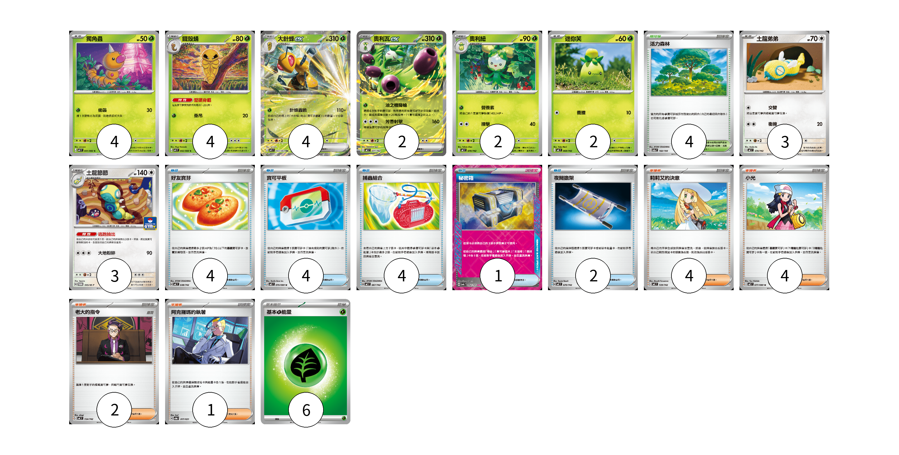 牌組構築方案 以此牌組為基礎新構築牌組 顯示卡面 顯示列表 寶可夢卡(24) 4 4 4 2 2 2 3 3 物品卡(15) 4 4 4 1 2 支援者卡(11) 4 4 2 1 競技場卡(4) 4 能量卡(6) 6 寶可夢卡(24) 卡牌名稱 張數 卡牌名稱 張數 獨角蟲 M4 001/083 04 鐵殼蛹 M4 002/083 04 大針蜂ex M4 003/083 04 奧利瓦ex MC 071/742 02 奧利紐 MC 070/742 02 迷你芙 MC 069/742 02 土龍弟弟 MC 574/742 03 土龍節節 M-P 045/M-P 03 物品卡(15) 卡牌名稱 張數 卡牌名稱 張數 好友寶芬 MC 648/742 04 寶可平板 M3 070/080 04 捕蟲組合 MC 667/742 04 秘密箱 SV6 092/101 01 夜間擔架 MC 670/742 02 支援者卡(11) 卡牌名稱 張數 卡牌名稱 張數 莉莉艾的決意 MC 729/742 04 小光 M2 077/080 04 老大的指令 MC 724/742 02 阿克羅瑪的執著 SVOM 017/021 01 競技場卡(4) 卡牌名稱 張數 卡牌名稱 張數 活力森林 M2a 182/193 04 能量卡(6) 卡牌名稱 張數 卡牌名稱 張數 基本【草】能量 MJ GRA 06 以此牌組為基礎新構築牌組 牌組編碼 lAwPgb-kBmyXT-xnaKuu copy 列印牌組單 牌組編碼已複製 分享至SNS