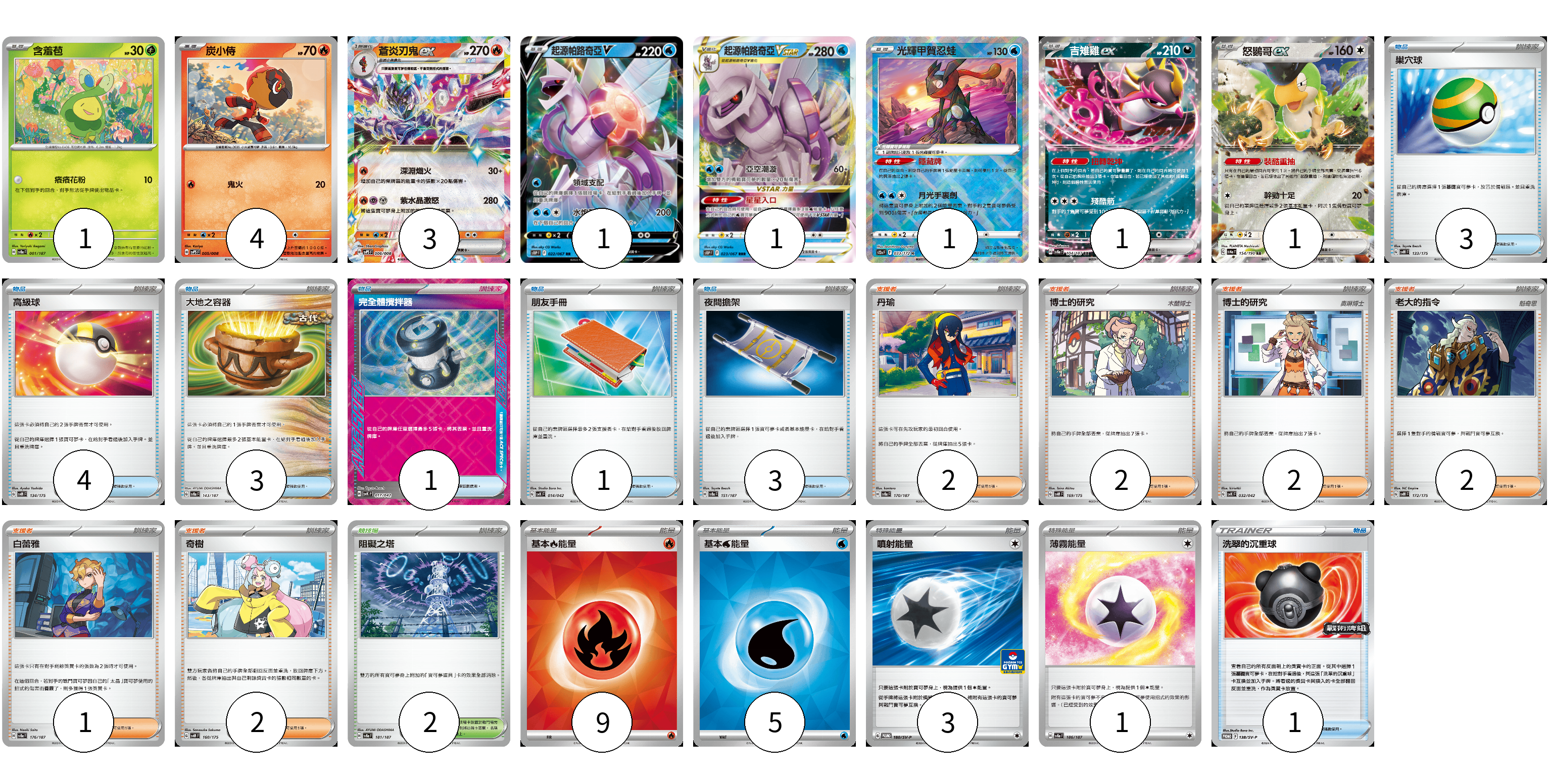 牌組構築方案 以此牌組為基礎新構築牌組 顯示卡面 顯示列表 寶可夢卡(13) 1 4 3 1 1 1 1 1 物品卡(16) 3 4 3 1 1 3 1 支援者卡(11) 2 2 2 2 1 2 競技場卡(2) 2 能量卡(18) 9 5 3 1 寶可夢卡(13) 卡牌名稱 張數 卡牌名稱 張數 含羞苞 SV8a 001/187 01 炭小侍 SVPS 005/008 04 蒼炎刃鬼ex SVPS 006/008 03 起源帕路奇亞V S10P 022/067 01 起源帕路奇亞VSTAR S10P 023/067 01 光輝甲賀忍蛙 S12a 033/172 01 吉雉雞ex SV8a 104/187 01 怒鸚哥ex SV4a 154/190 01 物品卡(16) 卡牌名稱 張數 卡牌名稱 張數 巢穴球 SVM 133/175 03 高級球 SVM 134/175 04 大地之容器 SV8a 143/187 03 完全體攪拌器 SVK 017/042 01 朋友手冊 SVK 014/042 01 夜間擔架 SV8a 151/187 03 洗翠的沉重球 SV-P 138/SV-P 01 支援者卡(11) 卡牌名稱 張數 卡牌名稱 張數 丹瑜 SV8a 170/187 02 博士的研究 SVM 169/175 02 博士的研究 SVK 032/042 02 老大的指令 SVM 172/175 02 白蕾雅 SV8a 176/187 01 奇樹 SVM 160/175 02 競技場卡(2) 卡牌名稱 張數 卡牌名稱 張數 阻礙之塔 SV8a 181/187 02 能量卡(18) 卡牌名稱 張數 卡牌名稱 張數 基本【火】能量 SVK FIR 09 基本【水】能量 SVK WAT 05 噴射能量 SV-P 180/SV-P 03 薄霧能量 SV8a 186/187 01 以此牌組為基礎新構築牌組 牌組編碼 lCBtRI-suLZuJ-qsmDAr copy 列印牌組單 牌組編碼已複製 分享至SNS