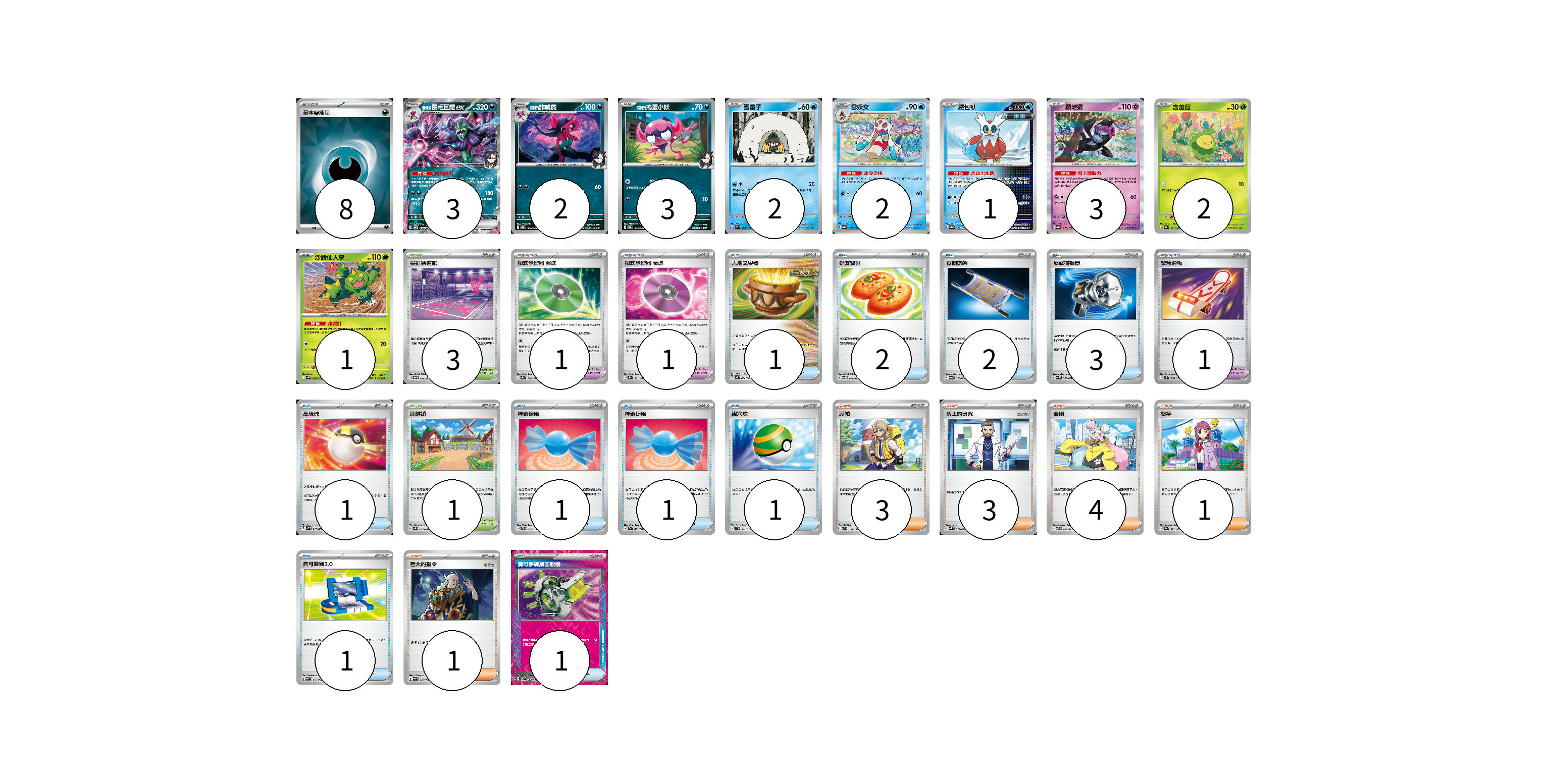 牌組構築方案 以此牌組為基礎新構築牌組 顯示卡面 顯示列表 寶可夢卡(19) 3 2 3 2 2 1 3 2 1 寶可夢道具(7) 1 1 1 4 物品卡(14) 1 2 2 3 1 1 1 1 1 1 支援者卡(8) 3 3 1 1 競技場卡(4) 3 1 能量卡(8) 8 寶可夢卡(19) 卡牌名稱 張數 卡牌名稱 張數 <瑪俐的>長毛巨魔ex SVOM 007/021 03 <瑪俐的>詐唬魔 SVOM 006/021 02 <瑪俐的>搗蛋小妖 SVOM 005/021 03 雪童子 SVM 034/175 02 雪妖女 SV8a 038/187 02 鐵包袱 SV8a 047/187 01 願增猿 SV8a 075/187 03 含羞苞 SV8a 001/187 02 沙鈴仙人掌 SV9 006/100 01 寶可夢道具(7) 卡牌名稱 張數 卡牌名稱 張數 招式學習器 演進 SV8a 160/187 01 招式學習器 衰退 SV8a 161/187 01 緊急滑板 SV5K 064/071 01 奇樹 SVTL 018/021 04 物品卡(14) 卡牌名稱 張數 卡牌名稱 張數 大地之容器 SV4K 060/066 01 好友寶芬 SVTM 011/022 02 夜間擔架 SV6a 056/064 02 反擊捕捉器 SV4M 059/066 03 高級球 SVHM 013/022 01 神奇糖果 SVTS 015/022 01 神奇糖果 SV3a 053/062 01 巢穴球 SVC 013/021 01 寶可裝置3.0 SVAW 016/023 01 寶可夢旋風回收機 SV6 093/101 01 支援者卡(8) 卡牌名稱 張數 卡牌名稱 張數 派帕 SVD 137/139 03 博士的研究 SVK 033/042 03 紫竽 SV8a 171/187 01 老大的指令 SVHM 022/022 01 競技場卡(4) 卡牌名稱 張數 卡牌名稱 張數 尖釘鎮道館 SVOM 021/021 03 深缽鎮 SVF 036/038 01 能量卡(8) 卡牌名稱 張數 卡牌名稱 張數 基本【惡】能量 SVOM DAR 08 以此牌組為基礎新構築牌組 牌組編碼 lDAiep-WJNIJo-SoPICu copy 列印牌組單 牌組編碼已複製 分享至SNS