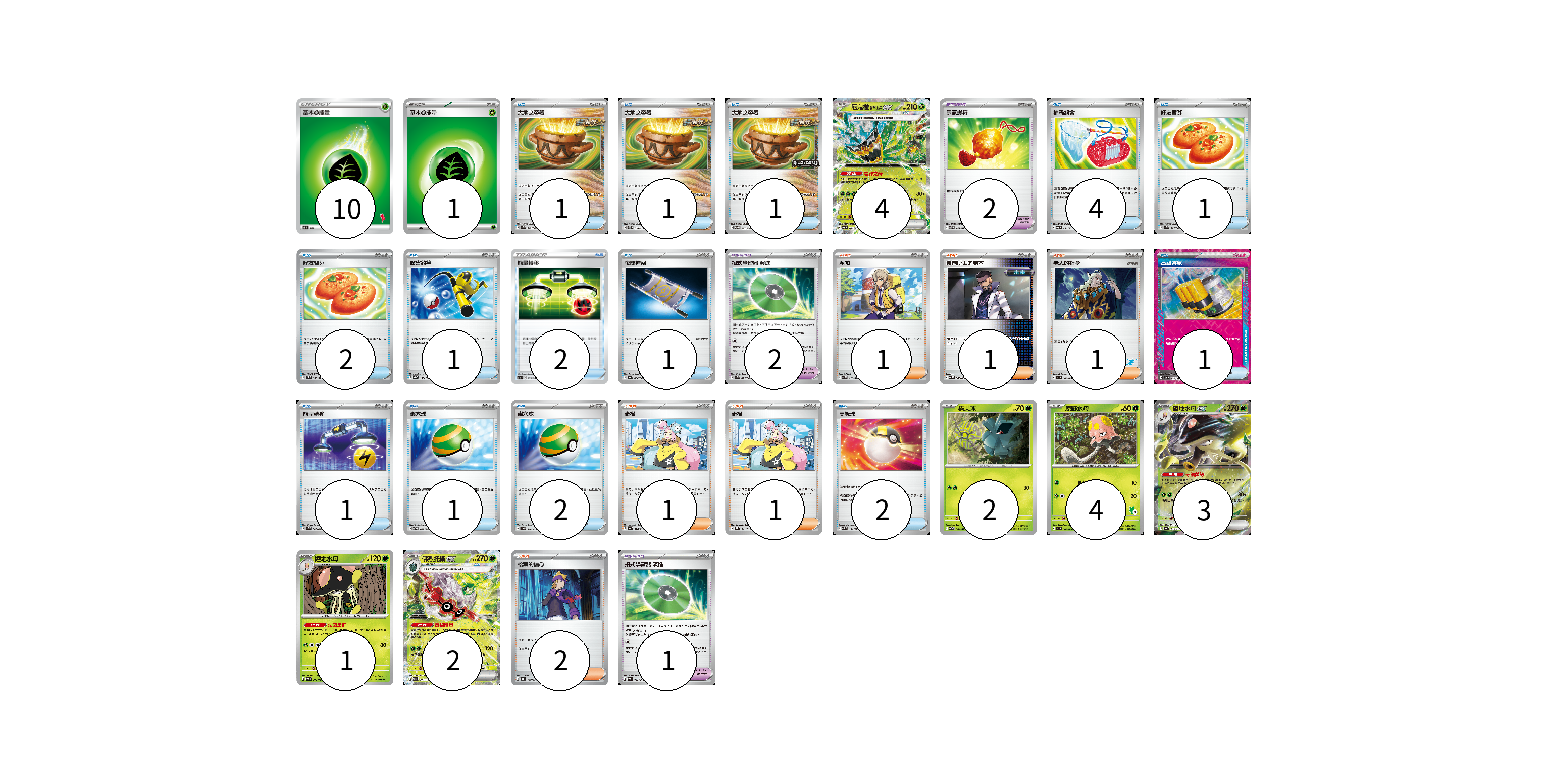 牌組構築方案 以此牌組為基礎新構築牌組 顯示卡面 顯示列表 寶可夢卡(16) 4 2 4 3 1 2 寶可夢道具(5) 2 2 1 物品卡(21) 1 1 1 4 1 2 1 2 1 1 1 1 2 2 支援者卡(7) 1 1 1 1 1 2 能量卡(11) 10 1 寶可夢卡(16) 卡牌名稱 張數 卡牌名稱 張數 厄鬼椪 碧草面具ex SV6 016/101 04 榛果球 SV2D 004/071 02 原野水母 SVI 005/066 04 陸地水母ex SV4a 019/190 03 陸地水母 SV4M 008/066 01 佛烈托斯ex SV4a 009/190 02 寶可夢道具(5) 卡牌名稱 張數 卡牌名稱 張數 勇氣護符 SVTS 017/022 02 招式學習器 演進 SVK 025/042 02 招式學習器 演進 SV4M 063/066 01 物品卡(21) 卡牌名稱 張數 卡牌名稱 張數 大地之容器 SVK 012/042 01 大地之容器 SVTG 010/019 01 大地之容器 SV-P 137/SV-P 01 捕蟲組合 SV6 094/101 04 好友寶芬 SVK 015/042 01 好友寶芬 SV5K 063/071 02 厲害釣竿 SV4a 158/190 01 能量轉移 S11a 059/068 02 夜間擔架 SV6a 056/064 01 高級香氛 SV5a 055/066 01 能量轉移 SVK 008/042 01 巢穴球 SVTG 012/019 01 巢穴球 SVD 118/139 02 高級球 SVM 134/175 02 支援者卡(7) 卡牌名稱 張數 卡牌名稱 張數 派帕 SV1V 076/078 01 弗圖博士的劇本 SV4M 065/066 01 老大的指令 SVI 066/066 01 奇樹 SV4a 174/190 01 奇樹 SVHK 019/022 01 松葉的信心 SV5K 069/071 02 能量卡(11) 卡牌名稱 張數 卡牌名稱 張數 基本草能量 SH GRA 10 基本草能量 sv-p GRA 01 以此牌組為基礎新構築牌組 牌組編碼 lDqxdw-UdYOoI-ThHwUH copy 列印牌組單 牌組編碼已複製 分享至SNS