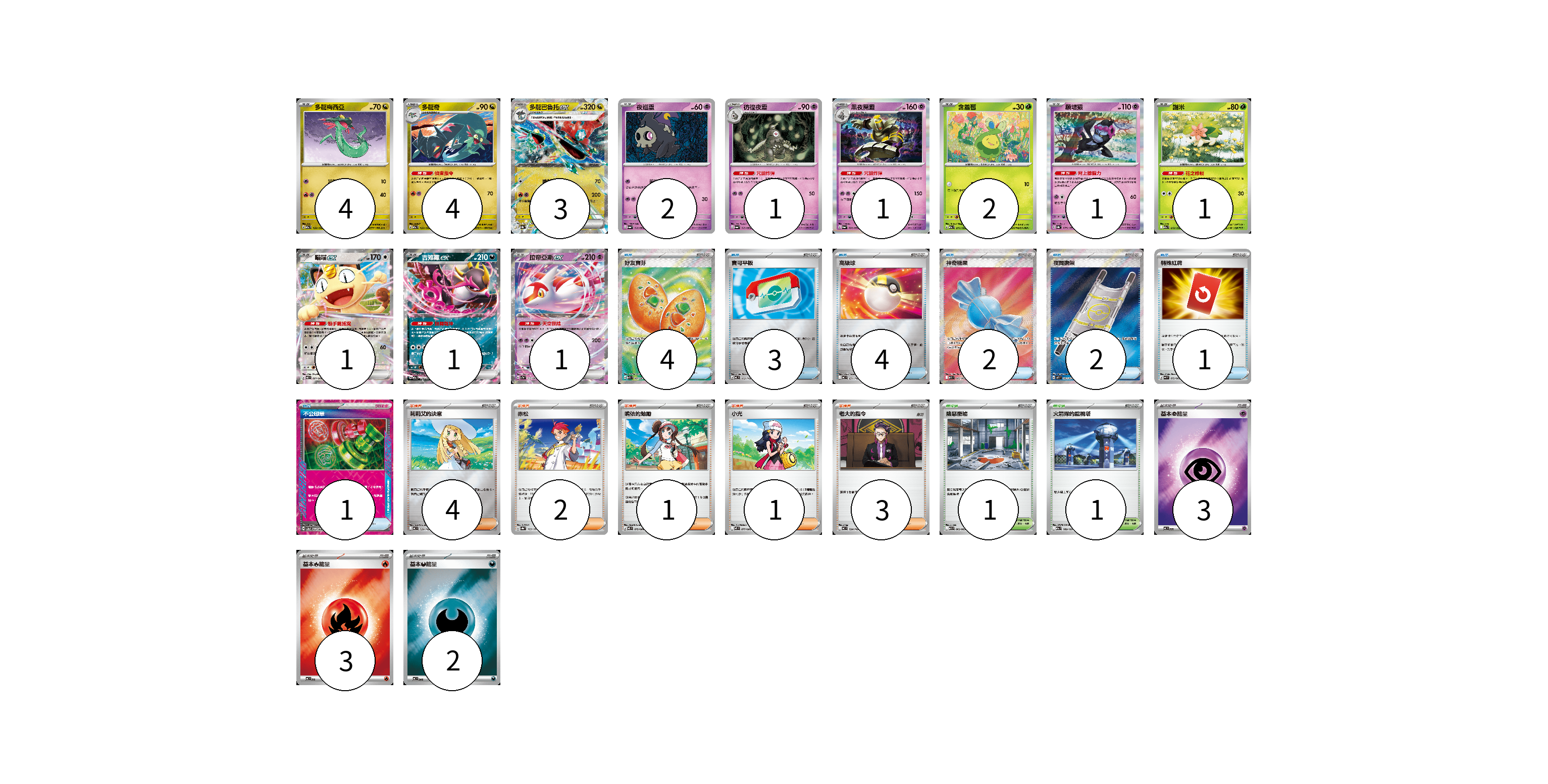 牌組構築方案 以此牌組為基礎新構築牌組 顯示卡面 顯示列表 寶可夢卡(22) 4 4 3 2 1 1 2 1 1 1 1 1 物品卡(17) 4 3 4 2 2 1 1 支援者卡(11) 4 2 1 1 3 競技場卡(2) 1 1 能量卡(8) 3 3 2 寶可夢卡(22) 卡牌名稱 張數 卡牌名稱 張數 多龍梅西亞 M2a 132/193 04 多龍奇 M2a 133/193 04 多龍巴魯托ex SV8a 120/187 03 夜巡靈 SV6a 018/064 02 彷徨夜靈 SV6a 019/064 01 黑夜魔靈 SV6a 020/064 01 含羞苞 M2a 011/193 02 願增猿 SV8a 075/187 01 謝米 M2a 012/193 01 喵喵ex M3 061/080 01 吉雉雞ex M2a 114/193 01 拉帝亞斯ex SV7a 019/064 01 物品卡(17) 卡牌名稱 張數 卡牌名稱 張數 好友寶芬 M1S 081/063 04 寶可平板 MC 662/742 03 高級球 MC 651/742 04 神奇糖果 M1S 082/063 02 夜間擔架 M1L 083/063 02 特殊紅牌 M4 072/083 01 不公印章 SV5a 053/066 01 支援者卡(11) 卡牌名稱 張數 卡牌名稱 張數 莉莉艾的決意 MC 729/742 04 赤松 SV8a 163/187 02 鳴依的勉勵 M3 075/080 01 小光 M2 077/080 01 老大的指令 MC 724/742 03 競技場卡(2) 卡牌名稱 張數 卡牌名稱 張數 險惡廢墟 M1L 063/063 01 火箭隊的監視塔 M2a 189/193 01 能量卡(8) 卡牌名稱 張數 卡牌名稱 張數 基本【超】能量 MC PSY 03 基本【火】能量 MC FIR 03 基本【惡】能量 MC DAR 02 以此牌組為基礎新構築牌組 牌組編碼 lIzKHJ-aknstg-WUgbXi copy 列印牌組單 牌組編碼已複製 分享至SNS