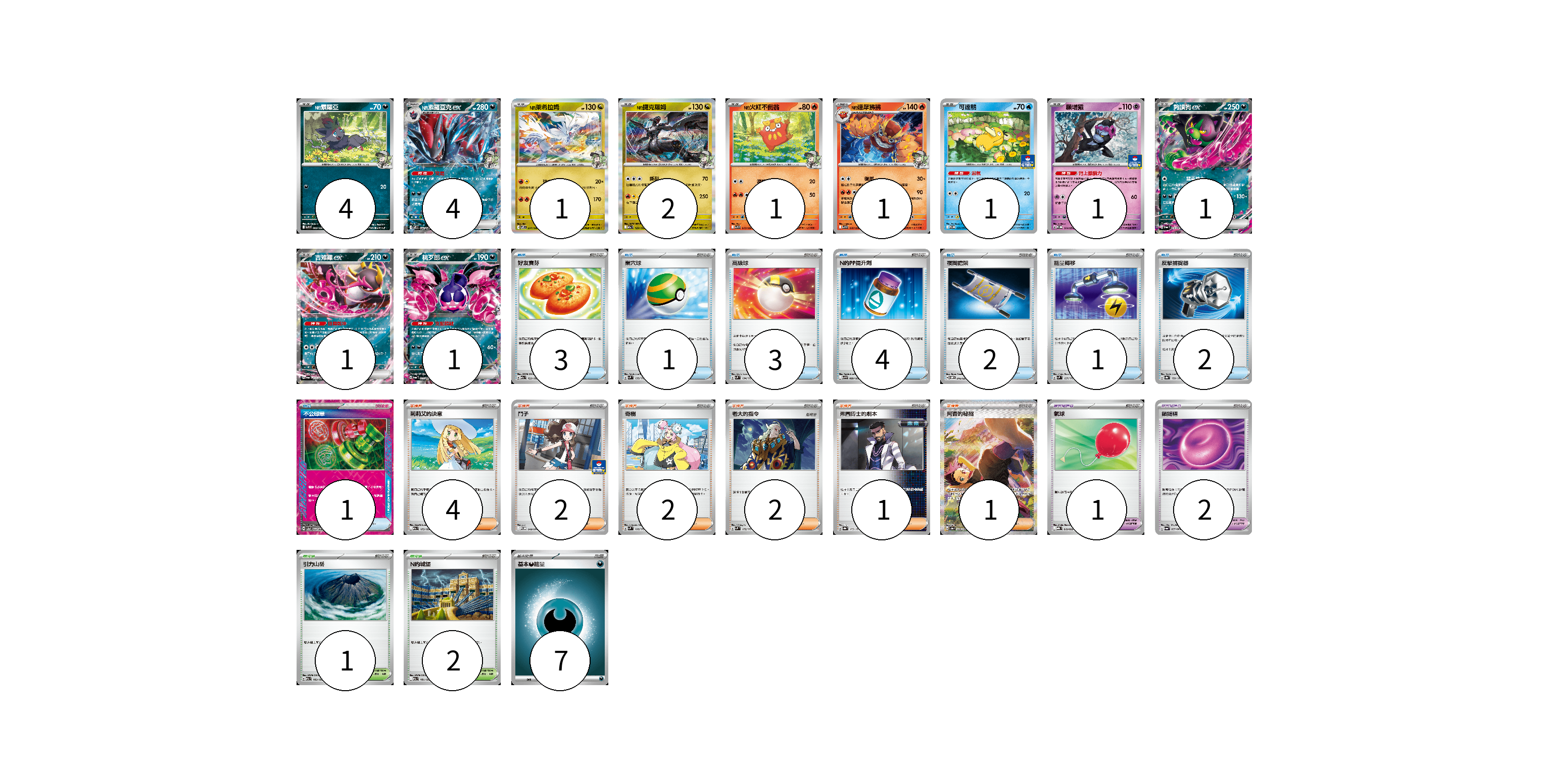 牌組構築方案 以此牌組為基礎新構築牌組 顯示卡面 顯示列表 寶可夢卡(18) 4 4 1 2 1 1 1 1 1 1 1 寶可夢道具(3) 1 2 物品卡(17) 3 1 3 4 2 1 2 1 支援者卡(12) 4 2 2 2 1 1 競技場卡(3) 1 2 能量卡(7) 7 寶可夢卡(18) 卡牌名稱 張數 卡牌名稱 張數 N的索羅亞 SV9 060/100 04 N的索羅亞克ex SV9 061/100 04 N的萊希拉姆 SV9 074/100 01 N的捷克羅姆 M2a 129/193 02 N的火紅不倒翁 SV9 015/100 01 N的達摩狒狒 SV9 016/100 01 可達鴨 SV-P 220/SV-P 01 願增猿 M-P 014/M-P 01 夠讚狗ex SV6a 036/064 01 吉雉雞ex SV6a 038/064 01 桃歹郎ex SV6a 039/064 01 寶可夢道具(3) 卡牌名稱 張數 卡牌名稱 張數 氣球 MBG 019/022 01 鎖鏈糬 SV6a 057/064 02 物品卡(17) 卡牌名稱 張數 卡牌名稱 張數 好友寶芬 M2a 153/193 03 巢穴球 SVM 133/175 01 高級球 SVM 134/175 03 N的PP提升劑 SV9 089/100 04 夜間擔架 SVOM 016/021 02 能量轉移 SVM 127/175 01 反擊捕捉器 SV8a 139/187 02 不公印章 SV5a 053/066 01 支援者卡(12) 卡牌名稱 張數 卡牌名稱 張數 莉莉艾的決意 M2a 175/193 04 鬥子 M-P 048/M-P 02 奇樹 SVM 160/175 02 老大的指令 SVM 172/175 02 弗圖博士的劇本 SV8a 175/187 01 阿杏的秘招 SV8a 228/187 01 競技場卡(3) 卡牌名稱 張數 卡牌名稱 張數 引力山岳 M2a 183/193 01 N的城堡 M2a 181/193 02 能量卡(7) 卡牌名稱 張數 卡牌名稱 張數 基本【惡】能量 MBG DAR 07 以此牌組為基礎新構築牌組 牌組編碼 lNkdMh-qYRLsJ-SSWizp copy 列印牌組單 牌組編碼已複製 分享至SNS