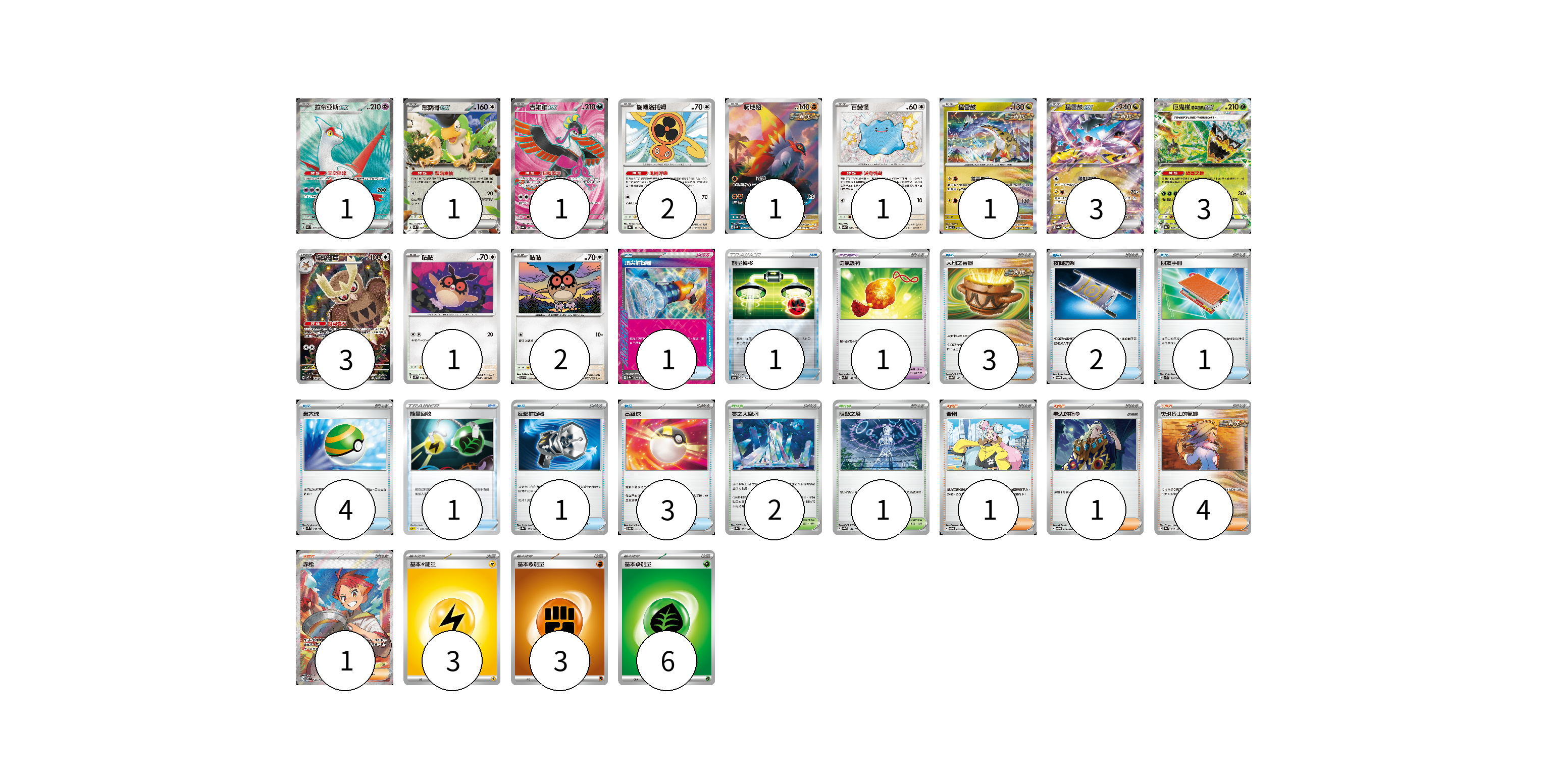 牌組構築方案 以此牌組為基礎新構築牌組 顯示卡面 顯示列表 寶可夢卡(20) 1 1 1 2 1 1 1 3 3 3 1 2 寶可夢道具(1) 1 物品卡(17) 1 1 3 2 1 4 1 1 3 支援者卡(7) 1 1 4 1 競技場卡(3) 2 1 能量卡(12) 3 3 6 寶可夢卡(20) 卡牌名稱 張數 卡牌名稱 張數 拉帝亞斯ex SV7a 078/064 01 怒鸚哥ex SVK 006/042 01 吉雉雞ex SV6a 081/064 01 旋轉洛托姆 SV8a 131/187 02 爬地翅 SV4K 074/066 01 百變怪 SV4a 309/190 01 猛雷鼓 SV7 075/102 01 猛雷鼓ex SV8a 124/187 03 厄鬼椪 碧草面具ex SV8a 020/187 03 貓頭夜鷹 SV7 114/102 03 咕咕 SV5K 054/071 01 咕咕 SV7 076/102 02 寶可夢道具(1) 卡牌名稱 張數 卡牌名稱 張數 勇氣護符 SVM 142/175 01 物品卡(17) 卡牌名稱 張數 卡牌名稱 張數 頂尖捕捉器 SV8a 148/187 01 能量轉移 SO 017/030 01 大地之容器 SV8a 143/187 03 夜間擔架 SVOM 016/021 02 朋友手冊 SVK 014/042 01 巢穴球 SVM 133/175 04 能量回收 SDP 013/022 01 反擊捕捉器 SV8a 139/187 01 高級球 SVOD 012/020 03 支援者卡(7) 卡牌名稱 張數 卡牌名稱 張數 奇樹 SVOD 016/020 01 老大的指令 SVOD 019/020 01 奧琳博士的氣魄 SV8a 167/187 04 赤松 SV7 123/102 01 競技場卡(3) 卡牌名稱 張數 卡牌名稱 張數 零之大空洞 SV8a 182/187 02 阻礙之塔 SV8a 181/187 01 能量卡(12) 卡牌名稱 張數 卡牌名稱 張數 基本雷能量 sv-p LIG 03 基本鬥能量 sv-p FIG 03 基本草能量 sv-p GRA 06 以此牌組為基礎新構築牌組 牌組編碼 lSDNBf-OmhAYv-kiqfwn copy 列印牌組單 牌組編碼已複製 分享至SNS