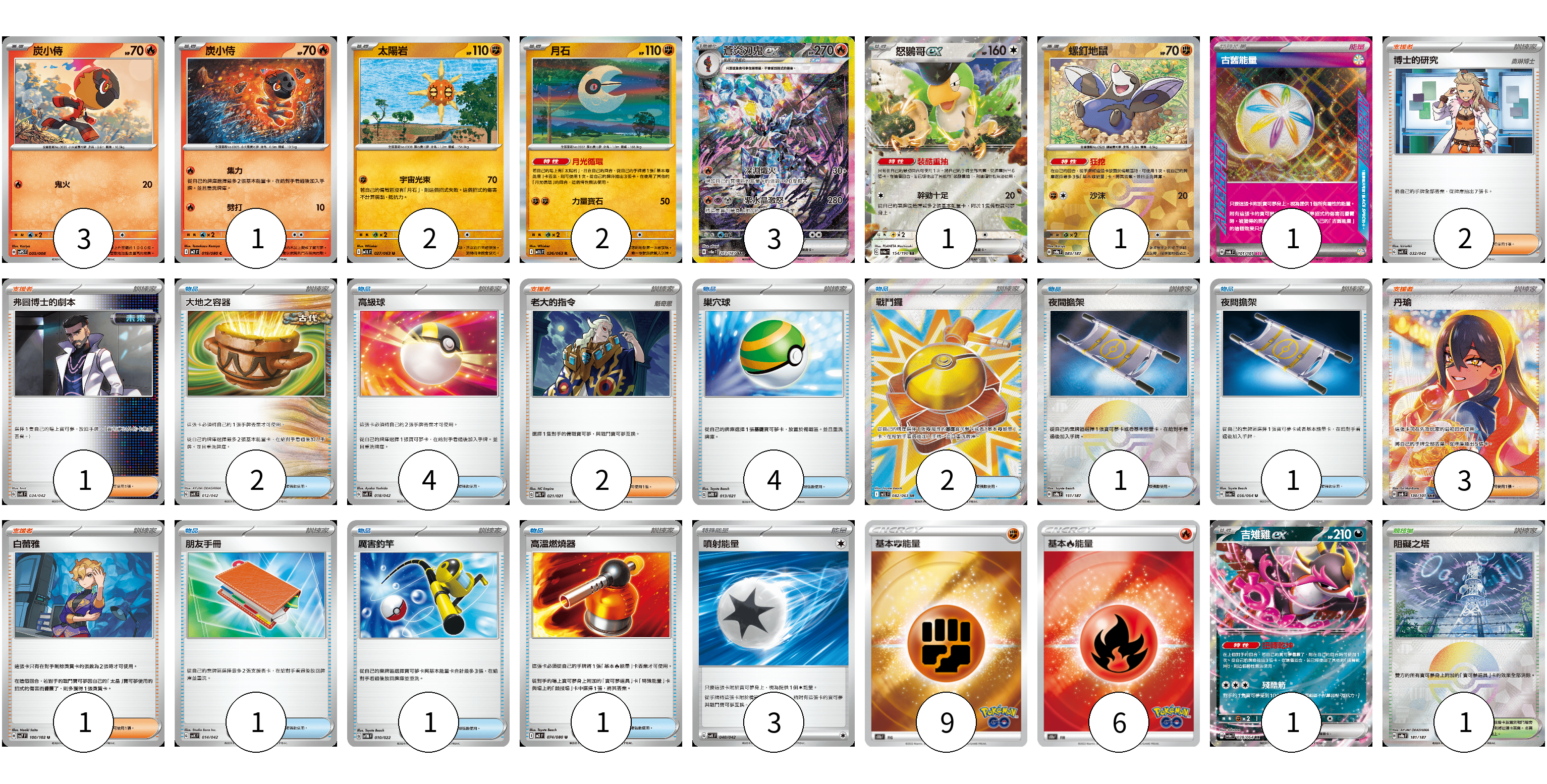 牌組構築方案 以此牌組為基礎新構築牌組 顯示卡面 顯示列表 寶可夢卡(14) 3 1 2 2 3 1 1 1 物品卡(17) 2 4 4 2 1 1 1 1 1 支援者卡(9) 2 1 2 3 1 競技場卡(1) 1 能量卡(19) 1 3 9 6 寶可夢卡(14) 卡牌名稱 張數 卡牌名稱 張數 炭小侍 SVPS 005/008 03 炭小侍 M2 019/080 01 太陽岩 M1L 027/063 02 月石 M1L 026/063 02 蒼炎刃鬼ex SV8a 203/187 03 怒鸚哥ex SV4a 154/190 01 螺釘地鼠 SV8a 083/187 01 吉雉雞ex SV6a 038/064 01 物品卡(17) 卡牌名稱 張數 卡牌名稱 張數 大地之容器 SVK 012/042 02 高級球 SVK 018/042 04 巢穴球 SVTR 013/021 04 戰鬥鑼 M1L 082/063 02 夜間擔架 SV8a 151/187 01 夜間擔架 SV6a 056/064 01 朋友手冊 SVK 014/042 01 厲害釣竿 SVTM 010/022 01 高溫燃燒器 M2 074/080 01 支援者卡(9) 卡牌名稱 張數 卡牌名稱 張數 博士的研究 SVK 032/042 02 弗圖博士的劇本 SVK 034/042 01 老大的指令 SVTL 021/021 02 丹瑜 SV6 130/101 03 白蕾雅 SV7 100/102 01 競技場卡(1) 卡牌名稱 張數 卡牌名稱 張數 阻礙之塔 SV8a 181/187 01 能量卡(19) 卡牌名稱 張數 卡牌名稱 張數 古舊能量 SV6 101/101 01 噴射能量 SVK 040/042 03 基本鬥能量 S10b FIG 09 基本火能量 S10b FIR 06 以此牌組為基礎新構築牌組 牌組編碼 lTRNWn-ywmbDu-UVarjq copy 列印牌組單 牌組編碼已複製 分享至SNS