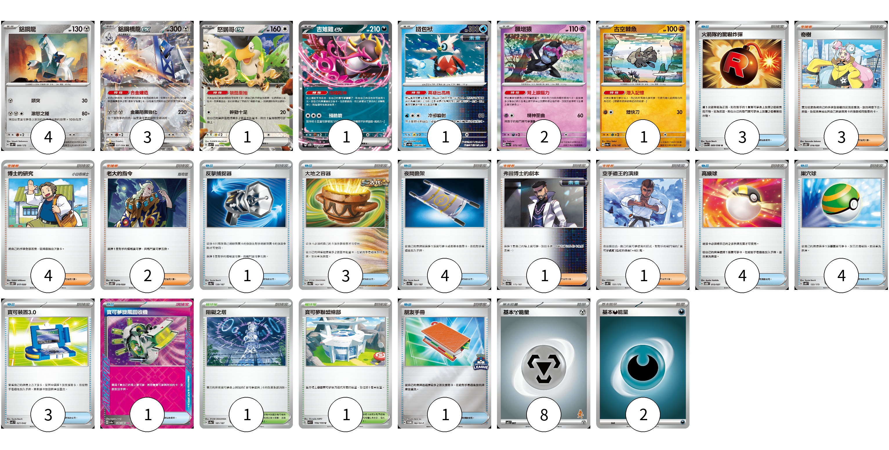 牌組構築方案 以此牌組為基礎新構築牌組 顯示卡面 顯示列表 寶可夢卡(13) 4 3 1 1 1 2 1 物品卡(24) 3 1 3 4 4 4 3 1 1 支援者卡(11) 3 4 2 1 1 競技場卡(2) 1 1 能量卡(10) 8 2 寶可夢卡(13) 卡牌名稱 張數 卡牌名稱 張數 鋁鋼龍 SVM 088/175 04 鋁鋼橋龍ex SV7a 037/064 03 怒鸚哥ex SVK 006/042 01 吉雉雞ex SVOD 004/020 01 鐵包袱 SV4M 020/066 01 願增猿 SV8a 075/187 02 古空棘魚 SV8a 079/187 01 物品卡(24) 卡牌名稱 張數 卡牌名稱 張數 火箭隊的驚嚇炸彈 SV10 089/098 03 反擊捕捉器 SV8a 139/187 01 大地之容器 SV8a 143/187 03 夜間擔架 SV8a 151/187 04 高級球 SVOM 013/021 04 巢穴球 SVM 133/175 04 寶可裝置3.0 SVK 021/042 03 寶可夢旋風回收機 SV8a 149/187 01 朋友手冊 SV-P 182/SV-P 01 支援者卡(11) 卡牌名稱 張數 卡牌名稱 張數 奇樹 SVOD 016/020 03 博士的研究 SVOD 017/020 04 老大的指令 SVOD 019/020 02 弗圖博士的劇本 SV8a 175/187 01 空手道王的演練 SVM 151/175 01 競技場卡(2) 卡牌名稱 張數 卡牌名稱 張數 阻礙之塔 SV8a 181/187 01 寶可夢聯盟總部 SV3 108/108 01 能量卡(10) 卡牌名稱 張數 卡牌名稱 張數 基本【鋼】能量 SVI MET 08 基本【惡】能量 SVF DAR 02 以此牌組為基礎新構築牌組 牌組編碼 lTiXLR-fXRzVH-kkjCiG copy 列印牌組單 牌組編碼已複製 分享至SNS