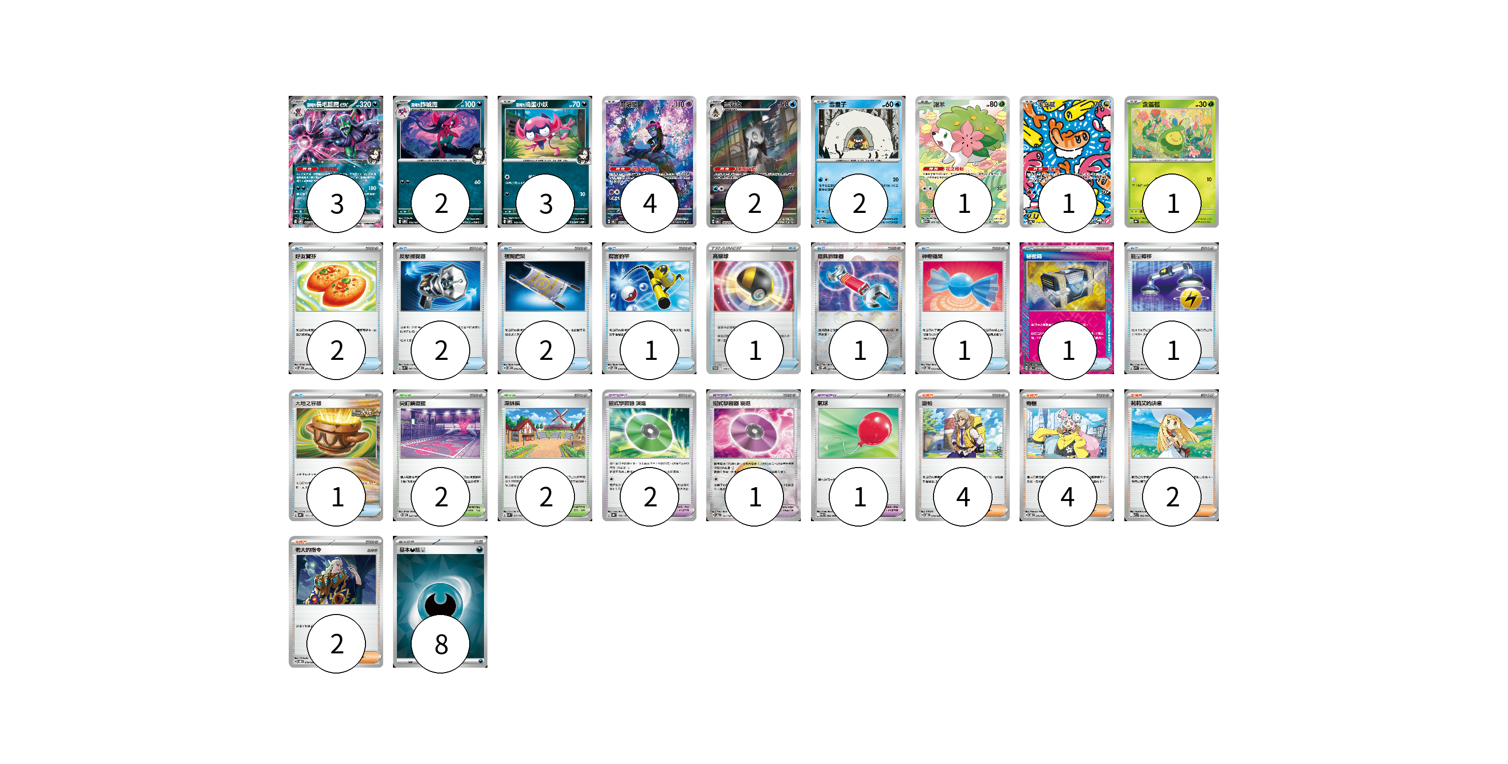 牌組構築方案 以此牌組為基礎新構築牌組 顯示卡面 顯示列表 寶可夢卡(19) 3 2 3 4 2 2 1 1 1 寶可夢道具(4) 2 1 1 物品卡(13) 2 2 2 1 1 1 1 1 1 1 支援者卡(12) 4 4 2 2 競技場卡(4) 2 2 能量卡(8) 8 寶可夢卡(19) 卡牌名稱 張數 卡牌名稱 張數 <瑪俐的>長毛巨魔ex SVOM 007/021 03 <瑪俐的>詐唬魔 SVOM 006/021 02 <瑪俐的>搗蛋小妖 SVOM 005/021 03 願增猿 SV6 107/101 04 雪妖女 SV6 104/101 02 雪童子 SV6 031/101 02 謝米 SV9a 066/063 01 米立龍 SV6 112/101 01 含羞苞 SV8a 001/187 01 寶可夢道具(4) 卡牌名稱 張數 卡牌名稱 張數 招式學習器 演進 SV8a 160/187 02 招式學習器 衰退 SV8a 161/187 01 氣球 SV11B 082/086 01 物品卡(13) 卡牌名稱 張數 卡牌名稱 張數 好友寶芬 SVOD 011/020 02 反擊捕捉器 SVK 009/042 02 夜間擔架 SVOM 016/021 02 厲害釣竿 SVOD 010/020 01 高級球 S-P 148/S-P 01 道具拆除器 SV11W 080/086 01 神奇糖果 SVOD 013/020 01 秘密箱 SV6 092/101 01 能量轉移 SVK 008/042 01 大地之容器 SV8a 143/187 01 支援者卡(12) 卡牌名稱 張數 卡牌名稱 張數 派帕 SVOD 018/020 04 奇樹 SVOD 016/020 04 莉莉艾的決意 M1L 062/063 02 老大的指令 SVOD 019/020 02 競技場卡(4) 卡牌名稱 張數 卡牌名稱 張數 尖釘鎮道館 SVOM 021/021 02 深缽鎮 SVK 039/042 02 能量卡(8) 卡牌名稱 張數 卡牌名稱 張數 基本【惡】能量 SVOM DAR 08 以此牌組為基礎新構築牌組 牌組編碼 lTvZmd-LNFOyl-fNuvzl copy 列印牌組單 牌組編碼已複製 分享至SNS
