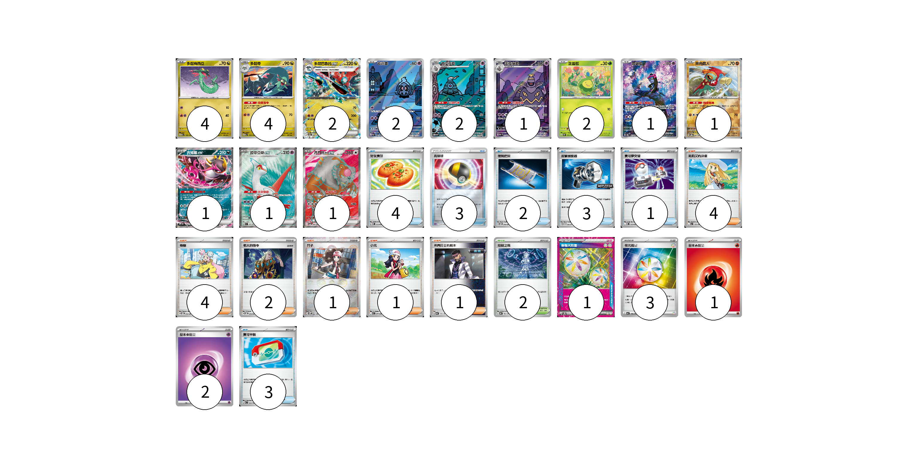 牌組構築方案 以此牌組為基礎新構築牌組 顯示卡面 顯示列表 寶可夢卡(22) 4 4 2 2 2 1 2 1 1 1 1 1 物品卡(16) 4 3 2 3 1 3 支援者卡(13) 4 4 2 1 1 1 競技場卡(2) 2 能量卡(7) 1 3 1 2 寶可夢卡(22) 卡牌名稱 張數 卡牌名稱 張數 多龍梅西亞 M2a 132/193 04 多龍奇 M2a 133/193 04 多龍巴魯托ex SV6 081/101 02 夜巡靈 SV6a 068/064 02 彷徨夜靈 SV6a 069/064 02 黑夜魔靈 SV6a 070/064 01 含羞苞 SV8a 001/187 02 願增猿 SV6 107/101 01 摔角鷹人 SV8a 084/187 01 吉雉雞ex SV8a 104/187 01 拉帝亞斯ex SV7a 078/064 01 月月熊 赫月 ex SV5a 084/066 01 物品卡(16) 卡牌名稱 張數 卡牌名稱 張數 好友寶芬 MBD 013/022 04 高級球 SPD 010/020 03 夜間擔架 SVOM 016/021 02 反擊捕捉器 SV-P 136/SV-P 03 寶可夢交替 MBG 015/022 01 寶可平板 MC 662/742 03 支援者卡(13) 卡牌名稱 張數 卡牌名稱 張數 莉莉艾的決意 M2a 175/193 04 奇樹 SVOD 016/020 04 老大的指令 SVOD 019/020 02 鬥子 SV11W 085/086 01 小光 M2 077/080 01 弗圖博士的劇本 SV8a 175/187 01 競技場卡(2) 卡牌名稱 張數 卡牌名稱 張數 阻礙之塔 SV8a 181/187 02 能量卡(7) 卡牌名稱 張數 卡牌名稱 張數 新衝天能量 SV5K 071/071 01 夜光能量 SV4a 190/190 03 基本【火】能量 SVTL FIR 01 基本【超】能量 SVTS PSY 02 以此牌組為基礎新構築牌組 牌組編碼 lUjWZM-ccPxqS-sVaIvr copy 列印牌組單 牌組編碼已複製 分享至SNS