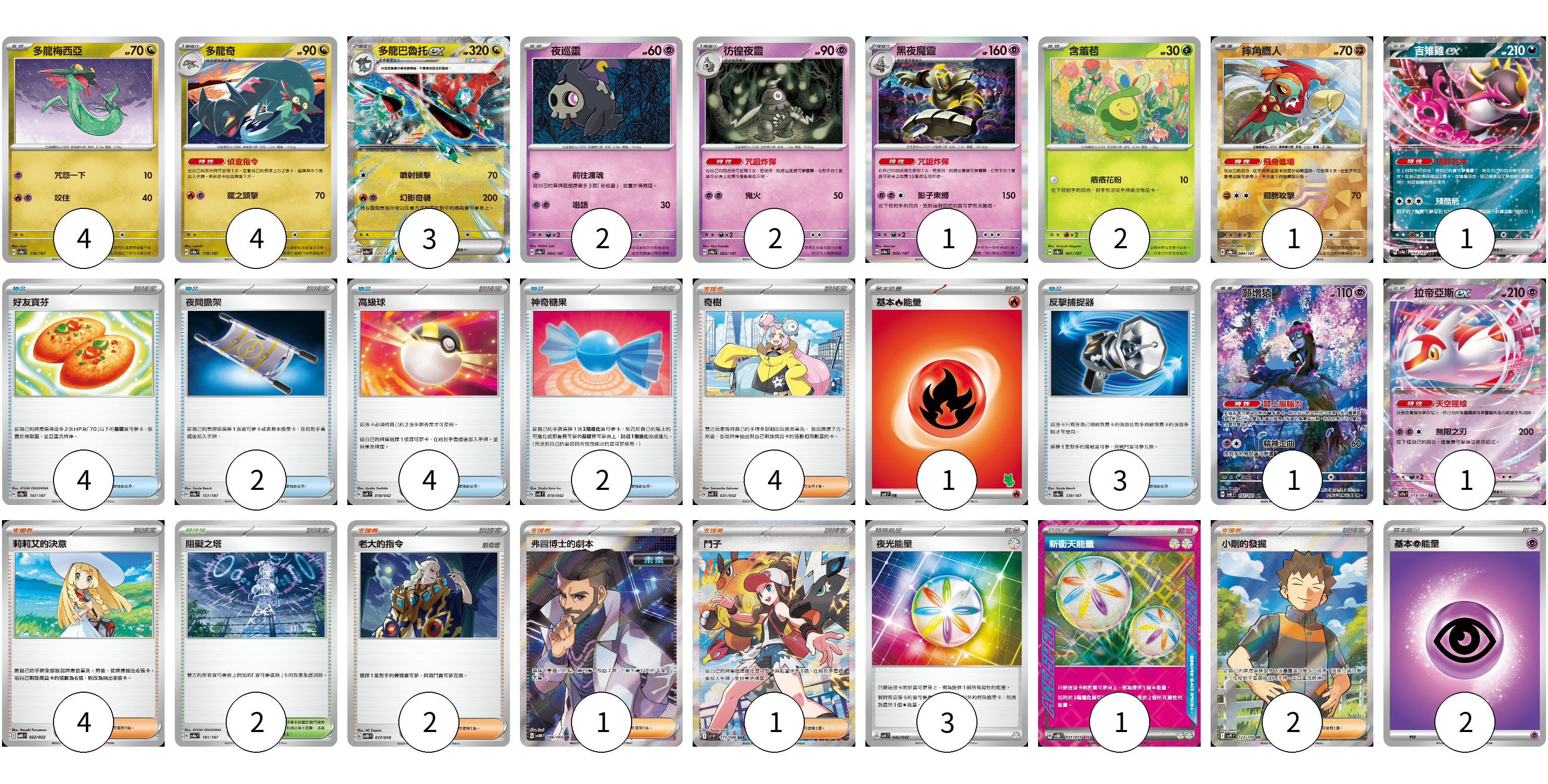 牌組構築方案 以此牌組為基礎新構築牌組 顯示卡面 顯示列表 寶可夢卡(22) 4 4 3 2 2 1 2 1 1 1 1 物品卡(15) 4 2 4 2 3 支援者卡(14) 4 4 2 1 1 2 競技場卡(2) 2 能量卡(7) 1 3 1 2 寶可夢卡(22) 卡牌名稱 張數 卡牌名稱 張數 多龍梅西亞 SV8a 118/187 04 多龍奇 SV8a 119/187 04 多龍巴魯托ex SV8a 120/187 03 夜巡靈 SV8a 064/187 02 彷徨夜靈 SV8a 065/187 02 黑夜魔靈 SV8a 066/187 01 含羞苞 SV8a 001/187 02 摔角鷹人 SV8a 084/187 01 吉雉雞ex SV8a 104/187 01 願增猿 SV6 107/101 01 拉帝亞斯ex SV7a 019/064 01 物品卡(15) 卡牌名稱 張數 卡牌名稱 張數 好友寶芬 SV8a 147/187 04 夜間擔架 SV8a 151/187 02 高級球 SVK 018/042 04 神奇糖果 SVK 019/042 02 反擊捕捉器 SV8a 139/187 03 支援者卡(14) 卡牌名稱 張數 卡牌名稱 張數 奇樹 SVK 031/042 04 莉莉艾的決意 MBG 022/022 04 老大的指令 SVTH 017/018 02 弗圖博士的劇本 SV4M 086/066 01 鬥子 SV11W 173/086 01 小剛的發掘 SV9 123/100 02 競技場卡(2) 卡牌名稱 張數 卡牌名稱 張數 阻礙之塔 SV8a 181/187 02 能量卡(7) 卡牌名稱 張數 卡牌名稱 張數 基本【火】能量 SVI FIR 01 夜光能量 SVK 042/042 03 新衝天能量 SV5K 071/071 01 基本【超】能量 M-P PSY 02 以此牌組為基礎新構築牌組 牌組編碼 lazpaI-kvokmU-rASiQn copy 列印牌組單 牌組編碼已複製 分享至SNS