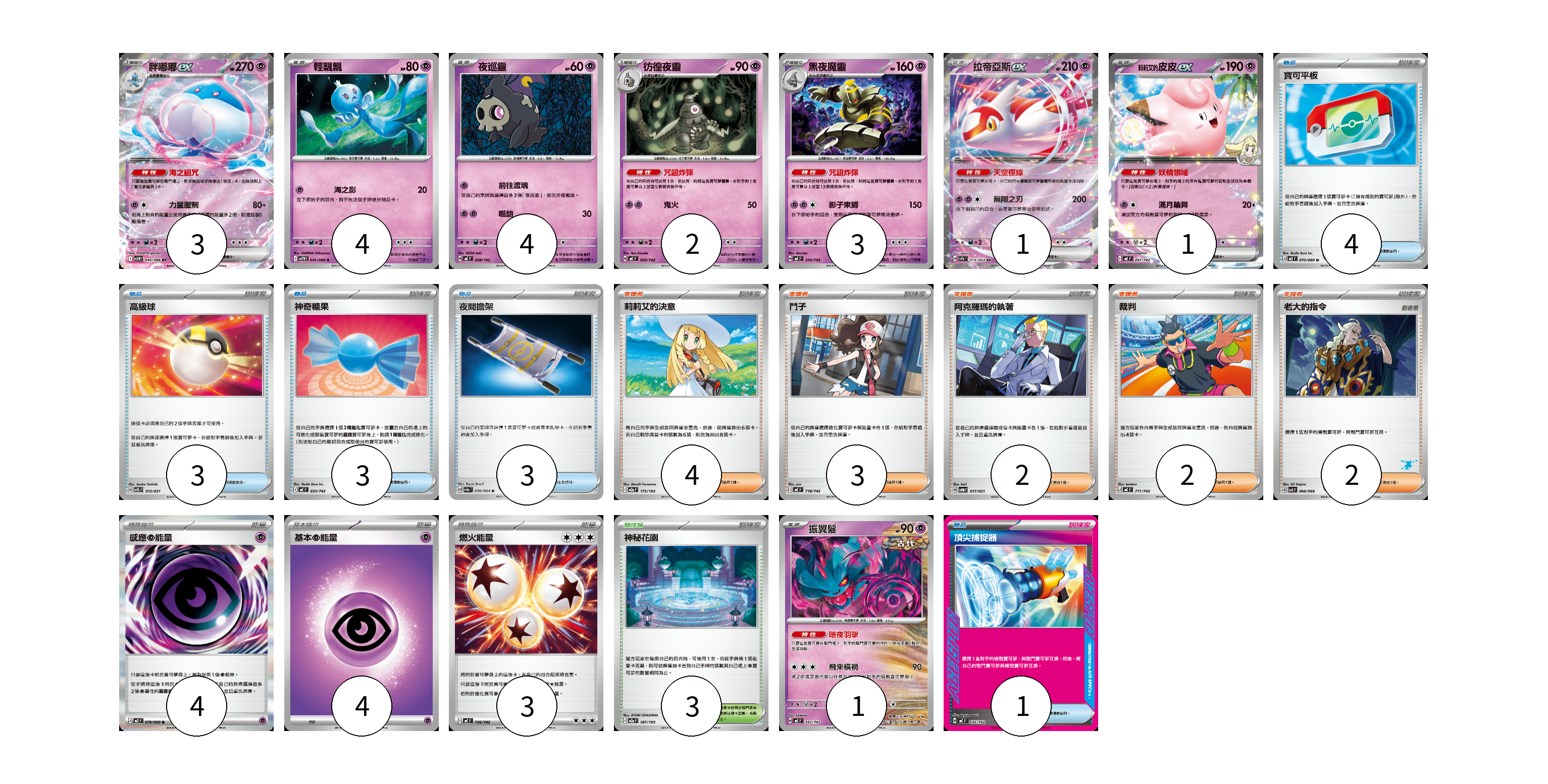 牌組構築方案 以此牌組為基礎新構築牌組 顯示卡面 顯示列表 寶可夢卡(19) 3 4 4 2 3 1 1 1 物品卡(14) 4 3 3 3 1 支援者卡(13) 4 3 2 2 2 競技場卡(3) 3 能量卡(11) 4 4 3 寶可夢卡(19) 卡牌名稱 張數 卡牌名稱 張數 胖嘟嘟ex SV11W 042/086 03 輕飄飄 SV11W 041/086 04 夜巡靈 MC 308/742 04 彷徨夜靈 MC 309/742 02 黑夜魔靈 MC 310/742 03 拉帝亞斯ex SV7a 019/064 01 莉莉艾的皮皮ex MC 287/742 01 振翼髮 MC 355/742 01 物品卡(14) 卡牌名稱 張數 卡牌名稱 張數 寶可平板 M3 070/080 04 高級球 SVTL 012/021 03 神奇糖果 MC 655/742 03 夜間擔架 SV6a 056/064 03 頂尖捕捉器 MC 656/742 01 支援者卡(13) 卡牌名稱 張數 卡牌名稱 張數 莉莉艾的決意 M2a 175/193 04 鬥子 MC 718/742 03 阿克羅瑪的執著 SVOM 017/021 02 裁判 MC 711/742 02 老大的指令 SVI 066/066 02 競技場卡(3) 卡牌名稱 張數 卡牌名稱 張數 神秘花園 M2a 187/193 03 能量卡(11) 卡牌名稱 張數 卡牌名稱 張數 感應【超】能量 M3 079/080 04 基本【超】能量 MC PSY 04 燃火能量 MC 736/742 03 以此牌組為基礎新構築牌組 牌組編碼 lfpvai-zehQwD-XzDqAz copy 列印牌組單 牌組編碼已複製 分享至SNS