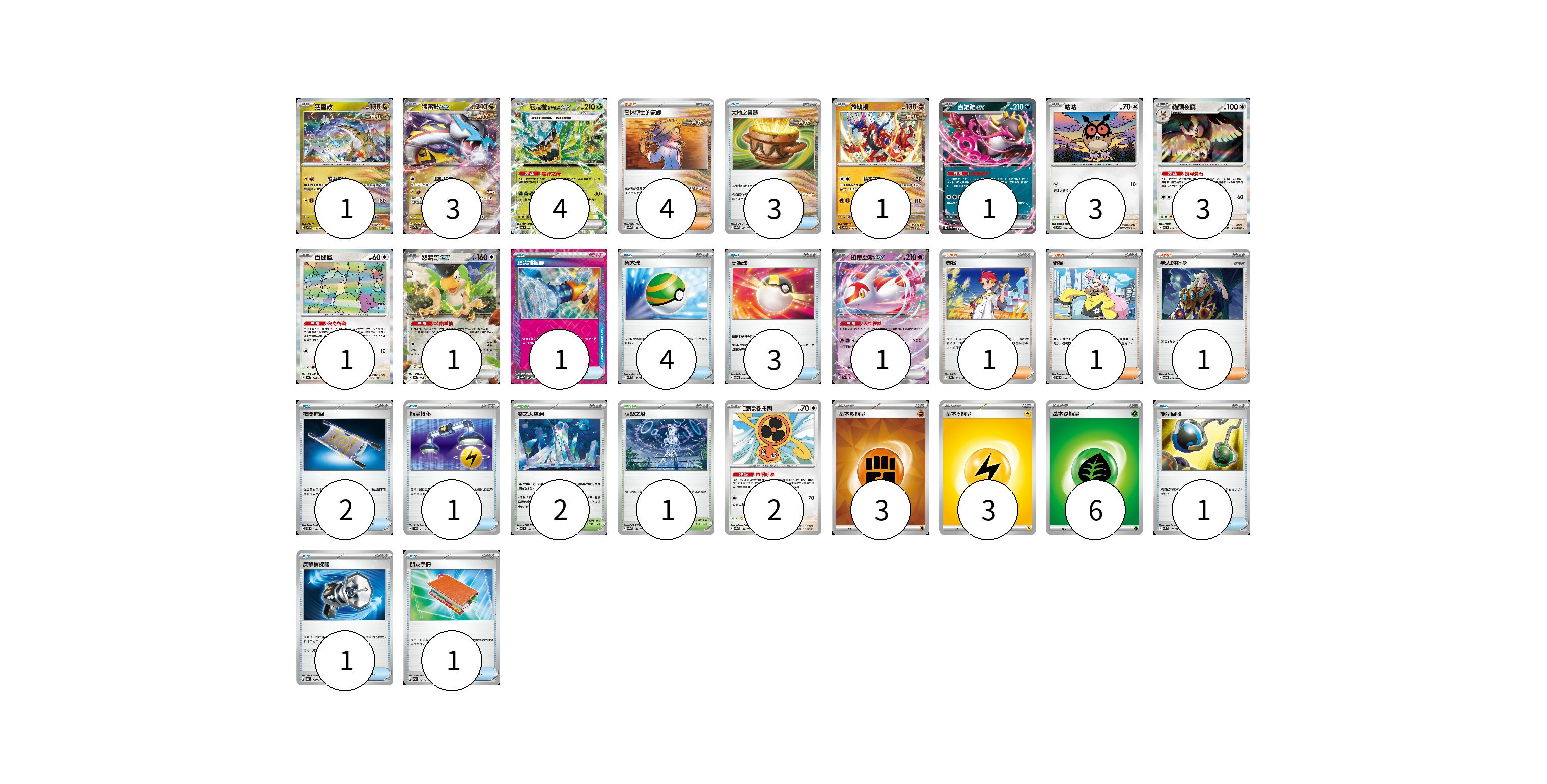 牌組構築方案 以此牌組為基礎新構築牌組 顯示卡面 顯示列表 寶可夢卡(21) 1 3 4 1 1 3 3 1 1 1 2 物品卡(17) 3 1 4 3 2 1 1 1 1 支援者卡(7) 4 1 1 1 競技場卡(3) 2 1 能量卡(12) 3 3 6 寶可夢卡(21) 卡牌名稱 張數 卡牌名稱 張數 猛雷鼓 SV7 075/102 01 猛雷鼓ex SV5K 053/071 03 厄鬼椪 碧草面具ex SV6 016/101 04 故勒頓 SV8 069/106 01 吉雉雞ex SVOD 004/020 01 咕咕 SV7 076/102 03 貓頭夜鷹 SV7 077/102 03 百變怪 SV4a 144/190 01 怒鸚哥ex SV4a 154/190 01 拉帝亞斯ex SV7a 019/064 01 旋轉洛托姆 SV8a 131/187 02 物品卡(17) 卡牌名稱 張數 卡牌名稱 張數 大地之容器 SV8a 143/187 03 頂尖捕捉器 SV8a 148/187 01 巢穴球 SVM 133/175 04 高級球 SVOD 012/020 03 夜間擔架 SVOM 016/021 02 能量轉移 SVD 111/139 01 能量回收 SVM 125/175 01 反擊捕捉器 SV8a 139/187 01 朋友手冊 SVK 014/042 01 支援者卡(7) 卡牌名稱 張數 卡牌名稱 張數 奧琳博士的氣魄 SV8a 167/187 04 赤松 SV8a 163/187 01 奇樹 SVOD 016/020 01 老大的指令 SVOD 019/020 01 競技場卡(3) 卡牌名稱 張數 卡牌名稱 張數 零之大空洞 SV7 102/102 02 阻礙之塔 SV8a 181/187 01 能量卡(12) 卡牌名稱 張數 卡牌名稱 張數 基本【鬥】能量 SVK FIG 03 基本【雷】能量 SVHM LIG 03 基本【草】能量 SVF GRA 06 以此牌組為基礎新構築牌組 牌組編碼 lgNsAF-CRyttT-KJksQV copy 列印牌組單 牌組編碼已複製 分享至SNS