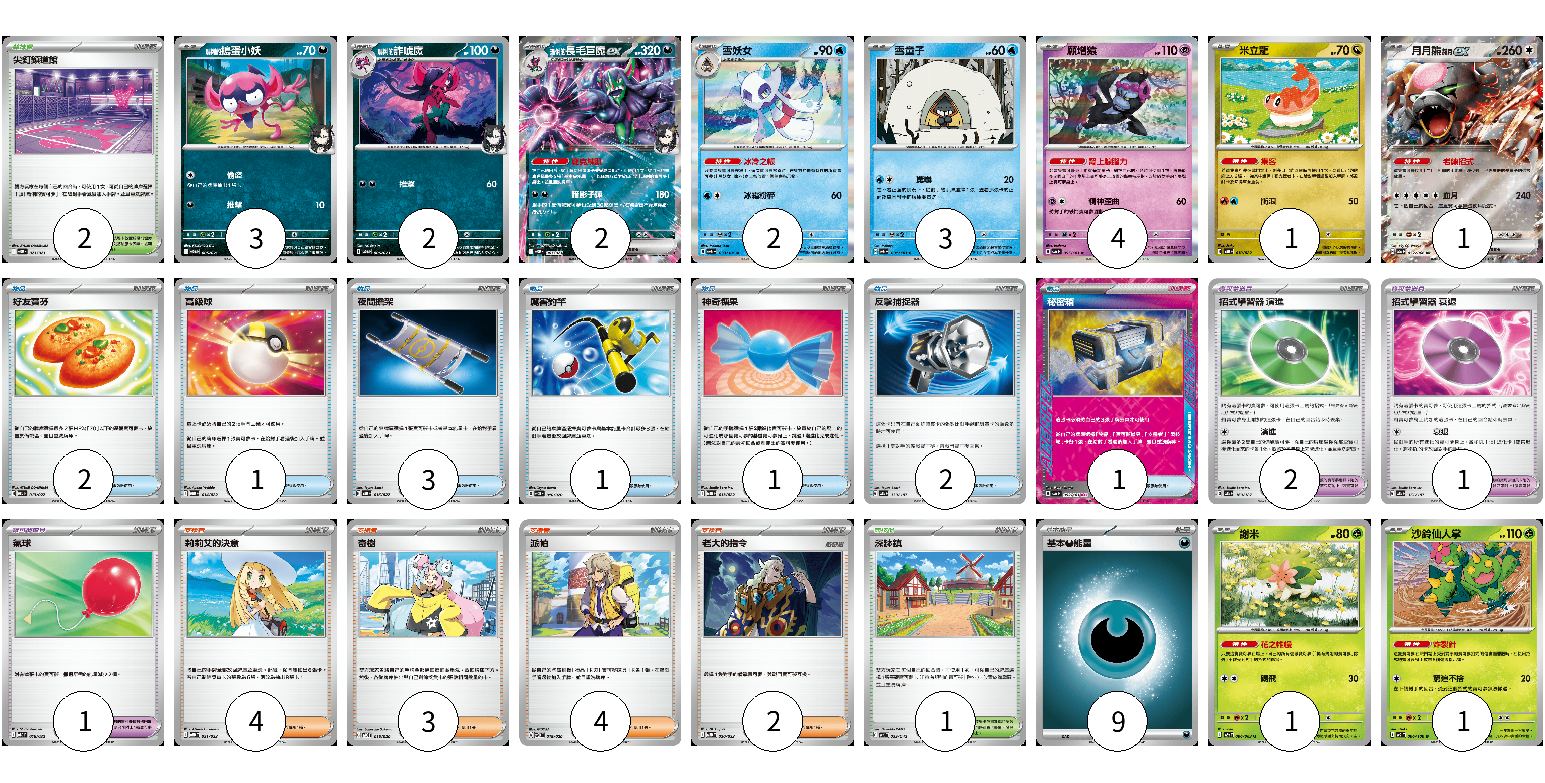 牌組構築方案 以此牌組為基礎新構築牌組 顯示卡面 顯示列表 寶可夢卡(20) 3 2 2 2 3 4 1 1 1 1 寶可夢道具(3) 2 1 物品卡(12) 2 1 3 1 1 2 1 1 支援者卡(13) 4 3 4 2 競技場卡(3) 2 1 能量卡(9) 9 寶可夢卡(20) 卡牌名稱 張數 卡牌名稱 張數 <瑪俐的>搗蛋小妖 SVOM 005/021 03 <瑪俐的>詐唬魔 SVOM 006/021 02 <瑪俐的>長毛巨魔ex SVOM 007/021 02 雪妖女 SV6 033/101 02 雪童子 SV6 031/101 03 願增猿 SV6 055/101 04 米立龍 MBD 010/022 01 月月熊 赫月 ex SV5a 052/066 01 謝米 SV9a 006/063 01 沙鈴仙人掌 SV9 006/100 01 寶可夢道具(3) 卡牌名稱 張數 卡牌名稱 張數 招式學習器 演進 SV8a 160/187 02 招式學習器 衰退 SV8a 161/187 01 物品卡(12) 卡牌名稱 張數 卡牌名稱 張數 好友寶芬 MBD 013/022 02 高級球 MBD 014/022 01 夜間擔架 MBD 016/022 03 厲害釣竿 SVOD 010/020 01 神奇糖果 MBG 013/022 01 反擊捕捉器 SV8a 139/187 02 秘密箱 SV6 092/101 01 氣球 MBD 018/022 01 支援者卡(13) 卡牌名稱 張數 卡牌名稱 張數 莉莉艾的決意 MBD 021/022 04 奇樹 SVOD 016/020 03 派帕 SVOD 018/020 04 老大的指令 MBD 020/022 02 競技場卡(3) 卡牌名稱 張數 卡牌名稱 張數 尖釘鎮道館 SVOM 021/021 02 深缽鎮 SVK 039/042 01 能量卡(9) 卡牌名稱 張數 卡牌名稱 張數 基本【惡】能量 MBG DAR 09 以此牌組為基礎新構築牌組 牌組編碼 lgNtCS-eKVZos-rKjdKN copy 列印牌組單 牌組編碼已複製 分享至SNS