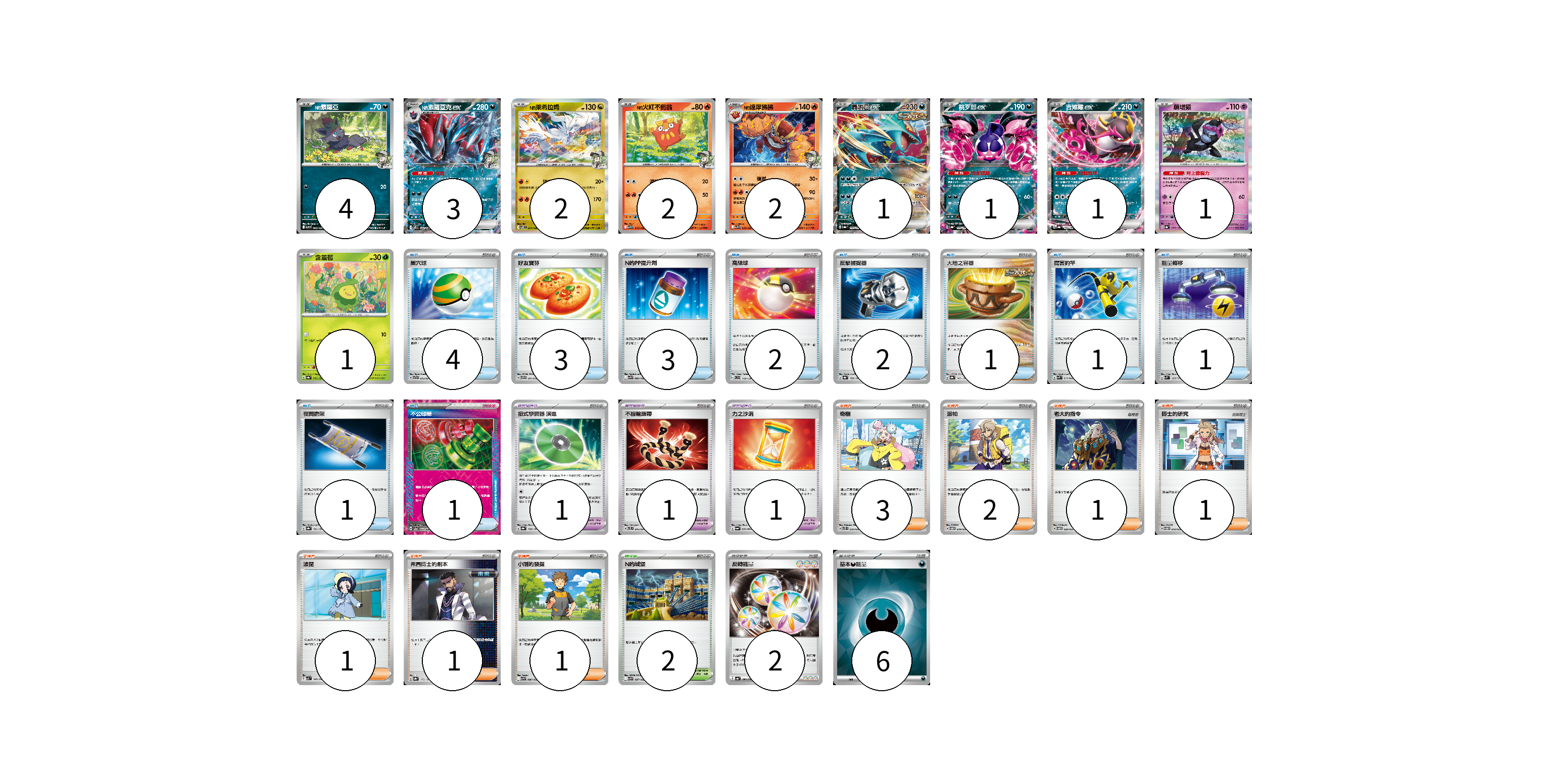 牌組構築方案 以此牌組為基礎新構築牌組 顯示卡面 顯示列表 寶可夢卡(18) 4 3 2 2 2 1 1 1 1 1 寶可夢道具(3) 1 1 1 物品卡(19) 4 3 3 2 2 1 1 1 1 1 支援者卡(10) 3 2 1 1 1 1 1 競技場卡(2) 2 能量卡(8) 2 6 寶可夢卡(18) 卡牌名稱 張數 卡牌名稱 張數 N的索羅亞 SV9 060/100 04 N的索羅亞克ex SV9 061/100 03 N的萊希拉姆 SV9 074/100 02 N的火紅不倒翁 SV9 015/100 02 N的達摩狒狒 SV9 016/100 02 轟鳴月ex SV8a 101/187 01 桃歹郎ex SV8a 105/187 01 吉雉雞ex SV8a 104/187 01 願增猿 SV8a 075/187 01 含羞苞 SV8a 001/187 01 寶可夢道具(3) 卡牌名稱 張數 卡牌名稱 張數 招式學習器 演進 SV8a 160/187 01 不服輸頭帶 SVTL 016/021 01 力之沙漏 SV6a 058/064 01 物品卡(19) 卡牌名稱 張數 卡牌名稱 張數 巢穴球 SVTR 013/021 04 好友寶芬 SVTG 011/019 03 N的PP提升劑 SV9 089/100 03 高級球 SVD 119/139 02 反擊捕捉器 SV8a 139/187 02 大地之容器 SV8a 143/187 01 厲害釣竿 SVK 011/042 01 能量轉移 SVM 127/175 01 夜間擔架 SV8a 151/187 01 不公印章 SV5a 053/066 01 支援者卡(10) 卡牌名稱 張數 卡牌名稱 張數 奇樹 SVTS 018/022 03 派帕 SVTM 019/022 02 老大的指令 SVTM 020/022 01 博士的研究 SVTM 018/022 01 波琵 SV3 105/108 01 弗圖博士的劇本 SV8a 175/187 01 小剛的發掘 SV9 096/100 01 競技場卡(2) 卡牌名稱 張數 卡牌名稱 張數 N的城堡 SV9 097/100 02 能量卡(8) 卡牌名稱 張數 卡牌名稱 張數 反轉能量 SV4a 189/190 02 基本【惡】能量 SVK DAR 06 以此牌組為基礎新構築牌組 牌組編碼 lkXiSc-cnYHlQ-tHlBcB copy 列印牌組單 牌組編碼已複製 分享至SNS