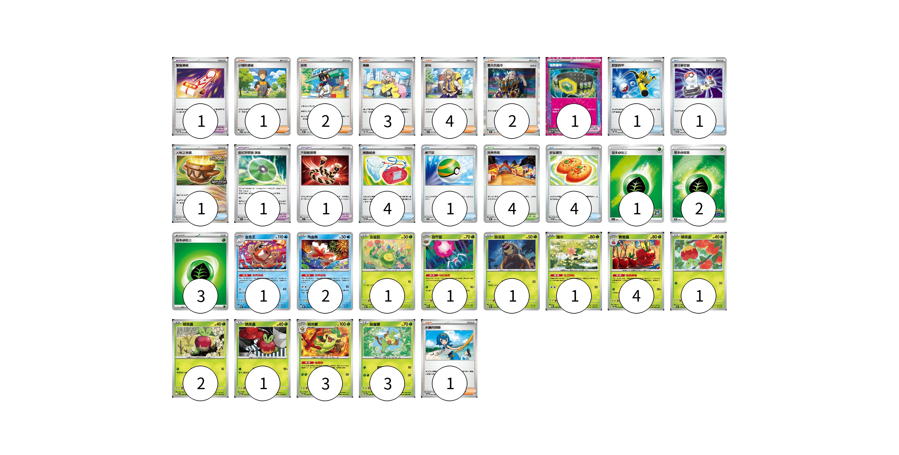 牌組構築方案 以此牌組為基礎新構築牌組 顯示卡面 顯示列表 寶可夢卡(21) 1 2 1 1 1 1 4 1 2 1 3 3 寶可夢道具(4) 1 1 1 1 物品卡(12) 1 1 1 4 1 4 支援者卡(13) 1 2 3 4 2 1 競技場卡(4) 4 能量卡(6) 1 2 3 寶可夢卡(21) 卡牌名稱 張數 卡牌名稱 張數 金魚王 SV8a 029/187 01 角金魚 SV8a 028/187 02 含羞苞 SV8a 001/187 01 蟲甲聖 SV8a 014/187 01 蟲滾泥 SV8a 013/187 01 謝米 SV9a 006/063 01 裹蜜蟲 SV6 012/101 04 啃果蟲 SV8a 008/187 01 啃果蟲 SV9a 009/063 02 啃果蟲 SV6 011/101 01 啪咚猴 SV6 009/101 03 敲音猴 SV6 008/101 03 寶可夢道具(4) 卡牌名稱 張數 卡牌名稱 張數 緊急滑板 SVOD 015/020 01 極限腰帶 SV5K 066/071 01 招式學習器 演進 SVK 025/042 01 不服輸頭帶 SV1S 073/078 01 物品卡(12) 卡牌名稱 張數 卡牌名稱 張數 厲害釣竿 SVOD 010/020 01 寶可夢交替 SVTS 016/022 01 大地之容器 SV-P 137/SV-P 01 捕蟲組合 SV6 094/101 04 巢穴球 SVD 118/139 01 好友寶芬 SVTS 012/022 04 支援者卡(13) 卡牌名稱 張數 卡牌名稱 張數 小剛的發掘 SV9 096/100 01 烏栗 SV8a 169/187 02 奇樹 SVOM 018/021 03 派帕 SVK 035/042 04 老大的指令 SV4a 181/190 02 水蓮的照顧 SV5a 064/066 01 競技場卡(4) 卡牌名稱 張數 卡牌名稱 張數 祭典會場 SV8a 180/187 04 能量卡(6) 卡牌名稱 張數 卡牌名稱 張數 基本草能量 S8a GRA 01 基本草能量 S10b GRA 02 基本草能量 sv-p GRA 03 以此牌組為基礎新構築牌組 牌組編碼 lkaKiD-hlBnDt-OkIiPb copy 列印牌組單 牌組編碼已複製 分享至SNS