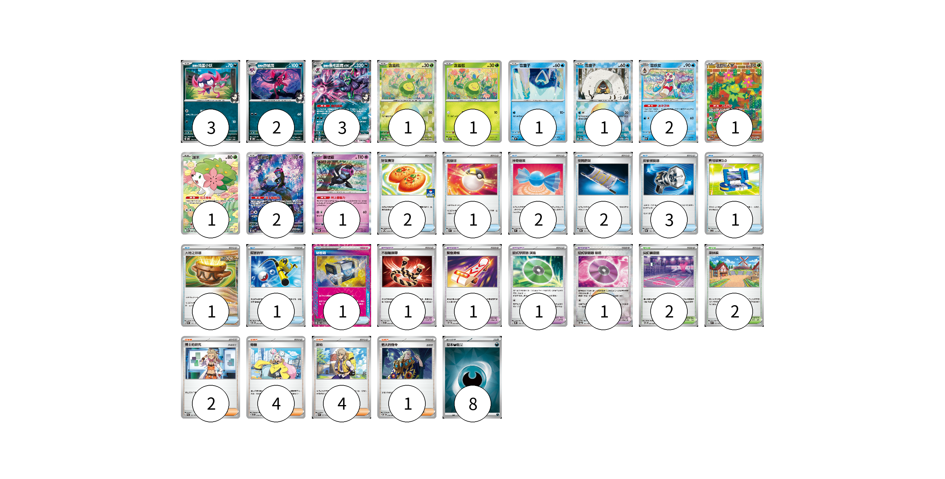 牌組構築方案 以此牌組為基礎新構築牌組 顯示卡面 顯示列表 寶可夢卡(19) 3 2 3 1 1 1 1 2 1 1 2 1 寶可夢道具(8) 1 1 1 1 4 物品卡(14) 2 1 2 2 3 1 1 1 1 支援者卡(7) 2 4 1 競技場卡(4) 2 2 能量卡(8) 8 寶可夢卡(19) 卡牌名稱 張數 卡牌名稱 張數 <瑪俐的>搗蛋小妖 SVOM 005/021 03 <瑪俐的>詐唬魔 SVOM 006/021 02 <瑪俐的>長毛巨魔ex SVOM 007/021 03 含羞苞 SV8a 001/187 01 含羞苞 SV8a 001/187 01 雪童子 SV3a 005/062 01 雪童子 SV8a 037/187 01 雪妖女 SV8a 038/187 02 沙鈴仙人掌 SV9 101/100 01 謝米 SV9a 066/063 01 願增猿 SV6 107/101 02 願增猿 SV8a 075/187 01 寶可夢道具(8) 卡牌名稱 張數 卡牌名稱 張數 不服輸頭帶 SVTL 016/021 01 緊急滑板 SVOD 015/020 01 招式學習器 演進 SV8a 160/187 01 招式學習器 衰退 SV8a 161/187 01 奇樹 SVTL 018/021 04 物品卡(14) 卡牌名稱 張數 卡牌名稱 張數 好友寶芬 SV-P 212/SV-P 02 高級球 SVM 134/175 01 神奇糖果 SVM 135/175 02 夜間擔架 SV8a 151/187 02 反擊捕捉器 SV8a 139/187 03 寶可裝置3.0 SVC 015/021 01 大地之容器 SV8a 143/187 01 厲害釣竿 SVOM 011/021 01 秘密箱 SV6 092/101 01 支援者卡(7) 卡牌名稱 張數 卡牌名稱 張數 博士的研究(奧琳博士) SVAM 023/023 02 派帕 SVK 035/042 04 老大的指令 SVOD 019/020 01 競技場卡(4) 卡牌名稱 張數 卡牌名稱 張數 尖釘鎮道館 SVOM 021/021 02 深缽鎮 SVK 039/042 02 能量卡(8) 卡牌名稱 張數 卡牌名稱 張數 基本【惡】能量 SVOM DAR 08 以此牌組為基礎新構築牌組 牌組編碼 lntzhA-QBOGKA-thUWaq copy 列印牌組單 牌組編碼已複製 分享至SNS