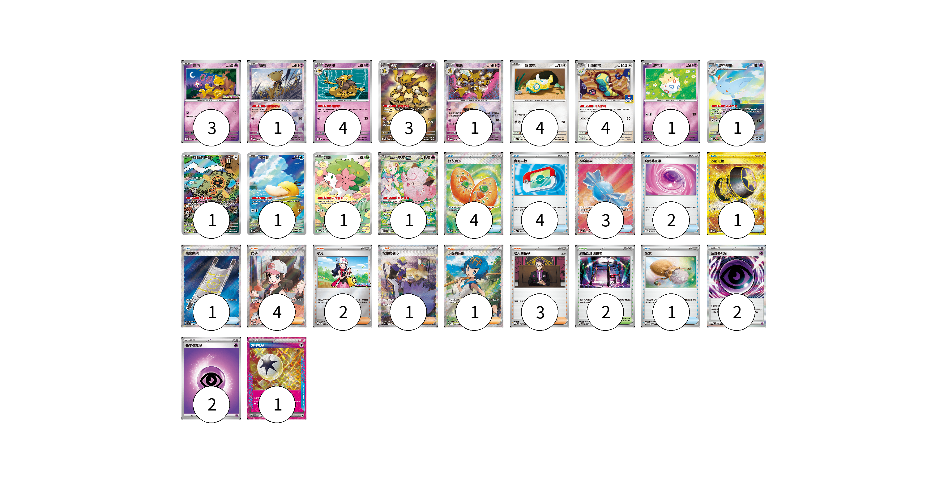 牌組構築方案 以此牌組為基礎新構築牌組 顯示卡面 顯示列表 寶可夢卡(26) 3 1 4 3 1 4 4 1 1 1 1 1 1 物品卡(16) 4 4 3 2 1 1 1 支援者卡(11) 4 2 1 1 3 競技場卡(2) 2 能量卡(5) 2 2 1 寶可夢卡(26) 卡牌名稱 張數 卡牌名稱 張數 凱西 M-P 004/M-P 03 凱西 SV8a 057/187 01 勇基拉 M1S 037/063 04 胡地 M1S 071/063 03 胡地 SV8a 059/187 01 土龍弟弟 MC 574/742 04 土龍節節 M-P 045/M-P 04 波克比 M2a 064/193 01 波克基斯 M2a 203/193 01 旋轉洛托姆 M2a 213/193 01 可達鴨 M2a 199/193 01 謝米 SV9a 066/063 01 莉莉艾的皮皮ex SV9 126/100 01 物品卡(16) 卡牌名稱 張數 卡牌名稱 張數 好友寶芬 M1S 081/063 04 寶可平板 M3 070/080 04 神奇糖果 M1S 082/063 03 奇跡修正檔 MBD 017/022 02 改造之錘 SV6 132/101 01 夜間擔架 M1L 083/063 01 聖灰 SV9a 056/063 01 支援者卡(11) 卡牌名稱 張數 卡牌名稱 張數 鬥子 SV11W 166/086 04 小光 M-P 028/M-P 02 松葉的信心 SV5K 097/071 01 水蓮的照顧 SV5a 088/066 01 老大的指令 MC 724/742 03 競技場卡(2) 卡牌名稱 張數 卡牌名稱 張數 對戰圓形競技場 M2 079/080 02 能量卡(5) 卡牌名稱 張數 卡牌名稱 張數 感應【超】能量 M3 079/080 02 基本【超】能量 MC PSY 02 富裕能量 SV7a 064/064 01 以此牌組為基礎新構築牌組 牌組編碼 lpJnGZ-uvNnTe-JCUCIV copy 列印牌組單 牌組編碼已複製 分享至SNS