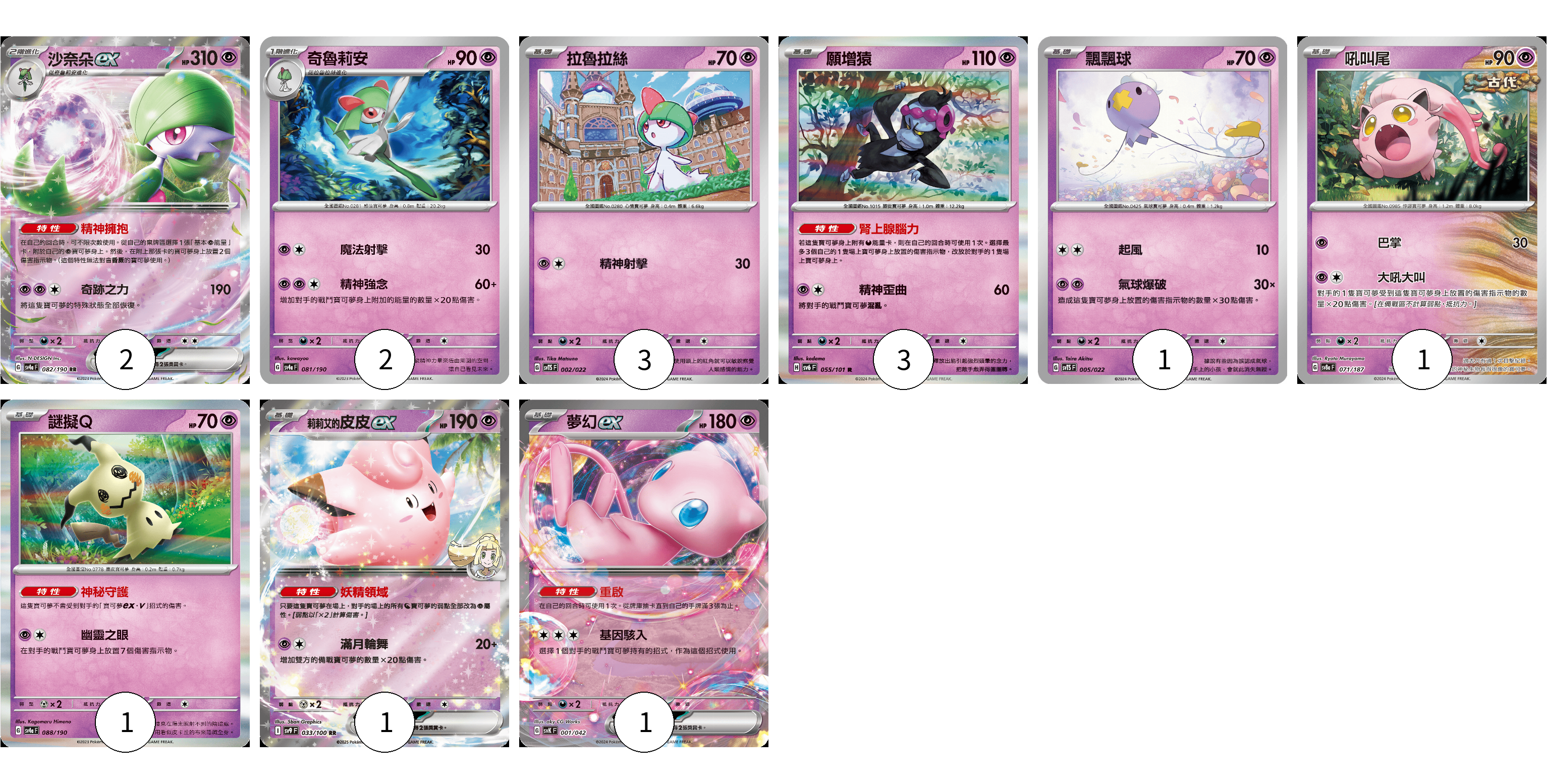 牌組構築方案 以此牌組為基礎新構築牌組 顯示卡面 顯示列表 寶可夢卡(15) 2 2 3 3 1 1 1 1 1 寶可夢卡(15) 卡牌名稱 張數 卡牌名稱 張數 沙奈朵ex SV4a 082/190 02 奇魯莉安 SV4a 081/190 02 拉魯拉絲 SVTS 002/022 03 願增猿 SV6 055/101 03 飄飄球 SVTS 005/022 01 吼叫尾 SV8a 071/187 01 謎擬Q SV4a 088/190 01 莉莉艾的皮皮ex SV9 033/100 01 夢幻ex SVK 001/042 01 以此牌組為基礎新構築牌組 牌組編碼 lrkScY-pnnatt-fRmMzk copy 列印牌組單 牌組編碼已複製 分享至SNS