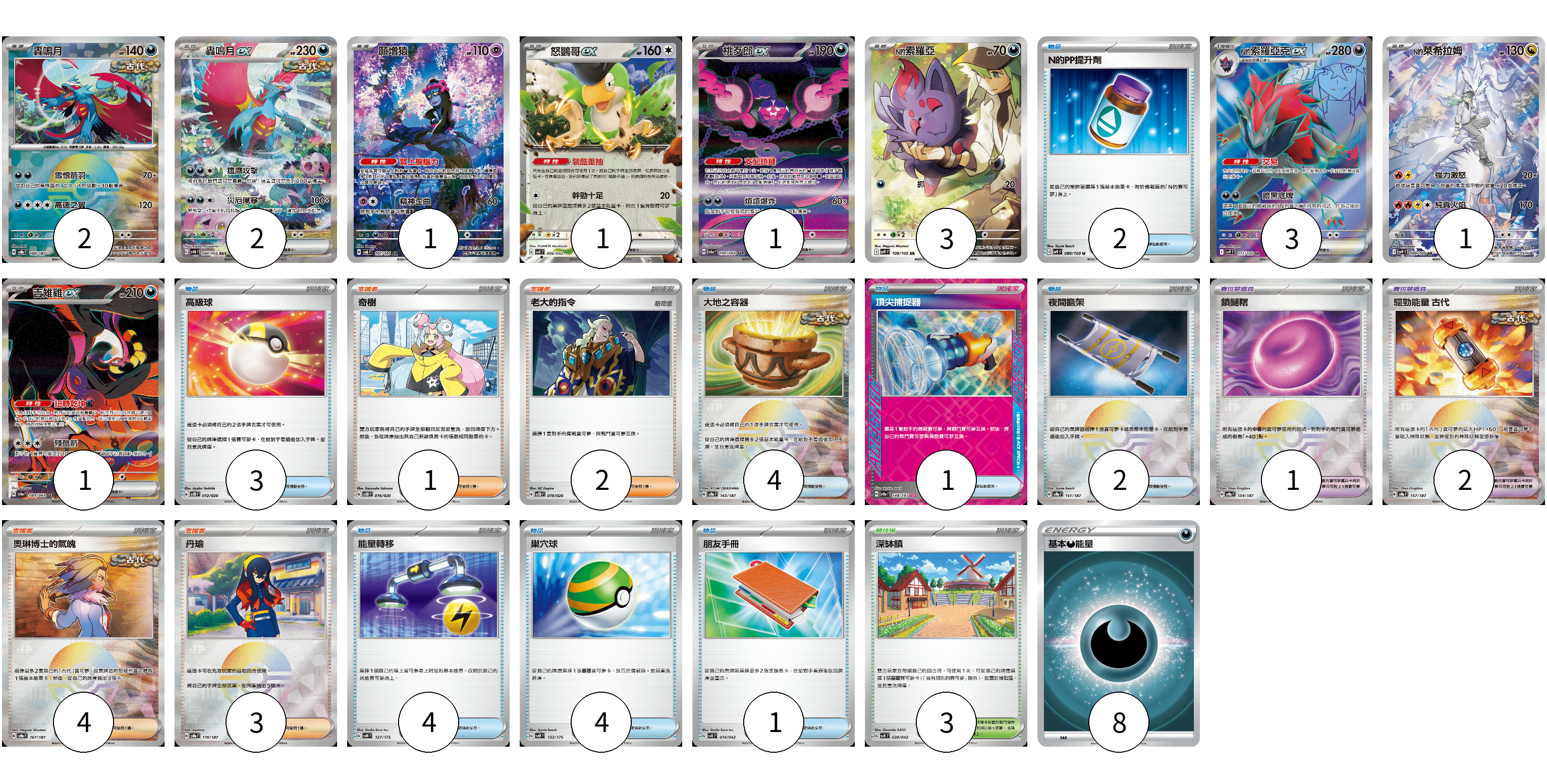 牌組構築方案 以此牌組為基礎新構築牌組 顯示卡面 顯示列表 寶可夢卡(15) 2 2 1 1 1 3 3 1 1 寶可夢道具(3) 1 2 物品卡(21) 2 3 4 1 2 4 4 1 支援者卡(10) 1 2 4 3 競技場卡(3) 3 能量卡(8) 8 寶可夢卡(15) 卡牌名稱 張數 卡牌名稱 張數 轟鳴月 SV8a 100/187 02 轟鳴月ex SV4K 090/066 02 願增猿 SV6 107/101 01 怒鸚哥ex SVK 006/042 01 桃歹郎ex SV6a 090/064 01 N的索羅亞 SV9 108/100 03 N的索羅亞克ex SV9 117/100 03 N的萊希拉姆 SV9 109/100 01 吉雉雞ex SV6a 089/064 01 寶可夢道具(3) 卡牌名稱 張數 卡牌名稱 張數 鎖鏈糬 SV8a 154/187 01 驅勁能量 古代 SV8a 157/187 02 物品卡(21) 卡牌名稱 張數 卡牌名稱 張數 N的PP提升劑 SV9 089/100 02 高級球 SVOD 012/020 03 大地之容器 SV8a 143/187 04 頂尖捕捉器 SV8a 148/187 01 夜間擔架 SV8a 151/187 02 能量轉移 SVM 127/175 04 巢穴球 SVM 133/175 04 朋友手冊 SVK 014/042 01 支援者卡(10) 卡牌名稱 張數 卡牌名稱 張數 奇樹 SVOD 016/020 01 老大的指令 SVOD 019/020 02 奧琳博士的氣魄 SV8a 167/187 04 丹瑜 SV8a 170/187 03 競技場卡(3) 卡牌名稱 張數 卡牌名稱 張數 深缽鎮 SVK 039/042 03 能量卡(8) 卡牌名稱 張數 卡牌名稱 張數 基本【惡】能量 SI DAR 08 以此牌組為基礎新構築牌組 牌組編碼 lvblbu-aTJskQ-eSFhVN copy 列印牌組單 牌組編碼已複製 分享至SNS