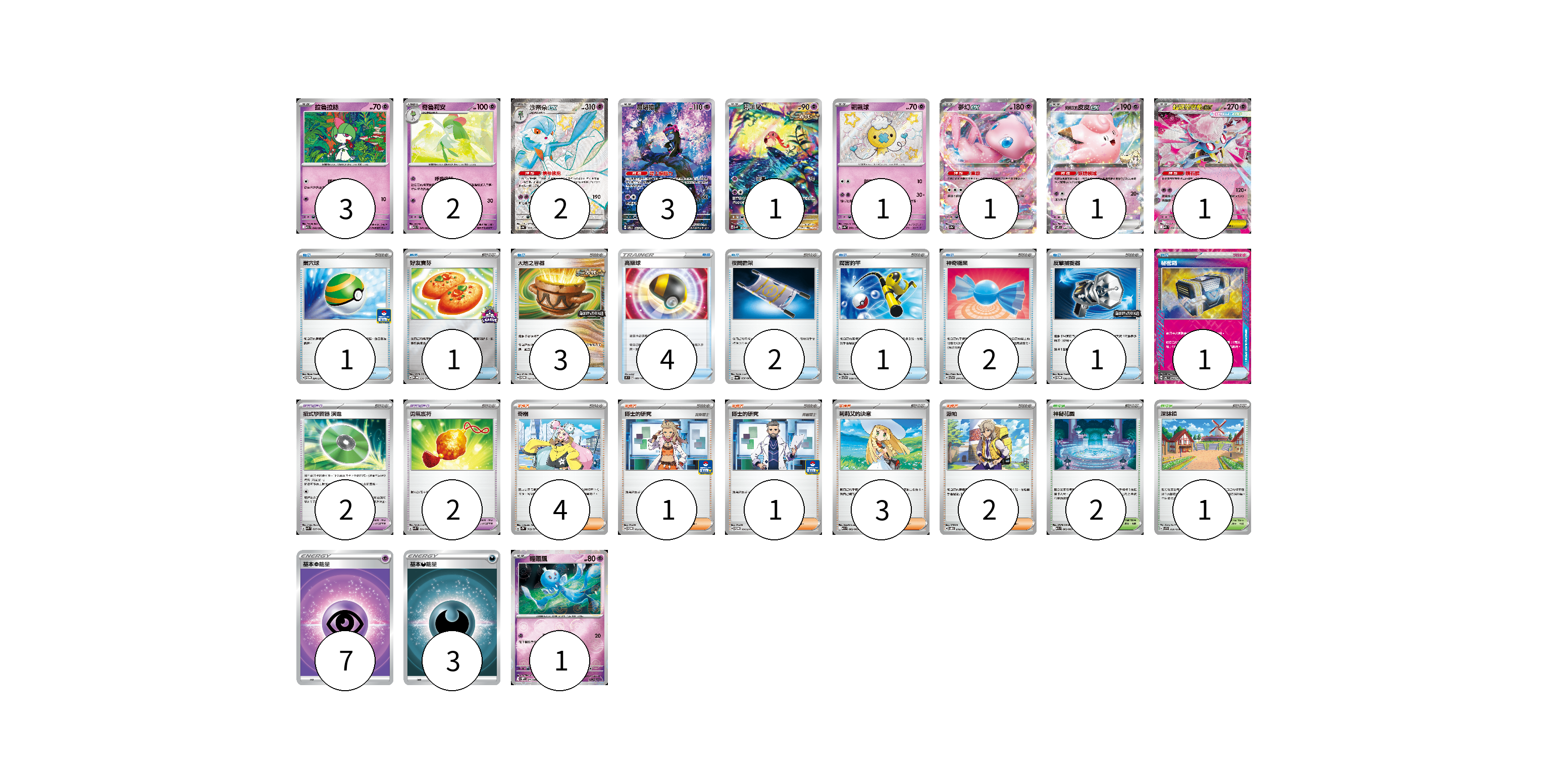 牌組構築方案 以此牌組為基礎新構築牌組 顯示卡面 顯示列表 寶可夢卡(16) 3 2 2 3 1 1 1 1 1 1 寶可夢道具(4) 2 2 物品卡(16) 1 1 3 4 2 1 2 1 1 支援者卡(11) 4 1 1 3 2 競技場卡(3) 2 1 能量卡(10) 7 3 寶可夢卡(16) 卡牌名稱 張數 卡牌名稱 張數 拉魯拉絲 M1S 040/063 03 奇魯莉安 M1S 041/063 02 沙奈朵ex SV4a 328/190 02 願增猿 SV6 107/101 03 吼叫尾 SV4K 071/066 01 飄飄球 SV4a 260/190 01 夢幻ex SV2a 151/165 01 莉莉艾的皮皮ex SV9 033/100 01 超級蒂安希ex MBD 006/022 01 輕飄飄 SV11W 041/086 01 寶可夢道具(4) 卡牌名稱 張數 卡牌名稱 張數 招式學習器 演進 SVK 025/042 02 勇氣護符 SVK 024/042 02 物品卡(16) 卡牌名稱 張數 卡牌名稱 張數 巢穴球 SV-P 091/SV-P 01 好友寶芬 SV-P 230/SV-P 01 大地之容器 SV-P 137/SV-P 03 高級球 S9 089/100 04 夜間擔架 SV6a 056/064 02 厲害釣竿 SVTG 009/019 01 神奇糖果 SVTG 014/019 02 反擊捕捉器 SV-P 136/SV-P 01 秘密箱 SV6 092/101 01 支援者卡(11) 卡牌名稱 張數 卡牌名稱 張數 奇樹 SV2D 069/071 04 博士的研究 SV-P 113/SV-P 01 博士的研究 SV-P 114/SV-P 01 莉莉艾的決意 M1L 062/063 03 派帕 SVOD 018/020 02 競技場卡(3) 卡牌名稱 張數 卡牌名稱 張數 神秘花園 M1S 063/063 02 深缽鎮 SVF 036/038 01 能量卡(10) 卡牌名稱 張數 卡牌名稱 張數 基本【超】能量 SI PSY 07 基本惡能量 SLD DAR 03 以此牌組為基礎新構築牌組 牌組編碼 lvyjeV-ynQPxu-psCTQu copy 列印牌組單 牌組編碼已複製 分享至SNS
