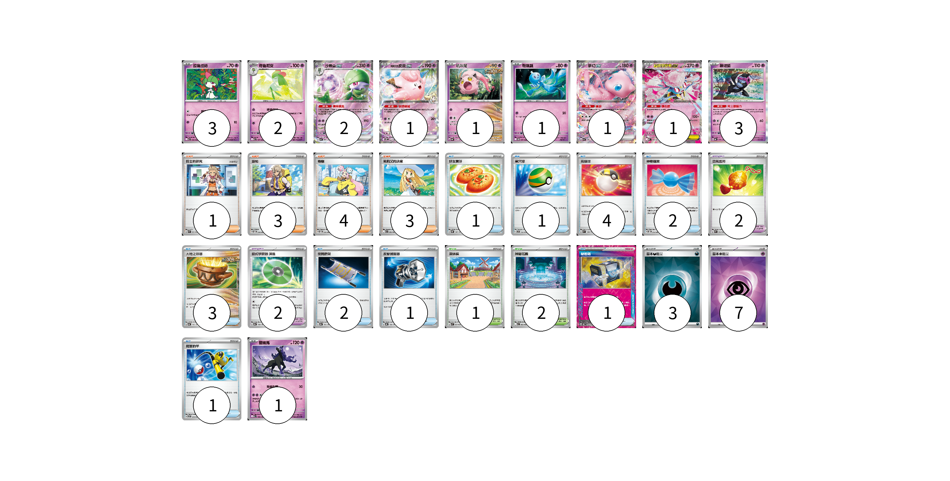 牌組構築方案 以此牌組為基礎新構築牌組 顯示卡面 顯示列表 寶可夢卡(16) 3 2 2 1 1 1 1 1 3 1 寶可夢道具(4) 2 2 物品卡(16) 1 1 4 2 3 2 1 1 1 支援者卡(11) 1 3 4 3 競技場卡(3) 1 2 能量卡(10) 3 7 寶可夢卡(16) 卡牌名稱 張數 卡牌名稱 張數 拉魯拉絲 M1S 040/063 03 奇魯莉安 M1S 041/063 02 沙奈朵ex SV4a 082/190 02 莉莉艾的皮皮ex SV9 033/100 01 吼叫尾 SV8a 071/187 01 輕飄飄 SV11W 041/086 01 夢幻ex SV4a 076/190 01 超級蒂安希ex MBD 006/022 01 願增猿 SV8a 075/187 03 靈幽馬 M2a 080/193 01 寶可夢道具(4) 卡牌名稱 張數 卡牌名稱 張數 勇氣護符 SVK 024/042 02 招式學習器 演進 SV8a 160/187 02 物品卡(16) 卡牌名稱 張數 卡牌名稱 張數 好友寶芬 SV8a 147/187 01 巢穴球 SVF 016/038 01 高級球 SVM 134/175 04 神奇糖果 SVOD 013/020 02 大地之容器 SV8a 143/187 03 夜間擔架 SV8a 151/187 02 反擊捕捉器 SV8a 139/187 01 秘密箱 SV6 092/101 01 厲害釣竿 SVTS 010/022 01 支援者卡(11) 卡牌名稱 張數 卡牌名稱 張數 博士的研究 SVK 032/042 01 派帕 SVOD 018/020 03 奇樹 SVOD 016/020 04 莉莉艾的決意 M1L 062/063 03 競技場卡(3) 卡牌名稱 張數 卡牌名稱 張數 深缽鎮 SVK 039/042 01 神秘花園 M1S 063/063 02 能量卡(10) 卡牌名稱 張數 卡牌名稱 張數 基本【惡】能量 SVOM DAR 03 基本【超】能量 SVOD PSY 07 以此牌組為基礎新構築牌組 牌組編碼 lxBbAc-ZZJIHo-ikPYQD copy 列印牌組單 牌組編碼已複製 分享至SNS