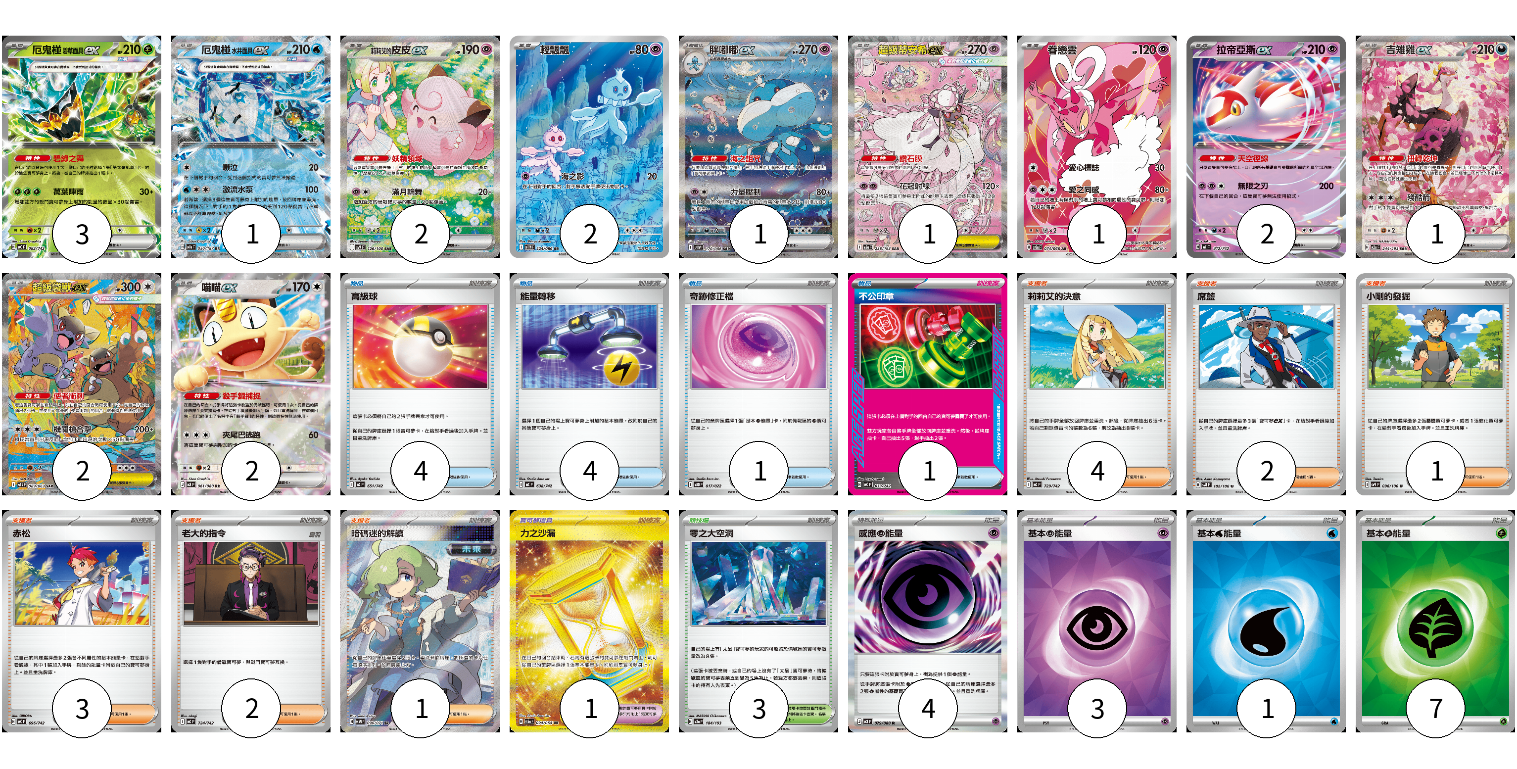 牌組構築方案 以此牌組為基礎新構築牌組 顯示卡面 顯示列表 寶可夢卡(18) 3 1 2 2 1 1 1 2 1 2 2 寶可夢道具(1) 1 物品卡(10) 4 4 1 1 支援者卡(13) 4 2 1 3 2 1 競技場卡(3) 3 能量卡(15) 4 3 1 7 寶可夢卡(18) 卡牌名稱 張數 卡牌名稱 張數 厄鬼椪 碧草面具ex MC 082/742 03 厄鬼椪 水井面具ex SV8a 050/187 01 莉莉艾的皮皮ex SV9 126/100 02 輕飄飄 SV11W 124/086 02 胖嘟嘟ex SV11W 170/086 01 超級蒂安希ex M2a 238/193 01 眷戀雲 SV5a 074/066 01 拉帝亞斯ex MC 312/742 02 吉雉雞ex M2a 244/193 01 超級袋獸ex M1S 089/063 02 喵喵ex M3 061/080 02 寶可夢道具(1) 卡牌名稱 張數 卡牌名稱 張數 力之沙漏 SV6a 094/064 01 物品卡(10) 卡牌名稱 張數 卡牌名稱 張數 高級球 MC 651/742 04 能量轉移 MC 638/742 04 奇跡修正檔 MBD 017/022 01 不公印章 MC 633/742 01 支援者卡(13) 卡牌名稱 張數 卡牌名稱 張數 莉莉艾的決意 MC 729/742 04 席藍 SV8 102/106 02 小剛的發掘 SV9 096/100 01 赤松 MC 696/742 03 老大的指令 MC 724/742 02 暗碼迷的解讀 SV5M 090/071 01 競技場卡(3) 卡牌名稱 張數 卡牌名稱 張數 零之大空洞 M2a 184/193 03 能量卡(15) 卡牌名稱 張數 卡牌名稱 張數 感應【超】能量 M3 079/080 04 基本【超】能量 SVOD PSY 03 基本【水】能量 SVM WAT 01 基本【草】能量 SVM GRA 07 以此牌組為基礎新構築牌組 牌組編碼 mAPMbg-hFOGjy-jERExk copy 列印牌組單 牌組編碼已複製 分享至SNS