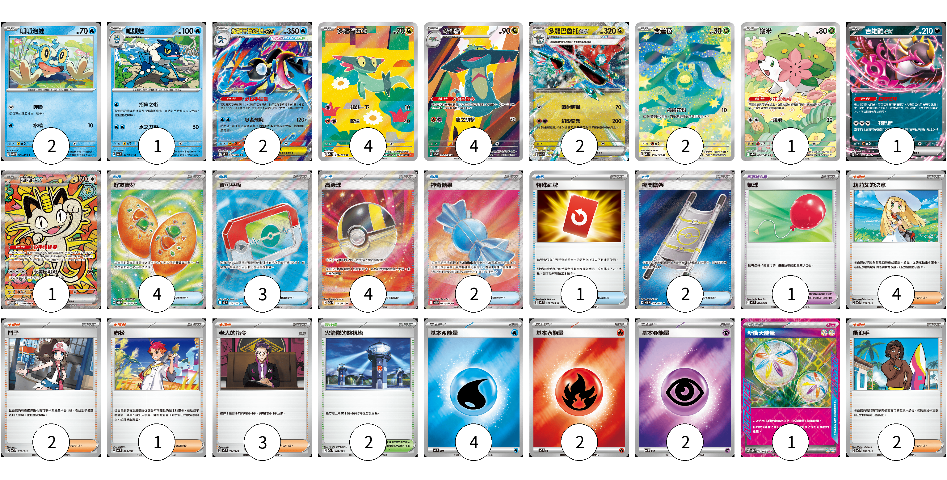 牌組構築方案 以此牌組為基礎新構築牌組 顯示卡面 顯示列表 寶可夢卡(20) 2 1 2 4 4 2 2 1 1 1 寶可夢道具(1) 1 物品卡(16) 4 3 4 2 1 2 支援者卡(12) 4 2 1 3 2 競技場卡(2) 2 能量卡(9) 4 2 2 1 寶可夢卡(20) 卡牌名稱 張數 卡牌名稱 張數 呱呱泡蛙 M4 020/083 02 呱頭蛙 M4 021/083 01 超級甲賀忍蛙ex M4 022/083 02 多龍梅西亞 M2a 211/193 04 多龍奇 M2a 212/193 04 多龍巴魯托ex SV8a 120/187 02 含羞苞 M2a 196/193 02 謝米 SV9a 066/063 01 吉雉雞ex MC 489/742 01 喵喵ex M3 114/080 01 寶可夢道具(1) 卡牌名稱 張數 卡牌名稱 張數 氣球 MC 688/742 01 物品卡(16) 卡牌名稱 張數 卡牌名稱 張數 好友寶芬 M1S 081/063 04 寶可平板 M3 103/080 03 高級球 M2a 216/193 04 神奇糖果 M1S 082/063 02 特殊紅牌 M4 072/083 01 夜間擔架 M1L 083/063 02 支援者卡(12) 卡牌名稱 張數 卡牌名稱 張數 莉莉艾的決意 MC 729/742 04 鬥子 MC 718/742 02 赤松 MC 696/742 01 老大的指令 MC 724/742 03 衝浪手 MC 708/742 02 競技場卡(2) 卡牌名稱 張數 卡牌名稱 張數 火箭隊的監視塔 M2a 189/193 02 能量卡(9) 卡牌名稱 張數 卡牌名稱 張數 基本【水】能量 MC WAT 04 基本【火】能量 MC FIR 02 基本【超】能量 MC PSY 02 新衝天能量 SV5K 071/071 01 以此牌組為基礎新構築牌組 牌組編碼 mAqxWe-FnRYpU-UrhQNQ copy 列印牌組單 牌組編碼已複製 分享至SNS